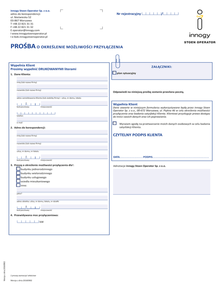 innogy Stoen Operator Sp. z o.o. adres do korespondencji: ul. Nieświeska 52 03-867 Warszawa T +48 22 821 31 31 F +48 22 821 31 32 E [email protected] I www.innogystoenoperator.pl I e-bok.innogystoenoperator.pl Nr rejestracyjny / PROŚBA O OKREŚLENIE MOŻLIWOŚCI PRZYŁĄCZENIA Wypełnia Klient Prosimy wypełnić DRUKOWANYMI literami plan sytuacyjny 1. Dane Klienta: imię (lub nazwa firmy) nazwisko (lub nazwa firmy) kod pocztowy miejscowość telefon e-mail Dane zawarte w niniejszym formularzu wykorzystywane będą przez innogy Stoen Operator Sp. z o.o., 00-672 Warszawa, ul. Piękna 46 w celu określenia możliwości przyłączenia oraz badania satysfakcji Klienta. Klientowi przysługuje prawo dostępu do treści swoich danych oraz ich poprawiania. Wyrażam zgodę na przetwarzanie moich danych osobowych w celu badania satysfakcji Klienta. nazwisko (lub nazwa firmy) ulica, nr domu, nr lokalu DATA. . . . . . . . . . . . . . . . . PODPIS. . . . . . . . . . . . . . . . . . . . . . . . . . . . . . . . . . . . . . . . . kod pocztowy miejscowość jakie? adres obiektu: ulica, nr domu, lokalu, nr działki kod pocztowy miejscowość 4. Przewidywana moc przyłączeniowa: Wersja z dnia 20160902 Wypełnia Klient CZYTELNY PODPIS KLIENTA imię (lub nazwa firmy) 3. Proszę o określenie możliwości przyłączenia dla1: budynku jednorodzinnego budynku wielorodzinnego budynku usługowego osiedla mieszkaniowego inne: Odpowiedź na niniejszą prośbę zostanie przesłana pocztą. adres zameldowania Klienta (lub siedziby firmy) – ulica, nr domu, lokalu 2. Adres do korespondencji: ZAŁĄCZNIKI: 1 proszę zaznaczyć właściwe Wersja z dnia 20160902 kW Adnotacje innogy Stoen Operator Sp. z o.o.