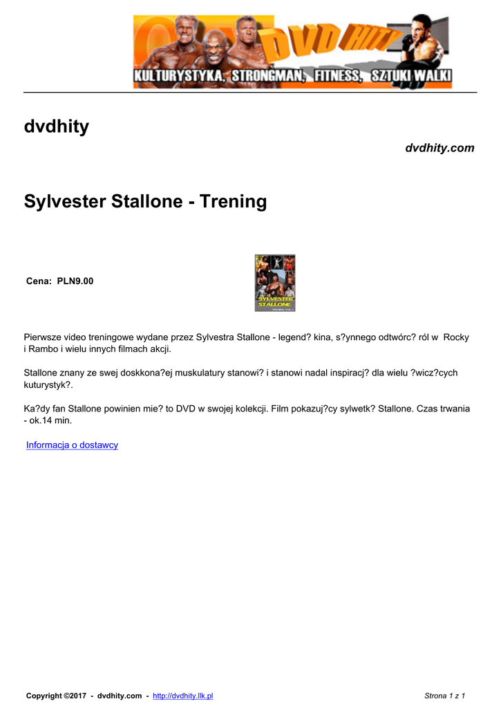 dvdhity dvdhity.com Sylvester Stallone - Trening Cena: PLN9.00 Pierwsze video treningowe wydane przez Sylvestra Stallone - legend? kina, s?ynnego odtwórc? ról w Rocky i Rambo i wielu innych filmach akcji. Stallone znany ze swej doskkona?ej muskulatury stanowi? i stanowi nadal inspiracj? dla wielu ?wicz?cych kuturystyk?. Ka?dy fan Stallone powinien mie? to DVD w swojej kolekcji. Film pokazuj?cy sylwetk? Stallone. Czas trwania - ok.14 min. Informacja o dostawcy Copyright ©2017 - dvdhity.com - http://dvdhity.llk.pl Strona 1 z 1