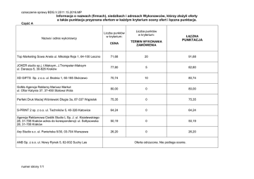 oznaczenie sprawy BDG.V.2511.15.2016.MP Informacja o nazwach (firmach), siedzibach i adresach Wykonawców, którzy złożyli oferty a także punktacja przyznana ofertom w każdym kryterium oceny ofert i łączna punktacja. Część A Nazwa i adres wykonawcy Liczba punktów w kryterium: Liczba punktów w kryterium: ŁĄCZNA PUNKTACJA CENA TERMIN WYKONANIA ZAMÓWIENIA Top Marketing Sowa Aneta ul. Mikołaja Reja 1, 64-100 Leszno 71,68 20 91,68 JOKER studio sp.j. t.Maksym, J.Trompeter-Maksym ul. Darasza 5, 30-826 Kraków 77,80 5 82,80 XD GIFTS Sp. z o.o. ul. Bratnia 1, 60-185 Skórzewo 70,74 10 80,74 GoMa Agencja Reklamy Mariusz Markut ul. Ofiar Katynia 37, 37-450 Stalowa Wola 80,00 0 80,00 Perfekt Druk Maciej Wiśniewski Długie 3a, 87-337 Wąpielsk 75,35 0 75,35 S-PRINT 2 sp. z o.o. ul. Techników 5, 40-326 Katowice 64,24 0 64,24 Agencja Reklamowa Cieślik Studio L Sp, J. ul. Kisielewskiego 28, 31-708 Kraków adres do korespondencji: ul. Sołtysowska 28, 31-708 Kraków 50,19 0 50,19 Arp Studio s.c. ul. Panieńska 5/30, 03-704 Warszawa 26,20 0 26,20 ANB Sp. z o.o. ul. Nowy Rynek 5, 62-002 Suchy Las numer strony 1/1 Oferta odrzucona. Nie podlega ocenie.