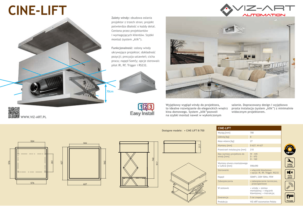 CINE-LIFT Zalety windy: obudowa osłania projektor z trzech stron; projekt potwierdza dbałość o każdy detal. Ceniona przez projektantów i wymagających klientów. Szybki montaż (system „klik”). Funkcjonalność: osłony windy ukrywające projektor; dokładność pozycji; precyzja ustawień; cicha praca; napęd Somfy; opcje sterowań: pilot IR, RF, Trigger i RS232. 70cm Wyjątkowy wygląd windy do projektora, to idealne rozwiązanie do eleganckich wnętrz kina domowego. System „klik”pozwoli na szybki montaż nawet w wykończonym WWW.VIZ-ART.PL Dostępne modele: •CINE-LIFT 8/700 524 217 742 917 562 627 351 576 576 20 562 salonie. Dopracowany design i wyjątkowo prosta instalacja (system „klik”) z minimalnie widocznym projektorem. CINE-LIFT Wysięg [mm] 700 Udźwig [kg] 8 Masa własna [kg] 27 Wymiary [mm] D 627; W 627 Przestrzeń instalacyjna [mm] 210 Max wymiary projektora do windy [mm] W - 445 D - 470 H - 160 Wymiary otworu montażowego w suficie [mm] 590x590 Sterowanie •włącznik klawiszowy •opcja: IR, RF, Trigger, RS232 Napęd SOMFY, 230V 50Hz; 95W Zabezpieczenia •zabezpieczenie termiczne, przeciążeniowe W zestawie • winda; • zestaw montażowy; • włącznik klawiszowy; • instrukcja; Gwarancja 5 lat (napęd) Produkcja VIZ-ART Automation Polska 627