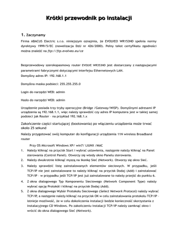 Krótki przewodnik po instalacji 1. Zaczynamy Firma ABACUS Electric s.r.o. niniejszym oznajmia, że EVOLVEO WR153ND spełnia normy dyrektywy 1999/5/EC (nowelizacja DzU nr 426/2000). Pełny tekst certyfikatu zgodności można znaleźć na ftp://ftp.evolveo.eu/ce Bezprzewodowy szerokopasmowy router EVOLVE WR353ND jest dostarczany z następujacymi parametrami fabrycznymi dotyczącymi interfejsu Ethernetowych LAN. Domyślny adres IP: 192.168.1.1 Domyślna maska podsieci: 255.255.255.0 Login do narzędzi WEB: admin Hasło do narzędzi WEB: admin Urządzenie posiada trzy tryby operacyjne (Bridge /Gateway/WISP). Domyślnymi adresami IP urządzenia są 192.168.1.1, więc należy sprawdzić czy adres IP komputera jest w takiej samej podsieci jak Router – na przykład 192.168.1.x Zakończenie części startującej (bootowania) po włączeniu urządzenia może trwać około 25 sekund Należy przygotować swój komputer do konfiguracji urządzenia 11N wireless Broadband router Przy OS Microsoft Windows XP/ win7/ LIUNX /MAC 1. Należy kliknąć na przycisk Start i wybrać ustawienia, następnie należy kliknąć na Panel sterowania (Control Panel). Otworzy się wtedy okno Panelu sterowania. 2. Należy dwukrotnie kliknąć myszą na ikonkę Sieć (Network). Otworzy się okno Sieć. 3. Należy sprawdzić listę zainstalowanych elementów sieciowych. W przypadku, jeśli TCP/IP nie jest zainstalowane to należy kliknąć na przycisk Dodaj (Add) i zainstalować TCP/IP – w przypadku jeśli TCP/IP jest już zainstalowane to należy przejść do punktu 6. 4. Z okna dialogowego Typ Komponentu Sieciowego (Network Component Type) należy wybrać opcję Protokół i kliknąć na przycisk Dodaj (Add). 5. Z okna dialogowego Wybór Protokołu Sieciowego (Select Network Protocol) należy wybrać TCP/IP, a następnie należy kliknąć na przycisk OK w celu zainstalowania protokołu TCP/IP – istnieje mozliwość, że w celu dokończenia instalacji bedzie konieczność skorzystania z instalacyjnego CD Windows. Po zakończeniu instalacji TCP/IP należy zamknąć okno i wrócić do okna dialogowego Sieć (Network). 6. Należy wybrać TCP/IP i w oknie dialogowym Sieć (Network) kliknąć na przycisk Właściwości. 7. Należy kliknąć na Użyj tego adresu IP (Specify an IP address) i wpisać wartości tak jak jest to pokazane na przykładzie. IP Adres: 192.168.1.1, (do podłączenia Bezprzewodowego punktu dostępowego - Wireless LAN Access Point – odpowiedni jest jakikolwiek adres IP w przedziale 192.168.1.2 - 192.168.1.254). Maska podsieci IP: 255.255.255.0 2. Ustawienie narzędzi web Do routera należy podłączyć się poprzez wpisanie http://192.168.1.1 do okna adresowego przeglądarki internetowej. Po chwili otworzy się okno logujące – podobne do tego na przykładzie. Do okna Nazwa użytkownika (User name) należy wpisać admin a do okna hasła (Password) również wpisać admin, w obydwóch przypadkach używając tylko mały ch liter. Następnie należy kliknąć na przycisk OK lub kliknąć na przycisk Login (Logowanie) Następnie otworzy się