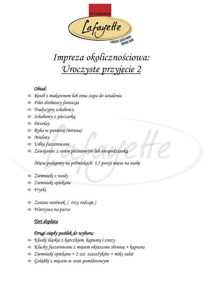 Impreza okolicznościowa: Uroczyste przyjęcie 2 • • • • • • • • • Obiad: Rosół z makaronem lub inna zupa do ustalenia Filet drobiowy fantazja Tradycyjny schabowy Schabowy z pieczarką Devolay Ryba w panierce (miruna) Mielony Udko faszerowane Zawijaniec z serem pleśniowym lub niespodzianką Mięsa podajemy na półmiskach: 1,5 porcji mięsa na osobę • Ziemniaki z wody • Ziemniaki opiekane • Frytki • Zestaw surówek ( trzy rodzaje ) • Warzywa na parze Tort dopłata • • • • Drugi ciepły posiłek do wyboru: Kluski śląskie z karczkiem, kapustą i zrazy Kluchy faszerowane z mięsem okraszone słoniną + kapusta Ziemniaki opiekane + 2 szt. szaszłyków + miks sałat Gołąbki z mięsem w sosie pomidorowym • • • Trzeci ciepły posiłek do wyboru: Barszczyk czerwony z pierożkami 2 sztuki lub krokietem 1 sztuka lub pasztecikami 4 sztuki Żurek z jajkiem i kiełbasą Flaki z pieczywem Zupa meksykańska • • • • • • • • • • • • • • Przystawki: 6 do wyboru Ryba po grecku na pół po żydowsku Patera mięs pieczystych Galantyna z kurczaka Schab nadziewany śliwką/morelą Schab w pieprzu Pieczony karczek Pasztet z żurawiną Tymbaliki mięsne z cytryną Jajka faszerowane z pieczarką na pół z łososiem Roladki z szynki z nadzieniem kremowo – chrzanowym z szparagą Wąsy drobiowe z dipem Sałatka grecka z serem feta Sałatka cesarska Sałatka jarzynowa • • • • Napoje: Kawa, herbata z cytryną bez ograniczeń Soki 0,6 litra na osobę Woda z cytryną bez ograniczeń • Ciasto domowe i owoce na paterach oraz pieczywo Cena: • 125zł osoba