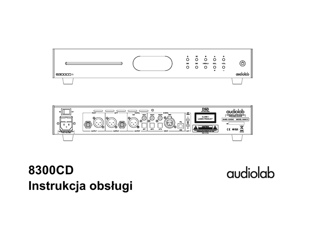 8300CD Instrukcja obsługi 1: Warunki bezpieczeństwa AVIS: RISQUE DE CHOC ELECTRIQUE-NE PAS OUVRIR WARNING: SHOCK HAZARD-DO NOT OPEN Symbol błyskawicy w trójkącie - zwróć uwagę na niebezpieczne napięcie w obudowie produktu, które może być źródłem zagrożenia porażenia prądem elektrycznym. UWAGA! Aby zmniejszyć ryzyko porażenia prądem, nie wolno zdejmować pokrywy urządzenia. Wewnątrz nie ma części możliwych do naprawy przez użytkownika. Naprawy winny być wykonywane przez wykwalifikowany personel. Wykrzyknik umieszczony wewnątrz trójkąta oznacza, że w dokumentacji załączonej do urządzenia są ważne informacje dotyczące jego użytkowania i konserwacji. Uważnie przeczytaj instrukcję obsługi. Zachowaj niniejszą instrukcję. Zwróć uwagę na wszelkie ostrzeżenia. Postępuj zgodnie z instrukcjami. Nie używaj urządzenia w pobliżu wody. Czyść wyłącznie przy użyciu suchej szmatki. Nie zakrywaj otworów wentylacyjnych urządzenia. Zainstaluj zgodnie ze wskazówkami producenta. Nie instalować w pobliżu źródeł ciepła, takich jak grzejniki, nagrzewnice, piece i inne urządzenia (w tym wzmacniacze) wytwarzających duże ilości ciepła. Nie podłączaj niezgodnie z przeznaczeniem wtyczek polaryzowanych i z uziemieniem. Polaryzowana wtyczka ma dwa wtyki – jeden szerszy i jeden węższy. Wtyczka z uziemieniem ma dwa wtyki i bolec uziemienia. Szeroki wtyk lub trzeci bolec spełnia rolę zabezpieczenia. . Jeżeli wtyczka nie pasuje do gniazdka, należy skontaktować się z elektrykiem w celu wymiany przestarzałego gniazdka. Przewód zasilania należy poprowadzić tak, aby nie był nadeptywany ani zaginany w szczególności przy wtyku.. Używaj wyłącznie z wózkiem, podstawą, trójnogiem, wspornikiem lub stolikiem określonym przez producenta lub sprzedawanym wraz z urządzeniem. W przypadku korzystania z wózka zachowaj ostrożność podczas przesuwania w celu zapobiegnięcia urazom wynikającym z przewrócenia się wózka z urządzeniem. W przypadku zbliżającej się burzy lub też przewidywanej dłuższej przerwy w użytkowaniu, należy odłączyć zasilanie. Nigdy nie próbować naprawiać urządzenia samodzielnie. W razie jakichkolwiek problemów skonsultować się z wykwalifikowanym specjalistą. Uszkodzenia wymagające naprawy to między innymi uszkodzony przewód lub gniazdo zasilania, do otworu urządzenia wpadł przedmiot lub na urządzenie został wylany płyn, urządzenie nie działa prawidłowo lub zostało upuszczone. Produkt może być zasilany wyłącznie ze źródła o parametrach wskazanych na tabliczce znamionowej. W razie wątpliwości co do typu instalacji w miejscu użytkowania należy zwrócić się do dystrybutora produktu lub lokalnego zakładu energetycznego. Bezpiecznik zasilania sieciowego na tylnym panelu urządzenia dostępny jest po usunięciu wtyczki sieciowej IEC. Przy wymianie bezpiecznika należy upewnić się, że posiada on odpowiednie parametry. Parametry bezpieczników: 220 – 240V (UK, Chiny, itp.) T4.0AL 250V długi czas działania 100 – 120V (USA, Japonia, itp.) T8.0AL 250V długi czas działania OSTRZEŻENIE: Aby uniknąć różnego rodzaju zagrożeń, należy stosować wyłącznie akcesoria dopuszczone przez producenta. Terminale oznaczone symbolem przenoszą bardzo wysokie napięcie elektryczne, wystarczające do stworzenia ryzyka porażenia prądem. Wszystkie instalacje lub modyfikacje powinny być wykonywane wyłącznie przez wykwalifikowany personel techniczny. UWAGA! Instrukcje na temat naprawy urządzenia przeznaczone są tylko do użytku wykwalifikowanego personelu serwisowego. Aby zmniejszyć ryzyko porażenia prądem, nie należy próbować naprawiać urządzenia we własnym zakresie i przeprowadzać operacji nieuwzględnionych w niniejszej instrukcji obsługi. Nie należy umieszczać urządzenia w zabudowanych instalacjach jeżeli nie została zapewniona odpowiednia wentylacja, ponieważ może to źle wpłynąć na cyrkulację powietrza. UWAGA! Nie należy używać w pobliżu wody i narażać na kontakt z wodą lub innymi płynami (np. w wyniku ochlapania). Na urządzeniu nie wolno umieszczać przedmiotów zawierających płyny (np. wazonów). Urządzenie klasy 2: oznacza, że urządzenie posiada podwójną izolację i nie musi być podłączane do przewodu ochronnego (uziemienia). 2: Wstęp • Automatyczny tryb gotowości. Gratulujemy zakupu nowego odtwarzacza CD Audiolab 8300CD. • Trzy poziomy jasności ekranu. 8300CD to najnowsza wersja klasycznego odtwarzacza Audiolab z przetwornikiem analogowo cyfrowym D A C . W sekcji DAC wykorzystany został znany 8-kanałowy chip ESS9018 będący także podstawą układu w wielokrotnie nagradzanym M-DAC. Teraz w nowym 8300CD przetwarza on wszystkie rozdzielczości plików nawet do najwyższych 384kHz/32-bit a dodatkowo także DSD256. • Połączenie trigger 12V. Wyjścia odtwarzacza 8300CD powinny być podłączone bezpośrednio do końcówki Dostępnych jest 7 różnych cyfrowych filtrów do wyboru pozwalających dostosować odtwarzany dźwięk do preferencji słuchacza. mocy. Jeśli we wzmacniaczu występuje regulacja gain należy ustawić ją na maksymalny poziom. Należy używać wyłącznie potencjometrów kontroli poziomu głośności w odtwarzaczu 8300CD. 8300CD nie jest zwykłym odtwarzaczem CD - to uniwersalny dekoder cyfrowy, który będzie służył przez lata. Życzyny miłego użytkowania! Jeśłi chcesz podłączyć wyjścia odtwarzacza 8300CD do przedwzmacniacza, możesz zablokować funkcję dostosowania poziomu głośności w odtwarzaczu. W tym trybie urządzenie funkcjonuje jak CD/DAC.. Prosimy o zapoznanie się z niniejszą instrukcją obsługi odtwarzacza 8300CD. Rozpakowanie Wejścia: Rozpakuj urządzenie. W zestawie powinno znajdować się: •Wejście na płyty CD. •Odtwarzacz płyt CD Audiolab 8300CD •Jedno zewnętrzne cyfrowe wejście SPDIF stereo LPCM AES3 •Przewód zasilajacy IEC. • Dwa zewnętrzne cyfrowe wej