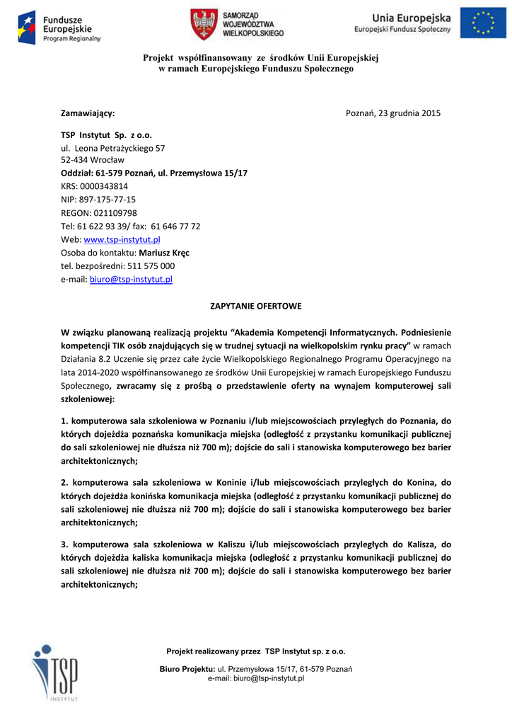 Projekt współfinansowany ze środków Unii Europejskiej w ramach Europejskiego Funduszu Społecznego Zamawiający: Poznań, 23 grudnia 2015 TSP Instytut Sp. z o.o. ul. Leona Petrażyckiego 57 52-434 Wrocław Oddział: 61-579 Poznań, ul. Przemysłowa 15/17 KRS: 0000343814 NIP: 897-175-77-15 REGON: 021109798 Tel: 61 622 93 39/ fax: 61 646 77 72 Web: www.tsp-instytut.pl Osoba do kontaktu: Mariusz Kręc tel. bezpośredni: 511 575 000 e-mail: [email protected] ZAPYTANIE OFERTOWE W związku planowaną realizacją projektu “Akademia Kompetencji Informatycznych. Podniesienie kompetencji TIK osób znajdujących się w trudnej sytuacji na wielkopolskim rynku pracy” w ramach Działania 8.2 Uczenie się przez całe życie Wielkopolskiego Regionalnego Programu Operacyjnego na lata 2014-2020 współfinansowanego ze środków Unii Europejskiej w ramach Europejskiego Funduszu Społecznego, zwracamy się z prośbą o przedstawienie oferty na wynajem komputerowej sali szkoleniowej: 1. komputerowa sala szkoleniowa w Poznaniu i/lub miejscowościach przyległych do Poznania, do których dojeżdża poznańska komunikacja miejska (odległość z przystanku komunikacji publicznej do sali szkoleniowej nie dłuższa niż 700 m); dojście do sali i stanowiska komputerowego bez barier architektonicznych; 2. komputerowa sala szkoleniowa w Koninie i/lub miejscowościach przyległych do Konina, do których dojeżdża konińska komunikacja miejska (odległość z przystanku komunikacji publicznej do sali szkoleniowej nie dłuższa niż 700 m); dojście do sali i stanowiska komputerowego bez barier architektonicznych; 3. komputerowa sala szkoleniowa w Kaliszu i/lub miejscowościach przyległych do Kalisza, do których dojeżdża kaliska komunikacja miejska (odległość z przystanku komunikacji publicznej do sali szkoleniowej nie dłuższa niż 700 m); dojście do sali i stanowiska komputerowego bez barier architektonicznych; Projekt realizowany przez TSP Instytut sp. z o.o. Biuro Projektu: ul. Przemysłowa 15/17, 61-579 Poznań e-mail: [email protected] Projekt współfinansowany ze środków Unii Europejskiej w ramach Europejskiego Funduszu Społecznego 4. komputerowa sala szkoleniowa w Lesznie i/lub miejscowościach przyległych do Leszna, do których dojeżdża leszczyńska komunikacja miejska (odległość z przystanku komunikacji publicznej do sali szkoleniowej nie dłuższa niż 700 m); dojście do sali i stanowiska komputerowego bez barier architektonicznych. Sala musi być wyposażona w co najmniej 13 stanowisk komputerowych (komputery z wejściem USB, myszką, z oprogramowaniem Office i dostępem do sprawnie działającego Internetu, tablicę typu flipchart/ścieralna wraz z wyposażeniem (papier, pisaki), rzutnik i ekran do prezentacji multimedialnych) do wykorzystania pod szkolenia z zakresu obsługi komputera, programowania oraz grafiki komputerowej. I. Tryb udzielenia zamówienia Zamówienie powyżej 50 tys. PLN netto udzielane jest zgodnie z zasadą konkurencyjności oraz nie podlega przepisom ustawy Prawo Zamówień Publicznych. Zamówienie stanowiące przedmiot niniejszego postępowania ujęte zostało w planowanej realizacji Projektu współfinansowanego przez Unię Europejską w ramach Europejskiego Funduszu Społecznego. Zamawiający jest na etapie aplikowania o dofinansowanie Projektu i zastrzega sobie prawo do unieważnienia postępowania oraz niepodpisania umowy z wybranym Wykonawcą, w przypadku nie uzyskania współfinansowania Projektu. II. Opis przedmiotu zamówienia 1. Przedmiotem Zapytania jest świadczenie usług na rzecz Zamawiającego w zakresie wynajmu komputerowej sali szkoleniowej wraz z wyposażeniem do zajęć praktycznych i teoretycznych wyposażonej w co najmniej 13 stanowisk komputerowych (komputery z wejściem USB, myszką, z oprogramowaniem Office i dostępem do sprawnie działającego Internetu, tablicę typu flip-chart/ścieralna wraz z wyposażeniem (papier, pisaki), rzutnik i ekran do prezentacji multimedialnych) do wykorzystania pod planowane poniższe szkolenia: Obsługi komputera - dla 8 grup po ok. 12 osób (łącznie 96 osób) + 2 wykładowców; czas trwania szkolenia to 60h na grupę (łącznie 480h); Programowania – dla 4 grup po ok. 12 osób (łącznie 48 osób) + wykładowca; czas trwania szkolenia to 120h na grupę (łącznie 480h). Projekt realizowany przez TSP Instytut sp. z o.o. Biuro Projektu: ul. Przemysłowa 15/17, 61-579 Poznań e-mail: [email protected] Projekt współfinansowany ze środków Unii Europejskiej w ramach Europejskiego Funduszu Społecznego Grafiki komputerowej – dla 4 grup po ok. 12 osób (łącznie 48 osób) + wykładowca; Czas trwania szkolenia to 80h na grupę (łącznie 320h). 2. Szkolenia będą realizowane w okresie od lutego 2016 do listopada 2016 wg harmonogramu oraz lokalizacji ustalonej przez Zamawiającego (który może obejmować dni robocze oraz weekendy, godziny przedpołudniowe i/lub popołudniowe). Harmonogram szkoleń uzależniony jest od miejsca zamieszkania uczestników szkoleń oraz ich preferencji dotyczących terminów szkoleniowych. 3. Komputerowa sala szkoleniowa musi znajdować się w Poznaniu lub Koninie lub Kaliszu lub Lesznie i/lub miejscowościach przyległych do tych miast, do których dojeżdża komunikacja miejska (odległość z przystanku komunikacji publicznej do sali szkoleniowej nie dłuższa niż 700 m); dojście do sali i stanowiska komputerowego bez barier architektonicznych. 4. Wykonawca zapewni również dla uczestników szkoleń dostęp w niewielkiej odległości do sanitariatów (toalety). 5. Uczestnikami szkoleń będą osoby dorosłe w wieku aktywności zawodowej w przedziale wiekowym 50-64 l (obsługa komputera) oraz wieku 24-64l (grafika komputerowa i programowanie) w szczególności o niskich kompetencjach/kwalifikacjach, zgłaszających z własnej inicjatywy potrzebę podniesienia kompetencji z maksymalnie średnim wykształceniem. 6. Celem planowanych szkoleń jest podniesienie kom