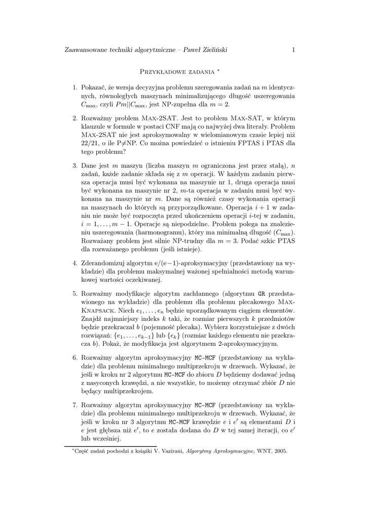 Część zadań pochodzi z książki V. Vazirani, Algorytmy Aproksymacyjne, WNT, 2005.
