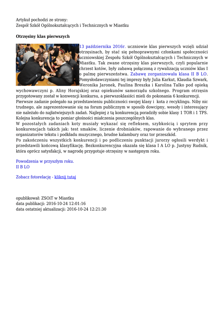 Artykuł pochodzi ze strony: Zespół Szkół Ogólnokształcących i Technicznych w Miastku Otrzęsiny klas pierwszych 13 października 2016r. uczniowie klas pierwszych wzięli udział otrzęsinach, by stać się pełnoprawnymi członkami społeczności uczniowskiej Zespołu Szkół Ogólnokształcących i Technicznych w Miastku. Tak zwane otrzęsiny klas pierwszych, czyli popularnie chrzest kotów, były zabawą połączoną z rywalizacją uczniów klas I o palmę pierwszeństwa. Zabawę zorganizowała klasa II B LO. Pomysłodawczyniami tej imprezy były Julia Karkut, Klaudia Szwark, Weronika Jaronek, Paulina Breszka i Karolina Talko pod opieką wychowawczyni p. Aliny Horajskiej oraz opiekunów samorządu szkolnego. Program otrzęsin przygotowany został w konwencji konkursu, a pierwszoklasiści mieli do pokonania 6 konkurencji. Pierwsze zadanie polegało na przedstawieniu publiczności swojej klasy i kota z recyklingu. Niby nic trudnego, ale zaprezentowanie się na forum publicznym w sposób dowcipny, wesoły i interesujący nie należało do najłatwiejszych zadań. Najlepiej z tą konkurencją poradziły sobie klasy 1 TOR i 1 TPS. Kolejna konkurencja to pomiar głośności miałczenia poszczególnych klas. W pozostałych zadaniach koty musiały wykazać się refleksem, szybkością i sprytem przy konkurencjach takich jak: test smaków, liczenie drobniaków, rapowanie do wybranego przez organizatorów tekstu i podkładu muzycznego, brudne kalambury oraz tor przeszkód. Po zakończeniu wszystkich konkurencji i po podliczeniu punktacji jurorzy ogłosili werdykt i przedstawili końcową klasyfikację. Bezkonkurencyjna okazała się klasa I A LO p. Justyny Rudnik, która oprócz satysfakcji, w nagrodę przygotuje otrzęsiny w następnym roku. Powodzenia w przyszłym roku. II B LO Zobacz fotorelację - kliknij tutaj opublikował: ZSOiT w Miastku data publikacji: 2016-10-24 12:01:16 data ostatniej aktualizacji: 2016-10-24 12:21:30