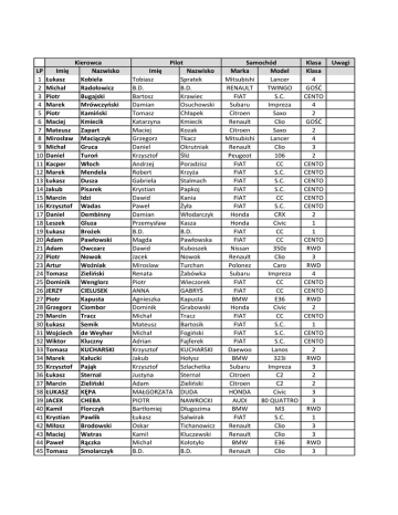 LP 1 2 3 4 5 6 7 8 9 10 11 12 13 14 15 16 17 18 19 20 21 22 23 24 25 26 27 28 29 30 31 32 33 34 35 36 37 38 39 40 41 42 43 44 45 Imię Łukasz Michał Piotr Marek Piotr Maciej Mateusz Mirosław Michał Daniel Kacper Marek Łukasz Jakub Marcin Krzysztof Daniel Leszek Łukasz Adam Adam Piotr Artur Tomasz Dominik JERZY Piotr Grzegorz Marcin Łukasz Wojciech Wiktor Tomasz Marek Krzysztof Łukasz Marcin ŁUKASZ JACEK Kamil Krystian Miłosz Maciej Paweł Tomasz Kierowca Nazwisko Kobiela Radołowicz Bugajski Mrówczyński Kamiński Kmiecik Zapart Maciączyk Gruca Turoń Włoch Mendela Dusza Pisarek Idzi Wadas Dembinny Gluza Brożek Pawłowski Owczarz Nowok Woźniak Zieliński Wenglorz CIELUSEK Kapusta Ciombor Tracz Semik de Weyher Kluczny KUCHARSKI Kałucki Pająk Sternal Zieliński KĘPA CHEBA Florczyk Pawlik Brodowski Watras Rączka Smolarczyk Pilot Imię Nazwisko Tobiasz Spratek B.D. B.D. Bartosz Krawiec Damian Osuchowski Tomasz Chłapek Katarzyna Kmiecik Maciej Kozak Grzegorz Tkacz Daniel Okrutniak Krzysztof Śliż Andrzej Poradzisz Robert Krzyża Gabriela Stalmach Krystian Papkoj Dawid Kania Paweł Żyła Damian Włodarczyk Przemysław Kasza B.D. B.D. Magda Pawłowska Dawid Kuboszek Jacek Nowok Miroslaw Turchan Renata Żabówka Piotr Wieczorek ANNA GABRYŚ Agnieszka Kapusta Dominik Grabowski Michał Tracz Mateusz Bartosik Michał Fogiński Adrian Fajferek Krzysztof KUCHARSKI Jakub Hołysz Krzysztof Szlachetka Justyna Sternal Adam Zieliński MAŁGORZATA DUDA PIOTR NAWROCKI Bartłomiej Długozima Łukasz Salwirak Oskar Tichanowicz Kamil Kluczewski Michał Kołotyło B.D. B.D. Samochód Marka Model Mitsubishi Lancer RENAULT TWINGO FIAT S.C. Subaru Impreza Citroen Saxo Renault Clio Citroen Saxo Mitsubishi Lancer Renault Clio Peugeot 106 FIAT CC FIAT S.C. FIAT S.C. FIAT S.C. FIAT CC FIAT S.C. Honda CRX Honda Civic FIAT CC FIAT CC Nissan 350z Renault Clio Polonez Caro Subaru Impreza FIAT CC FIAT CC BMW E36 Honda Civic FIAT CC FIAT S.C. FIAT S.C. FIAT S.C. Daewoo Lanos BMW 323i Subaru Impreza Citroen C2 Citroen C2 HONDA Civic AUDI 80 QUATTRO BMW M3 FIAT S.C. Renault Clio Renault Clio BMW E36 Renault Clio Klasa Klasa 4 GOŚĆ CENTO 4 2 GOŚĆ 2 4 3 2 CENTO CENTO CENTO CENTO CENTO CENTO 2 1 1 CENTO RWD 3 RWD 4 CENTO CENTO RWD 2 CENTO 1 CENTO CENTO 2 RWD 3 2 2 3 3 RWD 1 3 3 RWD 3 Uwagi 46 47 48 49 50 51 52 53 54 55 56 57 58 59 60 61 62 63 64 65 66 67 68 69 70 71 72 73 74 75 76 77 78 79 80 Adrian Jakub Grzegorz Wojciech Bartosz Łukasz Michał Henryk Dawid Łukasz UWE Piotr TOMASZ Florian Przemek Marek Kamil Sławomir Krzysztof Dawid Marek Krzysztof Mateusz Mariusz Romuald Tomasz Maślanka Jacek Krzysztof Paweł Jakub Artur Wojciech Daniel Tomasz Zawadka Najgrodzki Ira Pawiński Gęca Stoga Ferenczak Sosnowski Tomala Ulman BENDIG Sikorski MIZERA Wojcik mirski Mendrek Fila Hornik Forma Jastrzębski Trzpiot Karkut Grzywacz Rusinek Grudka Stasik Kobylański Józef Koselski Jarosz Oślak Tomalik Kobiela Strączyński Wulczyński Powroźnik B.D. Agnieszka Dawid Monika B.D. B.D. Bartosz Sławomir Grzegorz Piotr RAFAŁ B.D. SŁAWOMIR B.D. Jakub Michał Krzysztof Krzysztof Kamil Piotr Dawid Kazimierz Michał Marcin Grzegorz Piotr B.D. Sebastian Zbigniew b.d. B.D. B.D. B.D. Marcin Tomasz 1 2 3 4 5 6 7 Szymon Daniel Tomasz Tomasz Robert Marek Sylwester Kurasik Strojek Mrzygłód Powroźnik Dudek Czudek Wojciechowski Bartosz Piotr Dawid Tomasz Karolina Krzysztof Andrzej B.D. Szybaj Tomala Biłek B.D. B.D. Chotarski Gorący Ira Czerkaski TELEGA B.D. WAJSMAN B.D. Kwiczała Środa Pietruszka Rzecznik Nowak Leks Glistak Gargas Wróbel Gut Pękala Kobylański B.D. Nadzieja Zajas b.d. B.D. B.D. B.D. Franczyk Moskal Subaru FIAT Honda FIAT Hyundai Honda Subaru FIAT Honda Honda SUBARU BMW 320i BMW Subaru Honda FIAT Subaru Opel Daewoo Honda BMW FIAT FIAT FIAT Citroen OPEL RENAULT Honda Opel FIAT Daewoo Mitsubishi Nissan Renault Audi LISTA REZERWOWA Janiszewski mitsubishi Kowalski BMW Sołtysek Honda Moskal Audi Piechówka Peugeot Cieśla Renault Kańczura Peugeot Impreza S.C. Civic CC COUPE Civic Impreza S.C. Crx Civic Impreza E30 E36 M3 Impreza Civic CC Impreza Astra Lanos Civic E30 CC CC CC C2 KADETT Clio Civic Astra CC Lanos Lancer Micra Clio Coupe 4 GOŚĆ 3 CENTO 4 2 4 GOŚĆ 2 2 4 RWD RWD 4 3 CENTO 4 3 2 2 RWD GOŚĆ CENTO CENTO 3 3 2 GOŚĆ 3 1 2 4 1 3 5 colt` E36 Civic Type R Coupe gti Clio 3 Sport 106 2 RWD GOŚĆ 5 3 Gość 2 b. opłaty b.opłaty b.opłaty b.opłaty b.opłaty b.opłaty b.opłaty