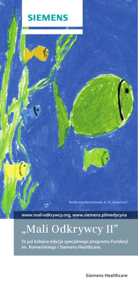 Bartłomiej Kleszczewski, kl. III „Akwarium” www.mali-odkrywcy.org, www.siemens.pl/medycyna „Mali Odkrywcy II” To już kolejna edycja specjalnego programu Fundacji im. Komeńskiego i Siemens Healthcare. Siemens Healthcare Fundacja Rozwoju Dzieci im. J. A. Komeńskiego we współpracy z Sektorem Healthcare Siemensa prowadzi kolejną edycję projektu „Mali Odkrywcy II”, który jest kontynuacją cieszącego się dużym zainteresowaniem programu realizowanego w 2011 r. „Mali Odkrywcy” to autorski program, którego celem jest wyrównanie szans edukacyjnych dzieci w oparciu o nowoczesną metodę pedagogiczną, jaką jest praca metodą projektów. Podejście projektowe zachęca dzieci do samodzielnego zdobywania wiedzy, rozwija ciekawość, uczy logicznego myślenia, stawiania pytań, eksperymentowania. W pierwszej edycji projektu uczestniczyło 3000 osób w 11 gminach miejsko-wiejskich*, przeprowadzono ponad 50 projektów badawczych, przeszkolono 107 nauczycieli, powstały materiały edukacyjne, m.in.: 5 specjalnych zeszytów metodycznych. Przebieg i efekty pracy można obejrzeć w specjalnym filmie edukacyjno – promocyjnym, który jest zamieszczony na stronie internetowej projektu www.mali-odkrywcy.org. W gminach tych cały czas prowadzone są zajęcia metodą projektów badawczych przez przeszkolonych nauczycieli. Kolejną edycję prowadzimy w 10 nowych gminach miejsko-wiejskich**. W programie uczestniczy 1500 osób: dzieci, nauczyciele, instruktorzy świetlic oraz rodzice. Nowe metody pracy są wprowadzone w 40 placówkach zajmujących się wspieraniem rozwoju dzieci w przedszkolach, szkołach, świetlicach i bibliotekach. Projekt „Mali Odkrywcy II” realizujemy w latach 2012 – 2013. * Gminy, które uczestniczyły w projekcie „Mali Odkrywcy I”: Augustów, Barciany, Głuchów, Grudusk, Kętrzyn, Lubawa, Mochowo, Przasnysz, Rawa Mazowiecka, Stoczek Łukowski, Szypliszki. ** Gminy uczestniczące w projekcie „Mali Odkrywcy II”: Strzelin, Kłodawa, Dobiegniew, Burzenin, Klucze, Wiązów, Inowrocław, Gorzków, Gniewkowo, Skoki. FUNDACJA ROZWOJU DZIECI IM. KOMEŃSKIEGO Więcej informacji: www.mali-odkrywcy.org www.frd.org.pl www.siemens.pl/medycyna