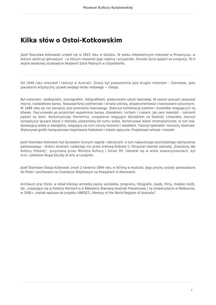 Muzeum Kultury Kurpiowskiej Kilka słów o Ostoi-Kotkowskim Józef Stanisław Kotkowski urodził się w 1922 roku w Golubiu. W wieku młodzieńczym mieszkał w Przasnyszu, w którym ukończył gimnazjum i w którym mieszkali jego rodzina i przyjaciele. Dorosłe życie spędził na emigracji. Po II wojnie światowej studiował w Akademii Sztuk Pięknych w Düsseldorfie. Od 1949 roku mieszkał i tworzył w Australii. Znany był powszechnie pod drugim imieniem – Stanisław. Jako pseudonim artystyczny używał swojego herbu rodowego — Ostoja. Był malarzem, rzeźbiarzem, scenografem, fotografikiem, prekursorem sztuki laserowej. W swoich pracach ukazywał mocne, rozświetlone barwy. Stosował farby polimerowe i emalię szklistą, eksperymentował z tworzywami sztucznymi. W 1968 roku po raz pierwszy użył promienia laserowego. Stworzył kombinację kolorów i kształtów reagujących na dźwięk. Fascynowała go przestrzeń wypełniona barwą, dźwiękiem, ruchem i czasem. Jak sam twierdził – zamienił pędzel na laser. Wykorzystując thereminy, urządzenia reagujące dźwiękiem na bliskość człowieka, tworzył kompozycje łączące obraz z melodią uzależnioną od ruchu widza. Konstruował wieże chromasoniczne, w tym tzw. śpiewającą wieżę w Adelajdzie, reagującą na ruch uliczny kolorami i światłami. Tworzył spektakle i koncerty laserowe. Wykonywał grafiki komputerowe inspirowane fraktalami i kolaże optyczne. Projektował witraże i mozaiki. Józef Stanisław Kotkowski był laureatem licznych nagród i odznaczeń, w tym najwyższego australijskiego odznaczenia państwowego - Orderu Australii, nadanego mu przez królową Elżbietę II. Otrzymał również odznakę „Zasłużony dla Kultury Polskiej”, przyznaną przez Ministra Kultury i Sztuki RP. Udzielał się w wielu stowarzyszeniach, był m.in. członkiem Royal Society of Arts w Londynie. Józef Stanisław Ostoja-Kotkowski zmarł 2 kwietnia 1994 roku w Stirling w Australii. Jego prochy zostały sprowadzone do Polski i pochowane na Cmentarzu Wojskowym na Powązkach w Warszawie. Archiwum prac Ostoi, w skład którego wchodzą zapisy wykładów, programy, fotografie, slajdy, filmy, modele rzeźb, itd., znajdujące się w Kolekcji Mortlock’a w Bibliotece Stanowej Australii Południowej i na Uniwersytecie w Melbourne, w 2008 r. zostało wpisane do projektu UNESCO „Memory of the World Register of Australia”. 1