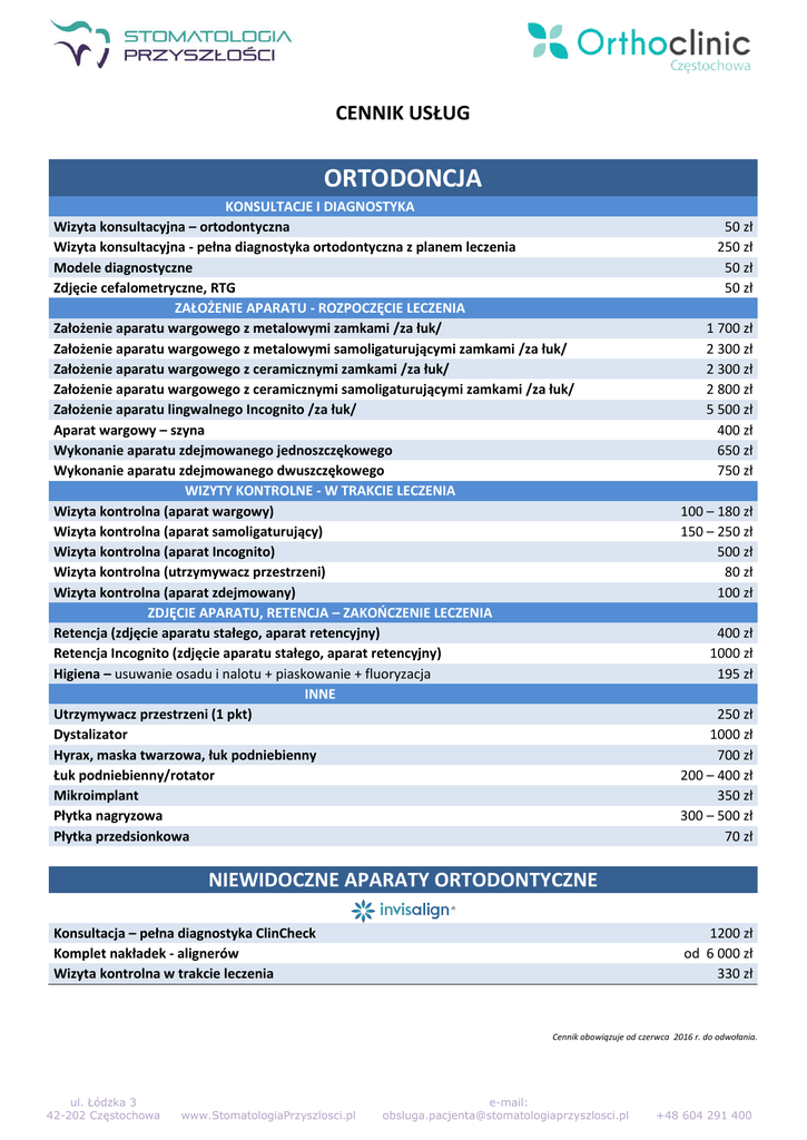CENNIK USŁUG ORTODONCJA KONSULTACJE I DIAGNOSTYKA Wizyta konsultacyjna – ortodontyczna Wizyta konsultacyjna - pełna diagnostyka ortodontyczna z planem leczenia Modele diagnostyczne Zdjęcie cefalometryczne, RTG ZAŁOŻENIE APARATU - ROZPOCZĘCIE LECZENIA Założenie aparatu wargowego z metalowymi zamkami /za łuk/ Założenie aparatu wargowego z metalowymi samoligaturującymi zamkami /za łuk/ Założenie aparatu wargowego z ceramicznymi zamkami /za łuk/ Założenie aparatu wargowego z ceramicznymi samoligaturującymi zamkami /za łuk/ Założenie aparatu lingwalnego Incognito /za łuk/ Aparat wargowy – szyna Wykonanie aparatu zdejmowanego jednoszczękowego Wykonanie aparatu zdejmowanego dwuszczękowego WIZYTY KONTROLNE - W TRAKCIE LECZENIA Wizyta kontrolna (aparat wargowy) Wizyta kontrolna (aparat samoligaturujący) Wizyta kontrolna (aparat Incognito) Wizyta kontrolna (utrzymywacz przestrzeni) Wizyta kontrolna (aparat zdejmowany) ZDJĘCIE APARATU, RETENCJA – ZAKOŃCZENIE LECZENIA Retencja (zdjęcie aparatu stałego, aparat retencyjny) Retencja Incognito (zdjęcie aparatu stałego, aparat retencyjny) Higiena – usuwanie osadu i nalotu + piaskowanie + fluoryzacja INNE Utrzymywacz przestrzeni (1 pkt) Dystalizator Hyrax, maska twarzowa, łuk podniebienny Łuk podniebienny/rotator Mikroimplant Płytka nagryzowa Płytka przedsionkowa 50 zł 250 zł 50 zł 50 zł 1 700 zł 2 300 zł 2 300 zł 2 800 zł 5 500 zł 400 zł 650 zł 750 zł 100 – 180 zł 150 – 250 zł 500 zł 80 zł 100 zł 400 zł 1000 zł 195 zł 250 zł 1000 zł 700 zł 200 – 400 zł 350 zł 300 – 500 zł 70 zł NIEWIDOCZNE APARATY ORTODONTYCZNE Konsultacja – pełna diagnostyka ClinCheck Komplet nakładek - alignerów Wizyta kontrolna w trakcie leczenia 1200 zł od 6 000 zł 330 zł Cennik obowiązuje od czerwca 2016 r. do odwołania. ul. Łódzka 3 42-202 Częstochowa www.StomatologiaPrzyszlosci.pl e-mail: [email protected] +48 604 291 400