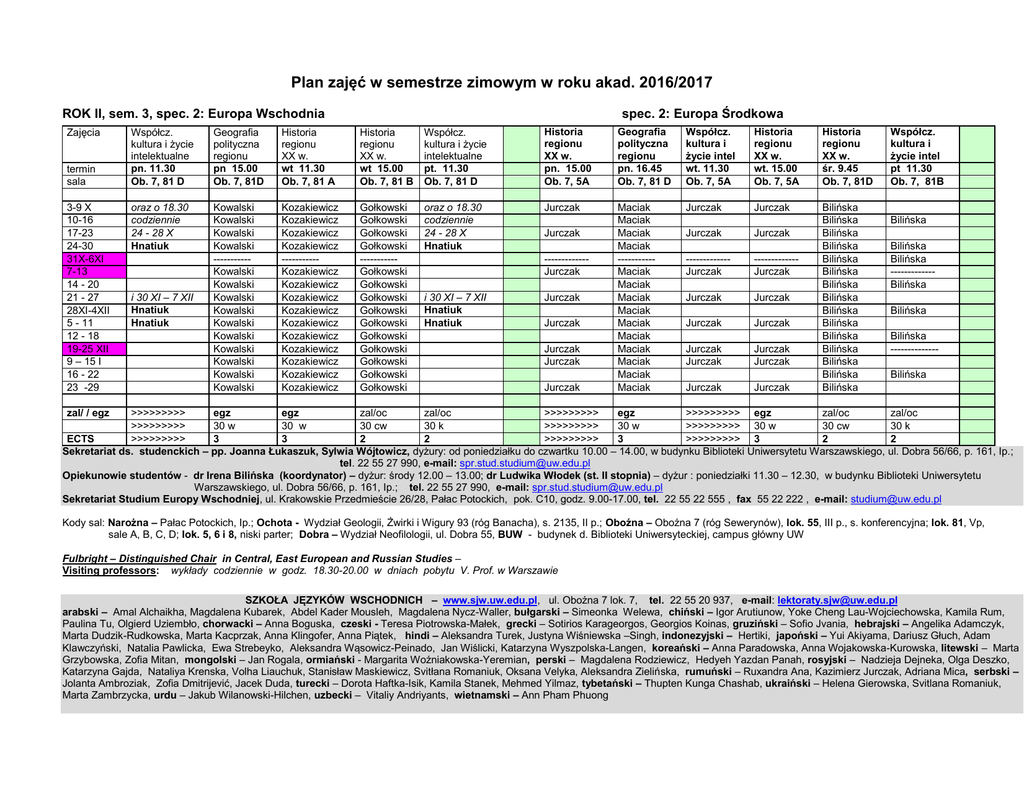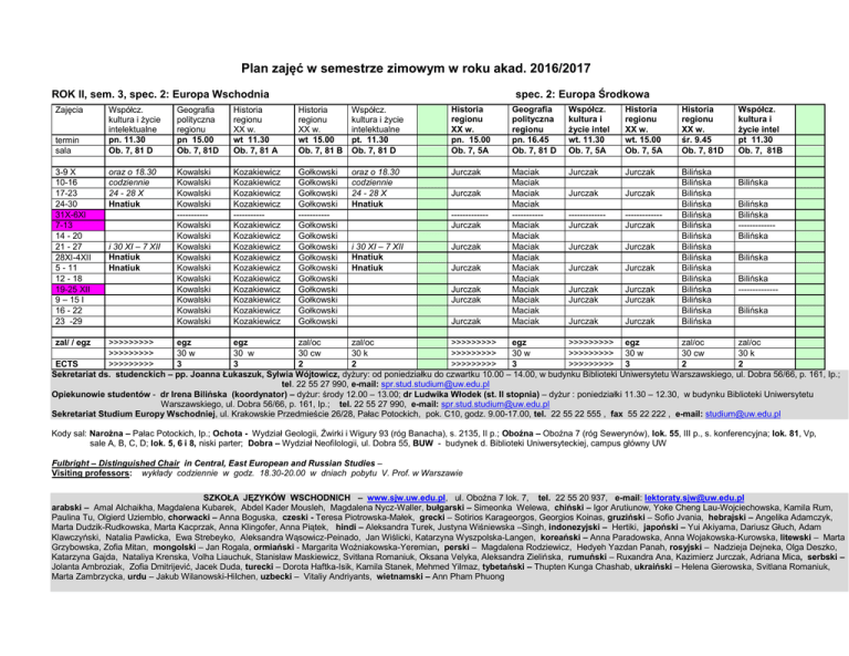 Plan zajęć w semestrze zimowym w roku akad. 2016/2017 spec. 2: Europa Środkowa ROK II, sem. 3, spec. 2: Europa Wschodnia Zajęcia termin sala 3-9 X 10-16 17-23 24-30 31X-6XI 7-13 14 - 20 21 - 27 28XI-4XII 5 - 11 12 - 18 19-25 XII 9 – 15 I 16 - 22 23 -29 Współcz. kultura i życie intelektualne pn. 11.30 Ob. 7, 81 D Geografia polityczna regionu pn 15.00 Ob. 7, 81D Historia regionu XX w. wt 11.30 Ob. 7, 81 A Historia regionu XX w. wt 15.00 Ob. 7, 81 B Współcz. kultura i życie intelektualne pt. 11.30 Ob. 7, 81 D Historia regionu XX w. pn. 15.00 Ob. 7, 5A Geografia polityczna regionu pn. 16.45 Ob. 7, 81 D Współcz. kultura i życie intel wt. 11.30 Ob. 7, 5A Historia regionu XX w. wt. 15.00 Ob. 7, 5A Historia regionu XX w. śr. 9.45 Ob. 7, 81D oraz o 18.30 codziennie 24 - 28 X Hnatiuk Kowalski Kowalski Kowalski Kowalski ----------Kowalski Kowalski Kowalski Kowalski Kowalski Kowalski Kowalski Kowalski Kowalski Kowalski Kozakiewicz Kozakiewicz Kozakiewicz Kozakiewicz ----------Kozakiewicz Kozakiewicz Kozakiewicz Kozakiewicz Kozakiewicz Kozakiewicz Kozakiewicz Kozakiewicz Kozakiewicz Kozakiewicz Gołkowski Gołkowski Gołkowski Gołkowski ----------Gołkowski Gołkowski Gołkowski Gołkowski Gołkowski Gołkowski Gołkowski Gołkowski Gołkowski Gołkowski oraz o 18.30 codziennie 24 - 28 X Hnatiuk Jurczak Maciak Maciak Maciak Maciak ----------Maciak Maciak Maciak Maciak Maciak Maciak Maciak Maciak Maciak Maciak Jurczak Jurczak Jurczak Jurczak ------------Jurczak ------------Jurczak Jurczak Jurczak Jurczak Jurczak Jurczak Jurczak Jurczak Jurczak Jurczak Jurczak Bilińska Bilińska Bilińska Bilińska Bilińska Bilińska Bilińska Bilińska Bilińska Bilińska Bilińska Bilińska Bilińska Bilińska Bilińska i 30 XI – 7 XII Hnatiuk Hnatiuk Jurczak ------------Jurczak i 30 XI – 7 XII Hnatiuk Hnatiuk Jurczak Jurczak Jurczak Jurczak Jurczak Współcz. kultura i życie intel pt 11.30 Ob. 7, 81B Bilińska Bilińska Bilińska ------------Bilińska Bilińska Bilińska -------------Bilińska zal/ / egz egz egz egz >>>>>>>>> zal/oc zal/oc >>>>>>>>> >>>>>>>>> egz zal/oc zal/oc >>>>>>>>> 30 w 30 w 30 cw 30 k >>>>>>>>> 30 w >>>>>>>>> 30 w 30 cw 30 k ECTS 3 3 2 2 3 2 2 >>>>>>>>> >>>>>>>>> >>>>>>>>> 3 Sekretariat ds. studenckich – pp. Joanna Łukaszuk, Sylwia Wójtowicz, dyżury: od poniedziałku do czwartku 10.00 – 14.00, w budynku Biblioteki Uniwersytetu Warszawskiego, ul. Dobra 56/66, p. 161, Ip.; tel. 22 55 27 990, e-mail: [email protected] Opiekunowie studentów - dr Irena Bilińska (koordynator) – dyżur: środy 12.00 – 13.00; dr Ludwika Włodek (st. II stopnia) – dyżur : poniedziałki 11.30 – 12.30, w budynku Biblioteki Uniwersytetu Warszawskiego, ul. Dobra 56/66, p. 161, Ip.; tel. 22 55 27 990, e-mail: [email protected] Sekretariat Studium Europy Wschodniej, ul. Krakowskie Przedmieście 26/28, Pałac Potockich, pok. C10, godz. 9.00-17.00, tel. 22 55 22 555 , fax 55 22 222 , e-mail: [email protected] Kody sal: Narożna – Pałac Potockich, Ip.; Ochota - Wydział Geologii, Żwirki i Wigury 93 (róg Banacha), s. 2135, II p.; Oboźna – Oboźna 7 (róg Sewerynów), lok. 55, III p., s. konferencyjna; lok. 81, Vp, sale A, B, C, D; lok. 5, 6 i 8, niski parter; Dobra – Wydział Neofilologii, ul. Dobra 55, BUW - budynek d. Biblioteki Uniwersyteckiej, campus główny UW Fulbright – Distinguished Chair in Central, East European and Russian Studies – Visiting professors: wykłady codziennie w godz. 18.30-20.00 w dniach pobytu V. Prof. w Warszawie SZKOŁA JĘZYKÓW WSCHODNICH – www.sjw.uw.edu.pl, ul. Oboźna 7 lok. 7, tel. 22 55 20 937, e-mail: [email protected] arabski – Amal Alchaikha, Magdalena Kubarek, Abdel Kader Mousleh, Magdalena Nycz-Waller, bułgarski – Simeonka Welewa, chiński – Igor Arutiunow, Yoke Cheng Lau-Wojciechowska, Kamila Rum, Paulina Tu, Olgierd Uziembło, chorwacki – Anna Boguska, czeski - Teresa Piotrowska-Małek, grecki – Sotirios Karageorgos, Georgios Koinas, gruziński – Sofio Jvania, hebrajski – Angelika Adamczyk, Marta Dudzik-Rudkowska, Marta Kacprzak, Anna Klingofer, Anna Piątek, hindi – Aleksandra Turek, Justyna Wiśniewska –Singh, indonezyjski – Hertiki, japoński – Yui Akiyama, Dariusz Głuch, Adam Klawczyński, Natalia Pawlicka, Ewa Strebeyko, Aleksandra Wąsowicz-Peinado, Jan Wiślicki, Katarzyna Wyszpolska-Langen, koreański – Anna Paradowska, Anna Wojakowska-Kurowska, litewski – Marta Grzybowska, Zofia Mitan, mongolski – Jan Rogala, ormiański - Margarita Woźniakowska-Yeremian, perski – Magdalena Rodziewicz, Hedyeh Yazdan Panah, rosyjski – Nadzieja Dejneka, Olga Deszko, Katarzyna Gajda, Nataliya Krenska, Volha Liauchuk, Stanisław Maskiewicz, Svitłana Romaniuk, Oksana Velyka, Aleksandra Zielińska, rumuński – Ruxandra Ana, Kazimierz Jurczak, Adriana Mica, serbski – Jolanta Ambroziak, Zofia Dmitrijević, Jacek Duda, turecki – Dorota Haftka-Isik, Kamila Stanek, Mehmed Yilmaz, tybetański – Thupten Kunga Chashab, ukraiński – Helena Gierowska, Svitlana Romaniuk, Marta Zambrzycka, urdu – Jakub Wilanowski-Hilchen, uzbecki – Vitaliy Andriyants, wietnamski – Ann Pham Phuong Plan zajęć w semestrze zimowym w roku akad. 2016/2017 ROK II, sem. 3, spec. 2: Bałkany spec. 2: Rosja termin sala Historia regionu XX w. pn. 15.00 Ob. 7, 81B Współcz. kultura i życie intel wt. 11.30 Ob. 7, 5B Historia regionu XX w. wt. 15.00 Ob. 7, 81C Geografia polityczna regionu pt. 16.45 Ob. 7, s. 8 Współcz. kultura i życie intel pn. 15.00 Ob. 7, 81A Historia regionu XX w. śr. 16.45 Ob. 7, 5A Geografia polityczna regionu śr. 18.30 Ob. 7, s. 5A Historia regionu XX w. pt. 11.30 Ob. 7, 5A 3-9 X 10-16 17-23 24-30 31X-6XI 7-13 14 - 20 21 - 27 28XI-4XII 5 - 11 12 - 18 19-25 XII 9 – 15 I 16 - 22 23 -29 Halili Halili Halili Halili ------------Halili Halili Halili Halili Halili Halili Halili Halili Halili Halili Halili Halili Halili Halili ------------Halili Halili Halili Halili Halili Halili Halili Halili Halili Halili Ba