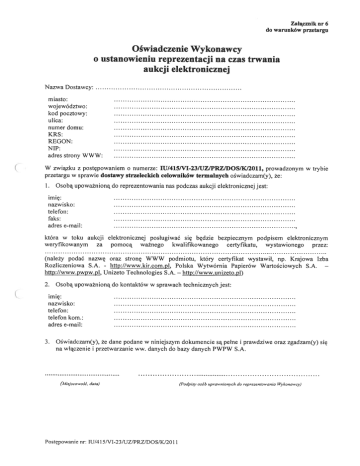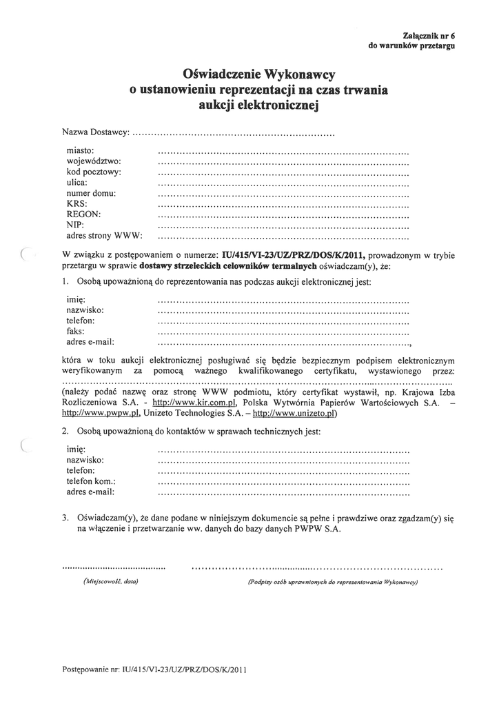 Załącznik nr 6 do warunków przetargu Oświadczenie Wykonawcy o ustanowieniu reprezentacji na czas trwania aukcji elektronicznej Nazwa Dostawcy miasto: województwo: kod pocztowy: ulica: numer domu: KRS: REGON: NIP: adres strony WWW: W związku z postępowaniem o numerze: IU/415/yI-23JUZJPRZJDOSLK/2011, prowadzonym w trybie przetargu w sprawie dostawy strzeleckich celowników termalnych oświadczam(y), że: 1. Osobą upoważnioną do reprezentowania nas podczas aukcji elektronicznej jest: imię: nazwisko: telefon: . ... ... . . . . faks: adres e-mail: która w toku aukcji elektronicznej posługiwać się będzie bezpiecznym podpisem elektronicznym weryfikowanym za pomocą waŻnego kwalifikowanego certyfikatu, wystawionego przez: (należy podać nazwę oraz stronę WWW podmiotu, który certyfikat wystawił, np. Krajowa Izba Rozliczeniowa S.A. http://www.kir.com.pl, Polska Wytwórnia Papierów Wartościowych S.A. http://www.nwpw.pl, Unizeto Technologies S.A. http://www.unizeto.pl) - — — 2. Osobą upoważnioną do kontaktów w sprawach technicznych jest: imię: nazwisko: telefon: telefon kom.: adres e-mail: 3. Oświadczam(y), że dane podane w niniejszym dokumencie są pełne i prawdziwe oraz zgadzam(y) się na włączenie i przetwarzanie ww. danych do bazy danych PWPW S.A. (Miejscowość, data) Postępowanie nr: IU/415fV1-23/UZ/PRZ/DOSJKJ2OI I (Podpisy osób uprawnionych do reprezentowania Wykonawcy)