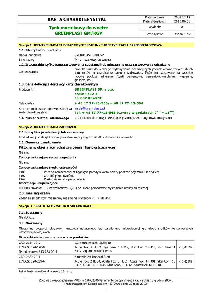 KARTA CHARAKTERYSTYKI Tynk mozaikowy do wnętrz GREINPLAST GM/KGP Data wydania Data aktualizacji 2003.12.18 2015.06.01 Wydanie 8 Strona/stron Strona 1 z 7 Sekcja 1. IDENTYFIKACJA SUBSTANCJI/MIESZANINY I IDENTYFIKACJA PRZEDSIĘBIORSTWA 1.1. Identyfikator produktu Nazwa handlowa: Inne nazwy: GREINPLAST GM/KGP Tynk mozaikowy do wnętrz 1.2. Istotne zidentyfikowane zastosowania substancji lub mieszaniny oraz zastosowania odradzane Produkt służy do ręcznego wykonywania dekoracyjnych powłok wewnętrznych lub ich Zastosowanie: fragmentów, o charakterze tynku mozaikowego. Może być stosowany na wszelkie typowe podłoża mineralne (tynki cementowe, cementowo-wapienne, wapienne, gipsowe, itp.) 1.3. Dane dotyczące dostawcy karty charakterystyki Producent: GREINPLAST SP. z o.o. Krasne 512 B 36-007 KRASNE Telefon/fax: + 48 17 77- 13-500/+ 48 17 77-13-590 Adres e- mail osoby odpowiedzialnej za [email protected] kartę charakterystyki: Tel. + 48 17 77-13-545 (czynny w godzina ch 7 O O – 15 O O ) 1.4. Numer telefonu alarmowego 112 (telefon alarmowy), 998 (straż pożarna), 999 (pogotowie medyczne) Sekcja 2. IDENTYFIKACJA ZAGROŻEŃ 2.1. Klasyfikacja substancji lub mieszaniny Produkt nie jest klasyfikowany jako stwarzający zagrożenie dla człowieka i środowiska. 2.2. Elementy oznakowania Piktogramy określające rodzaj zagrożenia i hasło ostrzegawcze Nie ma. Zwroty wskazujące rodzaj zagrożenia Nie ma. Zwroty wskazujące środki ostrożności P101 W razie konieczności zasięgnięcia porady lekarza należy pokazać pojemnik lub etykietę. P102 Chronić przed dziećmi. P264 Dokładnie umyć ręce po użyciu. Informacje uzupełniające EUH208 Zawiera: 1,2-benzoizotiazol-3(2H)-on. Może powodować wystąpienie reakcji alergicznej. 2.3. Inne zagrożenia Żaden ze składników mieszaniny nie spełnia kryteriów PBT i/lub vPvB Sekcja 3. SKŁAD/INFORMACJA O SKŁADNIKACH 3.1. Substancje Nie dotyczy. 3.2. Mieszaniny Mieszanina dyspersji akrylowej, kruszywa naturalnego lub barwionego odpowiedniej granulacji, środków konserwujących i modyfikujących, wody. Składniki niebezpieczne zawarte w produkcie: CAS: 2634-33-5 EINECS: 220-120-9 Nr indeksowy: 613-088-00-6 1,2-benzoizotiazol-3(2H)-on Acute Tox. 4 H302, Eye Dam. 1 H318, Skin Irrit. 2 H315, Skin Sens. 1 H317, Aquatic Acute 1 H400 < 0,025% CAS: 2682-20-4 EINECS: 220-239-6 2-metylo-2H-izotiazol-3-on Acute Tox. 2 H330, Acute Tox. 3 H311, Acute Tox. 3 H301, Skin Corr. 1B H314, STOT SE 3 H335, Skin Sens. 1 H317, Aquatic Acute 1 H400 < 0,025% Pełna treść zwrotów H w sekcji 16 karty. Zgodnie z rozporządzeniem (WE) nr 1907/2006 Parlamentu Europejskiego i Rady z dnia 18 grudnia 2006r. i rozporządzeniem Komisji (UE) nr 453/2010 z dnia 20 maja 2010r . KARTA CHARAKTERYSTYKI Tynk mozaikowy do wnętrz GREINPLAST GM/KGP Data wydania Data aktualizacji 2003.12.18 2015.06.01 Wydanie 8 Strona/stron Strona 2 z 7 Sekcja 4. ŚRODKI PIERWSZEJ POMOCY 4.1. Opis środków pierwszej pomocy Wskazówki ogólne: Kartę Charakterystyki pokazać lekarzowi udzielającemu pomocy. Przy narażeniu inhalacyjnym: Wyprowadzić poszkodowanego na świeże powietrze, zapewnić ciepło i spokój. Skonsultować się z lekarzem w razie wystąpienia niepokojących dolegliwości. Przy kontakcie ze skórą: Zdjąć zanieczyszczoną odzież, skórę zmyć dokładnie wodą z mydłem i spłukać. W razie wystąpienia niepokojących objawów skonsultować się z lekarzem. Przy kontakcie z oczami: Zanieczyszczone oczy przepłukiwać dokładnie wodą przez 10-15 min. Unikać silnego strumienia wody - ryzyko uszkodzenia rogówki. Chronić niepodrażnione oko, wyjąć szkła kontaktowe. W razie wystąpienia niepokojących objawów skonsultować się z lekarzem. Przy połknięciu: Przepłukać usta wodą, skonsultować się z lekarzem i pokazać opakowanie lub etykietę. 4.2. Najważniejsze ostre i opóźnione objawy oraz skutki narażenia Objawy wynikające z nadmiernej ekspozycji Wdychanie: Narażenie tą drogą nie powoduje negatywnych skutków zdrowotnych. Spożycie: Bóle brzucha, mdłości, wymioty. Skóra: W przypadku częstego lub długotrwałego kontaktu produkt może powodować zaczerwienienie, wysuszenie skóry, wystąpienie reakcji alergicznej. Oczy: Zaczerwienienie, łzawienie, pieczenie. 4.3. Wskazania dotyczące wszelkiej natychmiastowej pomocy lekarskiej i szczegółowe postępowanie z poszkodowanym Informacje dla lekarza: Leczyć objawowo. Sekcja 5. POSTĘPOWANIE W PRZYPADKU POŻARU 5.1. Środki gaśnicze Odpowiednie: Piana gaśnicza, proszek gaśniczy, dwutlenek węgla, rozpylony strumień wody. Niewłaściwe: Nie są znane. 5.2. Szczególne zagrożenia związane z substancją lub mieszaniną Niebezpieczne produkty rozkładu W warunkach spalania mogą tworzyć się szkodliwe gazy (CO, CO 2), nie można termicznego: wykluczyć powstawania innych niebezpiecznych gazów. 5.3. Informacje dla straży pożarnej Szczególny zakres działań ochronnych: Chłodzić zamknięte pojemniki narażone na ogień poprzez zraszanie wodą z bezpiecznej odległości. Szybko izolować teren przez wyprowadzenie wszystkich osób z najbliższej okolicy pożaru. Specjalny sprzęt ochronnych dla strażaków: Dostosowany do przyczyn pożaru. Używać aparaty oddechowe i odzież ochronną. Sekcja 6. POSTĘPOWANIE W PRZYPADKU NIEZAMIERZONEGO UWOLNIENIA DO ŚRODOWISKA 6.1. Indywidualne środki ostrożności, wyposażenia i procedury w sytuacjach awaryjnych Ograniczyć dostęp osób postronnych do obszaru awarii do czasu zakończenia odpowiednich operacji oczyszczania. Dopilnować, aby usuwanie awarii i jej skutków przeprowadzał wyłącznie przeszkolony personel. Unikać bezpośredniego kontaktu z produktem, zapewnić właściwą wentylację. Stosować odpowiednie środki ochrony indywidualnej. 6.2. Środki ostrożności w zakresie środowiska Zabezpieczyć przed przedostaniem się mieszaniny do kanalizacji, wód powierzchniowych i gruntowych oraz gleby. Poinformować odpowiednie władze w przypadku, kiedy