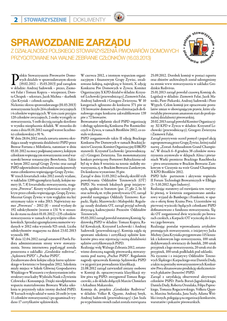 2 STOWARZYSZENIE DOKUMENTY SPRAWOZDANIE ZARZĄDU Z DZIAŁALNOŚCI POLSKIEGO STOWARZYSZENIA PIWOWARÓW DOMOWYCH PRZYGOTOWANE NA WALNE ZEBRANIE CZŁONKÓW (16.03.2013) P olskie Stowarzyszenie Piwowarów Domowych działało w sprawozdawanym okresie (19.02.2012 – 15.03.2013) pod zarządem w składzie: Andrzej Sadownik – prezes, Ziemowit Fałat i Tomasz Kopyra – wiceprezesi, Dorota Chrapek – sekretarz, Jacek Michna – skarbnik i Jan Krysiak – członek zarządu. Na koniec okresu sprawozdawanego (01.03.2013) stowarzyszenie liczyło 264 członków zwyczajnych i 4 członków wspierających. W tym czasie przyjęto 120 członków zwyczajnych, 2 osoby wystąpiły ze stowarzyszenia, 5 osób decyzją zarządu skreślono w wyniku nieopłacenia składek. W stosunku do stanu z dnia 01.01.2012 nastąpił wzrost liczebności członkowskiej o 91 %. W dniu 28.04.2012 została zawarta umowa określająca zasady wspierania działalności PSPD przez Browar Fortuna z Miłosławia, natomiast w dniu 03.10. 2012 na mocy podpisanej umowy, kolejnym członkiem wspierającym stowarzyszenie został warszawski browar restauracyjny BrowArmia. Także w lutym 2012 zarząd Grupy Żywiec oraz zarząd PSPD odpowiednimi uchwałami usankcjonowały status członkostwa wspierającego Grupy Żywiec. W trzech kwartałach roku 2012 zostały wydane, w nakładzie 1200 egzemplarzy każdy, kolejne numery (6, 7, 8) kwartalnika stowarzyszenia, magazynu „Piwowar”. Koszty wydawnicze zostały pokryte przez członka wspierającego, Grupę Żywiec. Mecenat Grupy Żywiec w tym względzie ma być utrzymany także w roku 2013. Najświeższy numer „Piwowara” – 2012 (8) – został wysłany do 192 subskrybentów (wzrost o 131 % w stosunku do stanu na dzień 01.01.2012) i 235 członków stowarzyszenia w ramach ich przywilejów członkowskich. Sprzedaż egzemplarzowa numerów wydanych w 2012 roku wyniosła 925 sztuk. Liczba subskrybentów magazynu na dzień 23.02.2013 wynosiła 198. W dniu 12.04.2012 zarząd ustanowił Pawła Fiedora administratorem strony www stowarzyszenia. Strona internetowa pspd.org.pl została poszerzona o zakładki: „Grodziskie redivivus”, „Sędziowie PSPD” i „Puchar PSPD”. Zrealizowano dwie kolejne edycje kursu sędziowskiego w kwietniu i w listopadzie 2012. Szkolenia miały miejsce w Szkole Głównej Gospodarstwa Wiejskiego w Warszawie z wykorzystaniem infrastruktury oraz kadry Wydziału Nauk o Żywieniu Człowieka i Konsumpcji. Dzięki nieodpłatnemu wsparciu materiałowemu Browaru Warka szkolenia te przyniosły także istotny dochód PSPD. W kursach wzięło udział w sumie 26 osób (w tym 11 członków stowarzyszenia) i po egzaminach wydano 17 certyfikatów sędziowskich. W czerwcu 2012, z istotnym wsparciem organizacyjnym i finansowym Grupy Żywiec, zrealizowano kolejną, największą w historii, X edycję Konkursu Piw Domowych w Żywcu. Komitet Organizacyjny X KPD działał w składzie: Krzysztof Lechowski (przewodniczący), Ziemowit Fałat, Andrzej Sadownik i Grzegorz Zwierzyna. W 10 kategoriach zgłoszono do konkursu 371 piw ze 131 browarów domowych i po eliminacjach do finałowego etapu konkursu zakwalifikowano 139 piw z 72 browarów. Browamator odpłatnie zlecił PSPD organizację i obsługę sędziowską Konkursu Piw Rzemieślniczych w Żywcu, w ramach Birofiliów 2012, co zostało wykonane. PSPD zorganizowało także II edycję Brackiego Konkursu Piw Domowych w ramach Brackiej Jesieni w Cieszynie. Komitet Organizacyjny II BKPD stanowili: Krzysztof Lechowski (przewodniczący) i Grzegorz Zwierzyna. Ten monotematyczny konkurs poświęcony Porterowi Bałtyckiemu odbył się w dniu 8 września na terenie siedziby stowarzyszenia, tj. w Brackim Browarze Zamkowym. Do konkursu wystawiono 35 piw. Zarząd w dniu 11.03.2012 uchwałą określił tryb powoływania Oddziałów Terenowych (OT) PSPD. Na wniosek lokalnych grup inicjatywnych, zgodnie ze Statutem (par. 27, pkt 2, lit. b) oraz uchwałą nt. trybu powoływania OT, zarząd powołał następujące Oddziały Terenowe: Karpacki, Śląski, Mazowiecki i Małopolski. Regulując zasady działania OT, zarząd przyjął uchwałę dotyczącą kadencyjności Prezesów Oddziałów Terenowych. 05.03.2012 zarząd powołał statutową Komisję Sędziowską PSPD w składzie: Tomasz Kopyra, Rafał Kowalczyk, Krzysztof Lechowski i Andrzej Sadownik (przewodniczący). Komisja zajęła się sprawami szkolenia i certyfikacji sędziów konkursów piwa oraz rejestracją i oceną działalności sędziów certyfikowanych PSPD. Realizując wolę Walnego Zebrania 2012, ustanowiono doroczną nagrodę piwowarską stowarzyszenia pod nazwą „Puchar PSPD”. Regulamin nagrody opracowała Komisja Sędziowska PSPD i w jej gestii jest prowadzenie klasyfikacji. 21.08.2012 zarząd zatwierdził zmiany osobowe w Komisji ds. opracowywania klasyfikacji stylów piwa wg PSPD: zrezygnował Tomasz Rogaczewski, a do składu dołączyli Marcin Chmielarz i Arkadiusz Makarenko. Komisja ds. projektu „Grodziskie Redivivus” w składzie: Volker R. Quante, Andrzej Smyk, Andrzej Sadownik (przewodniczący) i Jan Szała po wypełnieniu swoich zadań została rozwiązana 25.09.2012. Dorobek komisji w postaci raportu oraz zbiorów archiwalnych został udostępniony na stronie www stowarzyszenia w zakładce Grodziskie Redivivus. 25.01.2013 zarząd powołał czasową Komisję ds. Legislacji w składzie: Ziemowit Fałat, Jacek Materski, Piotr Piekarski, Andrzej Sadownik i Piotr Wypych. Celem komisji jest opracowanie postulatów zmian w obowiązującym prawie, które ułatwiałyby piwowarom amatorom start do profesjonalnej działalności piwowarskiej. 20.02.2013 zarząd powołał Komitet Organizacyjny XI KPD w Żywcu w składzie: Krzysztof Lechowski (przewodniczący), Grzegorz Zwierzyna i Ziemowit Fałat. Zarząd pozytywnie ocenił pomysł i poparł akcję zaproponowaną przez Grupę Żywiec, której nadał nazwę „Zostań Ambasadorem Grand Championa”. W dniach 6–8 grudnia 38 członków st