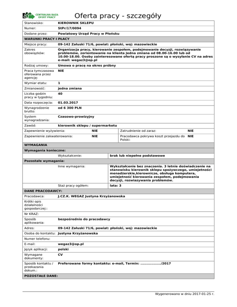 Oferta pracy - szczegóły Stanowisko: KIEROWNIK SKLEPU Numer: StPr/17/0094 Dodane przez: Powiatowy Urząd Pracy w Płońsku WARUNKI PRACY I PŁACY Miejsce pracy: 09-142 Załuski 71/6, powiat: płoński, woj: mazowieckie Zakres obowiązków: Organizacja pracy, kierowanie zespołem, podejmowanie decyzji, rozwiązywanie problemów, zorientowanie na klienta Jedna zmiana od 08.00-16.00 lub od 10.00-18.00. Osoby zainteresowane ofertą pracy proszone są o wysyłanie CV na adres e-mail: [email protected] Rodzaj umowy: Umowa o pracę na okres próbny Praca tymczasowa oferowana przez agencję: NIE Wymiar etatu: 1 Zmianowość: jedna zmiana Liczba godzin pracy w tygodniu: 40 Data rozpoczęcia: 01.03.2017 Wynagrodzenie brutto: od 6 300 PLN System wynagradzania: Czasowo-prowizyjny Zawód: kierownik sklepu / supermarketu Zapewnienie wyżywienia: NIE Zatrudnienie od zaraz: NIE Zapewnienie zakwaterowania: NIE Pracodawca pokrywa koszt przejazdu do NIE Polski: WYMAGANIA Wymagania konieczne: Wykształcenie: brak lub niepełne podstawowe Pozostałe wymagania: Inne wymagania: Wykształcenie bez znaczenia. 3 letnie doświadczenie na stanowisku kierownik sklepu spożywczego, umiejetności menadżerskie,kierownicze, obsługa komputera, umiejetność kierowania zespołem, podejmowania decyzji, rozwiazywania problemów. Staż pracy ogółem: lata: 3 DANE PRACODAWCY: Pracodawca: J.CZ.K. WEGAZ Justyna Krzyżanowska Krótki opis działalności gospodarczej:: Nr KRAZ: Sposób aplikowania: bezpośrednio do pracodawcy Adres: 09-142 Załuski 71/6, powiat: płoński, woj: mazowieckie Osoba do kontaktu: Justyna Krzyżanowska Numer telefonu: E-mail: [email protected] Język aplikacji: polski Wymagane dokumenty: CV Sposób kontaktu / przekazania dokum.: Preferowane formy kontaktu: e-mail, Termin: ................./2017 POZOSTAŁE DANE: Wygenerowano w dniu 2017-01-25 r. Liczba miejsc pracy: 1 Przeznaczone wyłącznie dla osób zarejestrowanych w urzędzie pracy: NIE w tym dla niepełnosprawnych: 0 Przeznaczone dla osób niepełnosprawnych (finansowanie z PFRON): NIE Data dodania: 20.01.2017 Możliwe przekazanie do realizacji przez inny PUP: NIE Data aktualizacji: 23.01.2017 Data udostępnienia na portalu Europejskich Służb Zatrudnienia: 20.01.2017 Data ważności: 19.02.2017 Wygenerowano w dniu 2017-01-25 r.