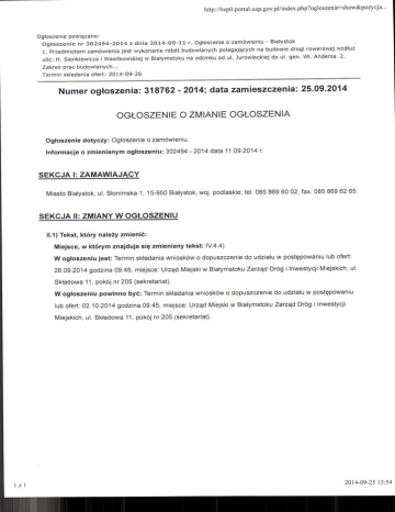 http:/Azpo.portal.uzp.gov.plTindex.php?ogloszEnie=show&pozvcja " Ogloszenie powiqzane: Ogloszenie nr 302494-2014 z dnia 2014-09-11 r. Ogloszenie o zam6wienlu - Bialystok drogi rowerowej wzdlu2 1. plzedmiotem zam6wienia jest wykonanie rob6t budowlanych pol€gajlcych na budowie uli€: H. sienki€wicza I Wasilkowskiej w Blalvmstoku na odclnku od zakres prac budowlanych ul Jurowlecki€j do ul gen' Wl Andersa 2' r€rmin sktadanla olertr 2014-09_26 N umer ogNoszen iai 31 87 62 - 201 4l data zamieszczen ia : 25'09'201 4 OGt-OSZENIE O ZMIANIE OGT.OSZENIA Ogloszenie dotyczy: Ogloszenia o zam6wieniu. lnlormacje o zmienianym ogloszeniu: 302494 - 2014 dala 11.O9.2014 t- SEKCJA I: ZAMAWAJACY 65' Ir4iasto Bialystok, ul. Slonimska 1, '15-950 Bialystok, woj. podlaskie, tel. 085 869 60 02' fax' 085 869 62 SEKCJA ll: ZMIANY W OGTOSZENIU ll.l) Tekst, kt6ry nale2y zmieni6: Mieisce, w kt6rym znajduie siQ zmieniany tekst: lV4 4). W ogloszeniu jest Termin sktadania wniosk6w o dopuszczenie do udzialu w postQpowaniu lub ofert: 26.09.2014 godzina 09:45, mieisce: Uzqd Miejskiw Bialymstoku ZaQqd Dr6g i lnwestycji Miejskich, ul' Sktadowa 11, pok6i nr205 (sekretariat). W ogtoszeniu powinno by6: Termin skladania wniosk6w o dopuszczenie do udzialu w postepowaniu lub ofert: 02.10.2014 godzina 09:45, miejsce: Uzqd Miejskiw Bialymstoku Zazqd Dr6g i lnweslycji lViejskich, ul. Skladowa 11, pok6jnr205 (sekretariat). 2014-09-25 13r54