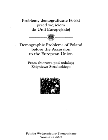 Problemy demograficzne Polski przed wejściem do Unii Europejskiej Demographic Problems of Poland before the Accession to the European Union Praca zbiorowa pod redakcją Zbigniewa Strzeleckiego Polskie Wydawnictwo Ekonomiczne Warszawa 2003 Spis treści Contents Wprowadzenie - Introduction Część pierwsza - Part one Stan i perspektywy demograficzne - Present Status and Demographic Prospects Zbigniew Strzelecki - Europa - Polska. Stan i perspektywy demograficzne (1980-2050) / Europę - Poland. Present Status and Demographic Prospects (1980-2050) Tadeusz Toczyński - Narodowy Spis Powszechny Ludności i Mieszkań 2002 - synteza wyników / The Population and Housing Census in 2002 - Summary of Results 13 34 Część druga - Part two Teoria i metoda demografii - Theory and Method of Demography Janina Jóźwiak - Podstawy metodologiczne nowoczesnej analizy demograficznej / Methodological Base of Modern Demographic Analysis Ewa Frątczak - Teorie niskiej płodności / Theories of Low Fertility Irena E. Kotowska - Zmiany procesu zastępowalności pokoleń i ich uwarunkowania / Reproduction Changes and Their Determinants 47 54 66 Część trzecia - Part three Demografia ekonomiczna - Economic Demography Janusz Witkowski - Rozwój ludności a rynek pracy - Polska i Europa / Population Development and Labour Market - Poland and Europę Brunon Synak - Polska starość - trzydzieści lat później / Polish Old Age - Thirty Years After 89 115 Część czwarta - Part four Demografia społeczna - Social Demography Piotr Szukalski - Proces starzenia się ludności a sprawiedliwość i równość międzypokoleniowa / Population Ageing and Intefgenerational Justice and Eąuity Piotr Błędowski - Samorząd terytorialny wobec problemów osób starszych / Local Government and the Problems of Older People 131 146 Joanna Sikorska - Niepełnosprawność a rynek - wymiary marginalizacji osób niepełnosprawnych / Disability and the Market - Marginalization of Disabled Persons 157 Część piąta - Part five Demografia rodziny - Family Demography Stanisław Wierzchosławski - Problematyka rodziny wielkiego miasta / Problems of Family in a Big Town Irena Kowalska - Zmiany stanu i struktury rodzin w kontekście przemian procesów demograficznych w Polsce w latach 1988-2002 / Changes in Family Status and Structure in the Context of Demographic Transformation in Poland in the Years 1988-2002 175 181 Część szósta - Part six Demografia medyczna - Medical Demography Zbigniew Religa - Zdrowie, umieralność a polityka ludnościowa - Polska - Europa / Health, Mortality and Population Policy - Poland - Europę Marek P. Nowacki, Jan Steffen - Onkologia polska - osiągnięcia, problemy i propozycje rozwiązań systemowych / Oncology in Poland - Achievements, Problems and Proposals of System Solutions Janusz Szymborski - Ochrona zdrowia dzieci i młodzieży w Polsce - aktualne problemy i propozycje rozwiązań systemowych / Health Care of Children and Youth in Poland - Current Problems and Proposals of System Solutions 205 216 242 Część siódma - Part seven Demografia regionalna - Demography of Regions Alina Potrykowska - Zróżnicowanie regionalne sytuacji demograficznej w Polsce / Regional Differentiation of Demographic Situation in Poland Lucyna Frąckiewicz - Rozwój demograficzny ludności województwa śląskiego / Demographic Development of the Śląskie Voivodeship 257 283 Część ósma - Part eight Polityka ludnościowa - Population Policy Janusz Balicki - Polityka ludnościowa i społeczna — doświadczenia międzynarodowe / Population and Social Policies - International Experience 307 Helmut Juros - Etyczne aspekty polityki demograficznej / Ethical Aspects of Demographic Policy 316 Józefina Hrynkiewicz - Zadania samorządów terytorialnych w rozwoju demograficznym i polityce ludnościowej / Duties of the Territorial Self-government in Demographic Progress and Population Policy 342 Deklaracja I Kongresu Demograficznego w Polsce - Declaration of I Demographic Congress in Poland Polska a Europa. Procesy demograficzne u progu XXI wieku / Poland and Europę. Demographic Processes at the Beginning of the 21 st Century 358