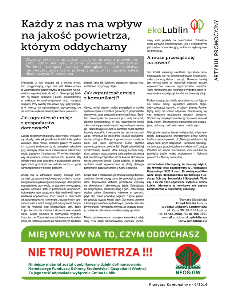 Wszyscy chcieliby oddychać czystym, zdrowym powietrzem. Żeby jednak tak było, musimy zmieniać naszą mentalność. Pomimo rosnącej wiedzy ekologicznej społeczeństwa, nie wszyscy zdają sobie sprawę z tego, w jaki sposób należy dbać o czystość powietrza. Większość z nas słyszała już o niskiej emisji, lecz przypomnijmy, czym ona jest. Niska emisja to wprowadzanie gazów i pyłów do powietrza na niewielkich wysokościach, do 40 m. Głównym jej źródłem są lokalne kotłownie i piece, eksploatowane w sektorze komunalno-bytowym, oraz transport drogowy. Przy zwartej zabudowie pyły i gazy zalegają w miejscu ich wprowadzania, przyczyniając się do wzrostu stężenia zanieczyszczeń w powietrzu. Jak ograniczać emisję z gospodarstw domowych? Często do domowych pieców, obok węgla, wrzucane są odpady, takie jak plastikowe butelki, folie opakowaniowe, stare meble, kolorowe gazety. W wyniku ich spalania emitowane są do atmosfery szkodliwe pyły, dioksyny, tlenki siarki i tlenki azotu. Szkodzimy sobie, sąsiadom i środowisku. W wyniku niewłaściwej eksploatacji pieców domowych, spalania złej jakości węgla oraz odpadów, w przewodach kominowych może gromadzić się nadmiar sadzy, co grozi samozapłonem i w efekcie pożarem. Chcąc żyć w zdrowszej okolicy, budując dom, zamiast ogrzewania węglowego pomyślmy o montażu ogrzewania gazowego lub olejowego. Jeśli jednak pozostaniemy przy węglu, to stosujmy nowoczesne, wysoko sprawne kotły z paleniskiem retortowym. Automatyka tego urządzenia daje możliwość wprowadzania odpowiedniej ilości paliwa w zależności od zapotrzebowania na energię. Jeszcze innym sposobem walki z niską emisją jest przyłączanie budynków do miejskiej sieci ciepłowniczej, tam, gdzie to jest technicznie możliwe i ekonomicznie uzasadnione. Ciepło sieciowe to rozwiązanie wygodne i bezpieczne. Coraz większe zainteresowanie wzbudzają też instalacje oparte na odnawialnych źródłach energii, takie jak kolektory słoneczne, ogniwa fotowoltaiczne czy pompy ciepła. Jak ograniczać emisję z komunikacji? Oprócz emisji gazów i pyłów powstałych w wyniku spalania opału w źródłach grzewczych gospodarstw domowych, duże znaczenie ma emisja liniowa. Źródłem zanieczyszczeń powietrza jest tutaj transport, głównie samochodowy. W celu ograniczenia emisji z komunikacji prowadzi się różnego rodzaju inwestycje. Rozładowuje się ruch w centrach miast poprzez budowę obwodnic i kierowanie tam ruchu tranzytowego, remontuje się stare drogi i buduje skrzyżowania bezkolizyjne. Dobrym i sprawdzonym rozwiązaniem jest także upłynnienie ruchu poprzez wprowadzenie tzw. zielonej fali. Dzięki odpowiedniej synchronizacji świateł, które kierują ruchem miejskim, pojazdy, jadąc z pewną stałą prędkością, mogą bez problemu przejeżdżać każde kolejne skrzyżowanie na zielonym świetle. Coraz częściej, w ścisłych centrach miast, wprowadzane są strefy płatnego parkowania bądź wyłączone z ruchu kołowego. Chcąc dbać o środowisko, jak również o swoje finanse, zwróćmy również uwagę na to, jak prowadzimy samochód. Odpowiednio dobrane przełożenia wpływają na ekologiczną i ekonomiczną jazdę. Dojeżdżając do skrzyżowania, zdejmijmy nogę z gazu, żeby odciąć dopływ paliwa. Kontrolujmy ciśnienie w oponach, gdyż zbyt niskie powoduje większe zużycie paliwa, co generuje wyższe koszty jazdy. Gdy mamy problem z kopcącym układem wydechowym, pomoże nam dobry mechanik. Pamiętajmy również, że podczas postoju na terenie zabudowanym należy wyłączyć silnik. Miasta zainteresowane rozwojem komunikacji miejskiej, m.in. dzięki dofinansowaniu unijnemu, wymie- niają stare pojazdy na nowoczesne. Rozwiązaniem zarówno ekonomicznym, jak i ekologicznym jest system komunikacyjny, w którym wykorzystuje się trolejbusy. A może przesiąść się na rower? Ten środek lokomocji umożliwia najszybsze przemieszczanie się na kilkukilometrowych dystansach, zwłaszcza w godzinach szczytu. Rowerem łatwiej jest ominąć korki. W niektórych miastach zostały wprowadzone miejskie wypożyczalnie rowerów. Takie rozwiązanie jest niedrogie i wygodne, gdyż rowery można wypożyczyć i oddać na dowolnej stacji. Podsumowując, jest wiele sposobów na zmniejszanie niskiej emisji. Wystarczy odrobina chęci, żeby polepszyć warunki, w których żyjemy. Pamiętajmy, żeby nie spalać odpadów. Zastanówmy się nad rodzajem ogrzewania naszych domostw. Wybierzmy miejską komunikację czy rower zamiast jazdy autem. Troszcząc się o powietrze nas otaczające, zadbamy o zdrowie nasze i najbliższych. Więcej informacji na temat niskiej emisji, w tym materiały audiowizualne przygotowane przez Gminę Lublin w ramach projektu pt. „Nie truj powietrza – miej wpływ na to, czym oddychasz – kampania edukacyjna dotycząca przeciwdziałania niskiej emisji”, znajdą Państwo na stronie internetowej www.um.lublin.eu (zakładka Lublin miasto ekologiczne – Ochrona powietrza – Nie truj powietrza) Jednocześnie informujemy, że niniejszy artykuł, jak również tekst opublikowany w „Przeglądzie Komunalnym” 6/2014 na str. 29, zostały opublikowane dzięki dofinansowaniu Narodowego Funduszu Ochrony Środowiska i Gospodarki Wodnej, a za ich treść odpowiada wyłącznie Gmina Lublin. Informacja ta omyłkowo nie została zamieszczona w poprzedniej publikacji. Tomasz Sławiński Urząd Miasta Lublin Wydział Ochrony Środowiska ul. Zana 38, 20-601 Lublin tel. 81 466 2600, fax 81 466 2601 e-mail:[email protected] www.um.lublin.eu Przegląd Komunalny nr 9/2014 ARTYKUŁ PROMOCYJNY Każdy z nas ma wpływ na jakość powietrza, którym oddychamy