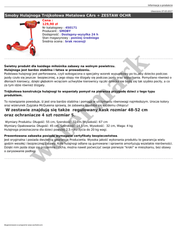 Informacje o produkcie Utworzono 07-03-2017 Smoby Hulajnoga Trójkołowa Metalowa CArs + ZESTAW OCHR Cena : 129,90 zł Nr katalogowy : 450171 Producent : SMOBY Dostępność : Dostępny-wysyłka 24 h Stan magazynowy : poniżej średniego Średnia ocena : brak recenzji er m ar k Świetny produkt dla każdego miłośnika zabawy na wolnym powietrzu. Hulajnoga jest bardzo stabilna i łatwa w prowadzeniu. Podstawa hulajnogi jest perforowana, czyli wzbogacona o specjalny wzorek wypustkowy po to, aby dziecko podczas jazdy czuło się jeszcze bezpieczniej, a jego stopy nie ślizgały się podczas jazdy oraz odpychania. Pomyślano również o dłoniach kierowcy, dzięki głębokim wcięciom uchwytów kierownicy rączki dziecka nie będą się tak szybko pociły, a co za tym idzie również ślizgały. Trójkołowa konstrukcja hulajnogi to wspaniały pomysł na pierwszą przygodę dzieci z tego typu produktem. To rozwiązanie powoduje, iż jest ona bardzo stabilna i pomaga w utrzymaniu równowagi najmłodszym. Urocze kolory oraz wizerunek Zygzaka McQueena sprawią, że zabawka spodoba się każdemu chłopcu! W zestawie znajdują się także regulowany kask rozmiar 48-52 cm oraz ochraniacze 4 szt rozmiar S. at Wymiary Produktu: Długość: 55 cm, Szerokość: 32 cm, Wysokość: 67 cm Wymiary Opakowania: Długość: 45 cm, Szerokość: 14,5 cm, Wysokość: 32 cm, Waga: 4 kg Hulajnoga przeznaczona dla dzieci powyżej 2,5 roku życia do 20 kg wagi. w Prezentowana zabawka posiada wymagane certyfikaty bezpieczeństwa. Jest oryginalna i posiada dwuletnią gwarancję Producenta. Wysoka jakość wykonania produktu to gwarancja wielu godzin wesołej i bezpiecznej zabawy. Koła hulajnogi odlane są gumowane i sprawnie amortyzują wszelakie nierówności. Dzięki nim jazda staje się przyjemna i cicha, można nawet poćwiczyć swoje pierwsze "kroki" w mieszkaniu, bez obawy o zarysowanie podłogi. Wygenerowano w programie www.oscGold.com