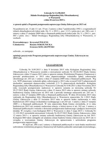 Uchwała Nr Ci.198.2015 Składu Orzekającego Regionalnej Izby Obrachunkowej w Warszawie z dnia 10 czerwca 2015 r. w sprawie opinii o Programie postępowania naprawczego Gminy Zakroczym na 2015 rok Na podstawie art. 13 pkt 13 i art. 19 ust. 2 ustawy z dnia 7 października 1992 r. o regionalnych izbach obrachunkowych (tekst jedn. Dz. U. z 2012 r., poz. 1113 z późn.zm.), art. 240 a ust. 1 ustawy z dnia 27 sierpnia 2009 roku o finansach publicznych (tekst jedn. Dz. U. z 2013 r., poz. 885 z późn. zm.) - Skład Orzekający Regionalnej Izby Obrachunkowej w Warszawie, w osobach: Przewodniczący: Krzysztof POLENS Członkowie: Renata SOKOLNICKA Ireneusz KOŁAKOWSKI uchwala , co następuje: opiniuje pozytywnie Program postępowania naprawczego Gminy Zakroczym na 2015 rok. UZASADNIENIE Uchwałą Nr 8.89.2015 z dnia 9 kwietnia 2015 roku Kolegium Regionalnej Izby Obrachunkowej w Warszawie orzekło o nieważności uchwały Nr IX/26/2015 Rady Gminy Zakroczym z dnia 12 marca 2015 roku w sprawie zmiany Wieloletniej Prognozy Finansowej z powodu przekroczenia w 2015 roku dopuszczalnego wskaźnika spłaty zobowiązań określonego art. 243 ust. 1 ustawy z dnia 27 sierpnia 2009 roku o finansach publicznych . Wg ww. WPF planowany wskaźnik spłaty zobowiązań w 2015 roku wynosił 9,64 % planowanych dochodów, natomiast dopuszczalny wskaźnik 2,71 % planowanych dochodów. Kolegium Regionalnej Izby Obrachunkowej w Warszawie Uchwałą Nr 8.90.2015 z dnia 9 kwietnia 2015 roku wszczęło postępowanie nadzorcze w sprawie uznania za nieważną uchwałę Nr IX/27/2015 Rady Gminy Zakroczym z dnia 12 marca 2015 roku w sprawie zmiany uchwały budżetowej Gminy Zakroczym na 2015 rok z powodu istotnego naruszenia art. 243 ust. 1 ustawy z dnia 27 sierpnia 2009 roku o finansach publicznych. W dniu 28 kwietnia 2015 roku wpłynęło do Regionalnej Izby Obrachunkowej w Warszawie stanowisko Nr 1/2015 Rady Gminy Zakroczym z dnia 21 kwietnia 2015 roku w sprawie braku zachowania w roku budżetowym 2015 relacji (wskaźnika) wynikającego z art.243 ust. 1 ustawy z dnia 27 sierpnia 2009 r. o finansach publicznych. W tym stanowisku Rada Gminy stwierdziła, iż w roku budżetowym 2015 nie zostanie zachowana relacja, o której mowa w art. 243 ust. 1 ustawy o finansach publicznych i wniosła o skrócenie postępowania nadzorczego i podjęcie stosownych działań. W związku z tym Kolegium RIO w Warszawie w dniu 5 maja 2015 r. Uchwałą Nr 11.122.2015 stwierdziło nieważność Uchwały Nr IX/27/2015 Rady Gminy Zakroczym z dnia 12 marca 2015 r. w sprawie zmiany uchwały budżetowej Gminy Zakroczym na rok 2015. Kolegium RIO także odstąpiło od ustalenia zmian budżetu Gminy Zakroczym na 2015 rok w związku z wezwaniem Gminy Zakroczym do opracowania i uchwalenia programu postępowania naprawczego. W myśl art. 240 a ust.1 ustawy o finansach publicznych w razie braku możliwości uchwalenia wieloletniej prognozy finansowej lub budżetu jednostki samorządu terytorialnego, zgodnie z zasadami określonymi w art. 242 - 244 ustawy o finansach publicznych oraz zagrożenia realizacji zadań publicznych przez jednostkę samorządu terytorialnego, kolegium regionalnej izby obrachunkowej wzywa jednostkę samorządu terytorialnego do opracowania i uchwalenia programu postępowania naprawczego oraz przedłożenia tego programu celem zaopiniowania do regionalnej izby obrachunkowej , w terminie 45 dni od dnia otrzymania wezwania. W dniu 5 maja 2015 roku Kolegium Regionalnej Izby Obrachunkowej w Warszawie podjęło uchwałę Nr 11.123.2015 w sprawie wezwania Gminy Zakroczym do opracowania i uchwalenia programu postępowania naprawczego. Rada Gminy Zakroczym w dniu 8 czerwca 2015 roku podjęła uchwałę Nr XIII/50/2015 w sprawie programu postępowania naprawczego Gminy Zakroczym, którą przedłożyła do Regionalnej Izby Obrachunkowej w Warszawie , Zespół Zamiejscowy w Ciechanowie w dniu 9 czerwca 2015 roku. Skład Orzekający dokonał analizy przedłożonego programu naprawczego i stwierdził co następuje. Przedstawiony przez Gminę program postępowania naprawczego zawiera: − analizę stanu finansów Gminy Zakroczym w latach 2011 - 2014, w tym: dochody, wydatki, zadłużenie, określenie przyczyn trudności finansowych; − plan przedsięwzięć naprawczych, wraz z harmonogramem ich wprowadzania; − przewidywane efekty finansowe przedsięwzięć naprawczych oraz dalsze możliwe kierunki prowadzące do poprawy sytuacji finansowej Gminy Zakroczym. Z przedłożonego Programu postępowania naprawczego, a także z dokumentów będących w posiadaniu Izby wynika, że niezachowanie w 2015 roku relacji wynikającej z art. 243 ma podłoże w realizacji budżetów w latach poprzednich. Głównym elementem wpływającym na zachowanie relacji , o której mowa wyżej jest wykonanie dochodów budżetowych w tym ze sprzedaży majątku. W latach 2013 - 2014 wykonanie dochodów kształtowało się znacznie poniżej poziomu planowanego. I tak : − w 2013 roku dochody osiągnięto na poziomie 78,03 % założonego planu, natomiast dochody ze sprzedaży majątku w kwocie 93.071,40 zł stanowiły 1,98 % planu, − w 2014 roku dochody ogółem stanowiły 87,13 % planu , a dochody ze sprzedaży majątku w wysokości 124.230,00 zł wyniosły 5,06 % planu. Sprzedaż mienia na tak bardzo niskim poziomie uzasadniono brakiem zainteresowania potencjalnych nabywców. Realizacja wydatków budżetowych w ww. latach również kształtowała się poniżej poziomu planowanego i wynosiła : w 2013 roku 78,00 % planu, w 2014 roku 90,02 % planu. Brak możliwości spłaty do końca 2014 roku kredytu w rachunku bieżącym w łącznej kwocie 952.585,39 zł, który z dniem 1 stycznia 2015 roku przekształcił się w kredyt długoterminowy oraz raty kredytu przypadającej do spłaty na dzień 31.12.2014 r. w wysokości 43.375 zł powiększające kwotę długu w istotny sposób przyczyniły się do przekroczenia w 2015 roku wskaźnika spłaty długu określonego art. 243 ustawy o f
