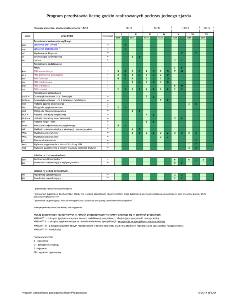 Program przedstawia liczbę godzin realizowanych podczas jednego zjazdu filologia angielska, studia niestacjonarne 11/12 przedmiot skrót 11/12 I forma zajęć 12/13 II ECTS III ECTS 13/14 IV ECTS V ECTS 14/15 VI ECTS VII ECTS ECTS Przedmioty kształcenia ogólnego 1 BHP Szkolenie BHP i PPOŻ SzB Szkolenie biblioteczne wf Wychowanie fizyczne w TI Technologia informacyjna w łac Łacina k 1 w Z w Z Z 2 Z Z 3 Z 3 E 7 O 6 O 2 Z Przedmioty podstawowe PNJA kom PNJ-komunikacja c 5 O 3 O 2 O 2 O gr p PNJ-gramatyka praktyczna c 3 O 3 O 3 O 2 O fon PNJ-fonetyka c 4 O 4 O 3 O 3 O pis PNJ-język pisany c 3 O 3 O 3 O tran PNJ-translacja c tut PNJ-tutorial c 2 Z 2 Z 2 Z 5 E 5 E 2 Z Przedmioty kierunkowe GrOF w Gramatyka opisowa - cz I fonologia w GrOM w Gramatyka opisowa - cz II składnia i morfologia w HJA Historia języka angielskiego w WdJ Wstęp do językoznawstwa w WdL Wstęp do literaturoznawstwa w HLA w Historia literatury angielskiej w HLAm w Historia literatury amerykańskiej w HA Historia Anglii i USA w WokA Wiedza o krajach obszaru językowego w AK Wykład z zakresu wiedzy o akwizycji i nauce języków w 4 Z WM Wykład monograficzny w 2 Z WM Wykład monograficzny w pa Pisanie akademickie WzU Wybrane zagadnienia z historii i kultury USA WzB Wybrane zagadnienia z historii i kultury Wielkiej Brytanii w sem PU Seminarium licencjackie 2 Przedmiot uzupełniający wg specjalności PU PU 3 E 2 Z w 1 Z w 2 Z 2 Z 6 Z 2 Z 2 5 Z 4 E 5 E 2 Z 3 E 2 Z E 2 Z 2 Z ścieżka nr 1 (z seminarium) c 6 Z w 2 Z Przedmiot uzupełniający w 2 Z Przedmiot uzupełniający w 2 Z 3 2 Z ścieżka nr 2 (bez seminarium) 1 przedmioty realizowane jednorazowo 2 seminarium dyplomowe dla studentów, którzy nie realizują specjalizacji nauczycielskiej i praca dyplomowa powinna być złożona na zakończenie sem VI wymiar puntów ECTS zostaje powiększony o 10 3 przedmiot uzupełniający: Wykład monograficzny z dziedziny związanej z seminarium licencjackim Praktyki powinny trwać nie krócej niż 4 tygodnie. Wykaz przedmiotów realizowanych w ramach poszczególnych wariantów znajduje się w osobnych programach WARIANT I - z drugim językiem obcym w ramach dodatkowej specjalizacji, obejmujący specjalność nauczycielską WARIANT II - z drugim językiem obcym w ramach dodatkowej specjalizacji i rezygnacja ze specjalności nauczycielskiej WARIANT III - z drugim językiem obcym realizowanym w formie lektoratu na II roku studiów i rezygnacja ze specjalności nauczycielskiej WARIANT IV - moduł plus Forma zaliczenia: Z - zaliczenie, O - zaliczenie z oceną, E - egzamin, ED - egzamin dyplomowy Program uaktualniono posiedzeniu Rady Programowej © 2011 WSJO