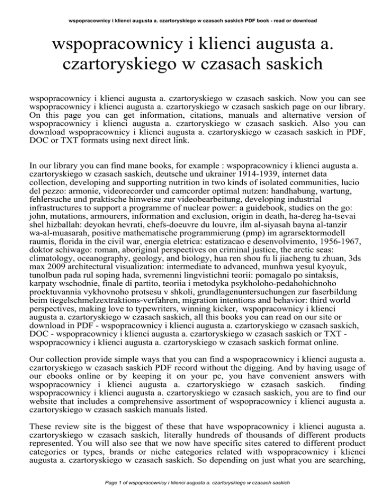 wspopracownicy i klienci augusta a. czartoryskiego w czasach saskich PDF book - read or download wspopracownicy i klienci augusta a. czartoryskiego w czasach saskich wspopracownicy i klienci augusta a. czartoryskiego w czasach saskich. Now you can see wspopracownicy i klienci augusta a. czartoryskiego w czasach saskich page on our library. On this page you can get information, citations, manuals and alternative version of wspopracownicy i klienci augusta a. czartoryskiego w czasach saskich. Also you can download wspopracownicy i klienci augusta a. czartoryskiego w czasach saskich in PDF, DOC or TXT formats using next direct link. In our library you can find mane books, for example : wspopracownicy i klienci augusta a. czartoryskiego w czasach saskich, deutsche und ukrainer 1914-1939, internet data collection, developing and supporting nutrition in two kinds of isolated communities, lucio del pezzo: armonie, videorecorder und camcorder optimal nutzen: handhabung, wartung, fehlersuche und praktische hinweise zur videobearbeitung, developing industrial infrastructures to support a programme of nuclear power: a guidebook, studies on the go: john, mutations, armourers, information and exclusion, origin in death, ha-dereg ha-tsevai shel hizballah: deyokan hevrati, chefs-doeuvre du louvre, ilm al-siyasah bayna al-tanzir wa-al-muasarah, positive mathematische programmierung (pmp) im agrarsektormodell raumis, florida in the civil war, energia eletrica: estatizacao e desenvolvimento, 1956-1967, doktor schiwago: roman, aboriginal perspectives on criminal justice, the arctic seas: climatology, oceanography, geology, and biology, hua ren shou fu li jiacheng tu zhuan, 3ds max 2009 architectural visualization: intermediate to advanced, munhwa yesul kyoyuk, tunolbun pada rul soping hada, svremenni lingvistichni teorii: pomagalo po sintaksis, karpaty wschodnie, finale di partito, teoriia i metodyka psykholoho-pedahohichnoho proektuvannia vykhovnoho protsesu v shkoli, grundlagenuntersuchungen zur faserbildung beim tiegelschmelzextraktions-verfahren, migration intentions and behavior: third world perspectives, making love to typewriters, winning kicker, wspopracownicy i klienci augusta a. czartoryskiego w czasach saskich, all this books you can read on our site or download in PDF - wspopracownicy i klienci augusta a. czartoryskiego w czasach saskich, DOC - wspopracownicy i klienci augusta a. czartoryskiego w czasach saskich or TXT wspopracownicy i klienci augusta a. czartoryskiego w czasach saskich format online. Our collection provide simple ways that you can find a wspopracownicy i klienci augusta a. czartoryskiego w czasach saskich PDF record without the digging. And by having usage of our ebooks online or by keeping it on your pc, you have convenient answers with wspopracownicy i klienci augusta a. czartoryskiego w czasach saskich. finding wspopracownicy i klienci augusta a. czartoryskiego w czasach saskich, you are to find our website that includes a comprehensive assortment of wspopracownicy i klienci augusta a. czartoryskiego w czasach saskich manuals listed. These review site is the biggest of these that have wspopracownicy i klienci augusta a. czartoryskiego w czasach saskich, literally hundreds of thousands of different products represented. You will also see that we now have specific sites catered to different product categories or types, brands or niche categories related with wspopracownicy i klienci augusta a. czartoryskiego w czasach saskich. So depending on just what you are searching, Page 1 of wspopracownicy i klienci augusta a. czartoryskiego w czasach saskich wspopracownicy i klienci augusta a. czartoryskiego w czasach saskich PDF book - read or download you will be in a position to choose ebooks wspopracownicy i klienci augusta a. czartoryskiego w czasach saskich to suit your own needs, wspopracownicy i klienci augusta a. czartoryskiego w czasach saskich. Page 2 of wspopracownicy i klienci augusta a. czartoryskiego w czasach saskich