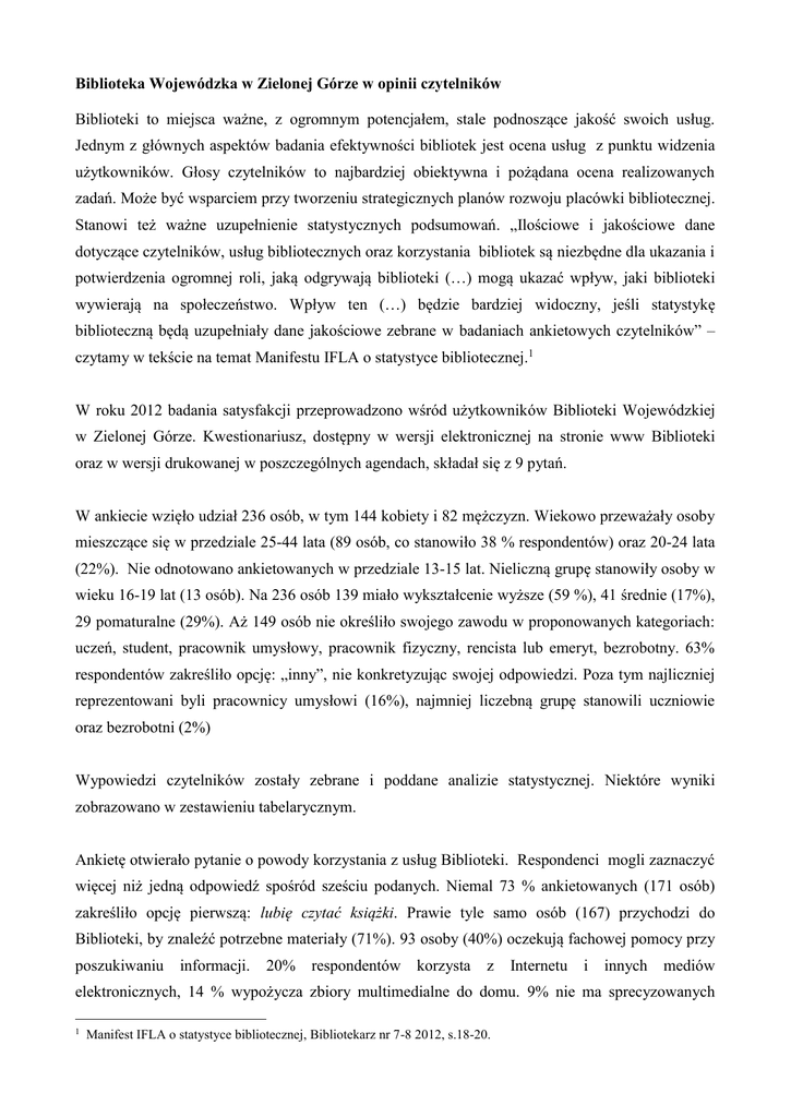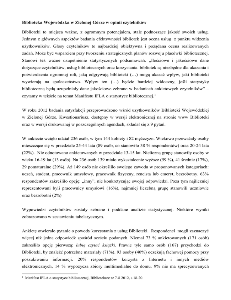 Biblioteka Wojewódzka w Zielonej Górze w opinii czytelników Biblioteki to miejsca ważne, z ogromnym potencjałem, stale podnoszące jakość swoich usług. Jednym z głównych aspektów badania efektywności bibliotek jest ocena usług z punktu widzenia użytkowników. Głosy czytelników to najbardziej obiektywna i pożądana ocena realizowanych zadań. Może być wsparciem przy tworzeniu strategicznych planów rozwoju placówki bibliotecznej. Stanowi też ważne uzupełnienie statystycznych podsumowań. „Ilościowe i jakościowe dane dotyczące czytelników, usług bibliotecznych oraz korzystania bibliotek są niezbędne dla ukazania i potwierdzenia ogromnej roli, jaką odgrywają biblioteki (…) mogą ukazać wpływ, jaki biblioteki wywierają na społeczeństwo. Wpływ ten (…) będzie bardziej widoczny, jeśli statystykę biblioteczną będą uzupełniały dane jakościowe zebrane w badaniach ankietowych czytelników” – czytamy w tekście na temat Manifestu IFLA o statystyce bibliotecznej.1 W roku 2012 badania satysfakcji przeprowadzono wśród użytkowników Biblioteki Wojewódzkiej w Zielonej Górze. Kwestionariusz, dostępny w wersji elektronicznej na stronie www Biblioteki oraz w wersji drukowanej w poszczególnych agendach, składał się z 9 pytań. W ankiecie wzięło udział 236 osób, w tym 144 kobiety i 82 mężczyzn. Wiekowo przeważały osoby mieszczące się w przedziale 25-44 lata (89 osób, co stanowiło 38 % respondentów) oraz 20-24 lata (22%). Nie odnotowano ankietowanych w przedziale 13-15 lat. Nieliczną grupę stanowiły osoby w wieku 16-19 lat (13 osób). Na 236 osób 139 miało wykształcenie wyższe (59 %), 41 średnie (17%), 29 pomaturalne (29%). Aż 149 osób nie określiło swojego zawodu w proponowanych kategoriach: uczeń, student, pracownik umysłowy, pracownik fizyczny, rencista lub emeryt, bezrobotny. 63% respondentów zakreśliło opcję: „inny”, nie konkretyzując swojej odpowiedzi. Poza tym najliczniej reprezentowani byli pracownicy umysłowi (16%), najmniej liczebną grupę stanowili uczniowie oraz bezrobotni (2%) Wypowiedzi czytelników zostały zebrane i poddane analizie statystycznej. Niektóre wyniki zobrazowano w zestawieniu tabelarycznym. Ankietę otwierało pytanie o powody korzystania z usług Biblioteki. Respondenci mogli zaznaczyć więcej niż jedną odpowiedź spośród sześciu podanych. Niemal 73 % ankietowanych (171 osób) zakreśliło opcję pierwszą: lubię czytać książki. Prawie tyle samo osób (167) przychodzi do Biblioteki, by znaleźć potrzebne materiały (71%). 93 osoby (40%) oczekują fachowej pomocy przy poszukiwaniu informacji. 20% respondentów korzysta z Internetu i innych mediów elektronicznych, 14 % wypożycza zbiory multimedialne do domu. 9% nie ma sprecyzowanych 1 Manifest IFLA o statystyce bibliotecznej, Bibliotekarz nr 7-8 2012, s.18-20. celów, ale „ma dużo wolnego czasu”. W pytaniu drugim respondenci określali, z jakich usług Biblioteki korzystają. 85 % (199 osób) wypożycza książki do domu z Wypożyczalni Głównej. 64 % (151 osób) korzysta ze zbiorów na miejscu, przy czym najczęściej odwiedzana jest Czytelnia Ogólna (135 osób), Czytelnia Prasy (69 osób) oraz Dział Informacji Naukowej i Regionalnej (48 osób). 60 osób korzysta z dostępu do darmowego Internetu, w tym 56% z internetu bezprzewodowego, a 38 % wykorzystuje do tego celu biblioteczne komputery. 65 osób sięga do katalogów książek i czasopism, 45 korzysta z baz danych, z czego 54 % z Wirtualnej Czytelni Norwida, 37 % z Bibliografii Ziemi Lubuskiej, 35 % z elektronicznych wydań czasopism, 56 % z Zielonogórskiej Biblioteki Cyfrowej. Dodatkowo ankietowani podkreślali, że odwiedzają również filie miejskie, korzystając z ich zasobów. Przy pytaniu trzecim: Jak ocenia pan(i) zbiory Biblioteki Wojewódzkiej, ich przydatność i aktualność?, ankietowani mieli możliwość wyboru odpowiedzi, przy czym proszeni byli o uzasadnienie oceny dostatecznej lub niedostatecznej. Niemal połowa badanych (46%) określiła aktualność i przydatność zbiorów jako dobrą, 36% oceniło zasoby bardzo dobrze. 35. czytelników zaznaczyło odpowiedź: dostateczna lub niedostateczna. Najniższe oceny uzasadniano przede wszystkim zbyt małą liczbą egzemplarzy przeznaczonych do wypożyczania oraz niedostateczną ilością nowości. Kolejne pytanie dotyczyło funkcjonującego w bibliotece systemu komputerowego. Czy Pana(i) zdaniem katalogi komputerowe i możliwość poszukiwania i zamawiania dokumentów bibliotecznych drogą elektroniczną to: liczba osób % ułatwienie 202 86 % utrudnienie 4 2% nie korzystam 21 9% nie mam zadania 3 1% Jak wynika z analizy tabeli, zdecydowana większość odpowiedziała, że katalogi komputerowe stanowią ułatwienie. Jedynie niewielka część badanych jest przeciwnego zdania (2 %). Jaka jest Pana(i) ocena wyposażenia technicznego Biblioteki Wojewódzkiej (komputery, kserografy, drukarki, skanery i inne)? liczba osób % bardzo dobra 60 25 % dobra 119 50 % dostateczna 32 14 % niedostateczna 6 3% 50% użytkowników dobrze ocenia wyposażenie techniczne Biblioteki Wojewódzkiej, 25% uważa twierdzi, iż wyposażenie techniczne placówki jest je za bardzo dobre. Zaledwie 3 % niedostateczne. Na pytanie: czego brakuje? narzekano na psujące się kserokopiarki, małą ilość komputerów stacjonarnych oraz laptopów, z których można korzystać z Internetu, niesprawne skanery. Życzono sobie bezpłatnych usług kserograficznych. W ankiecie znalazło się też zapytanie bezpośrednio dotyczące pracowników. Respondenci oceniali obsługę w poszczególnych działach w skali od 1 do 6. Czy jest Pan(i) zadowolony(a) z obsługi bibliotekarzy w poszczególnych działach Biblioteki? Dział ocena 6 ocena 5 ocena 4 ocena 3 ocena 2 ocena 1 liczba osób oceniających Informacja Katalogowa 39 36 23 7 1 0 106 Wypożyczalnia Główna 114 64 12 5 1 0 196 Wypożyczalnia Obcojęzyczna 12 16 8 4 2 4 46 Dział In