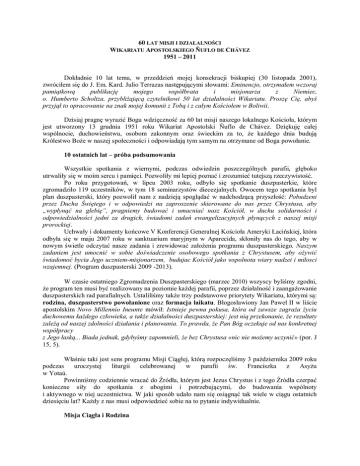 60 LAT MISJI I DZIAŁALNOŚCI WIKARIATU APOSTOLSKIEGO ÑUFLO DE CHÁVEZ 1951 – 2011 Dokładnie 10 lat temu, w przeddzień mojej konsekracji biskupiej (30 listopada 2001), zwróciłem się do J. Em. Kard. Julio Terrazas następującymi słowami: Eminencjo, otrzymałem wczoraj pamiątkową publikację mojego współbrata i misjonarza z Niemiec, o. Humberto Scholtza, przybliżającą czytelnikowi 50 lat działalności Wikariatu. Proszę Cię, abyś przyjął to opracowanie na znak mojej komunii z Tobą i z całym Kościołem w Boliwii. Dzisiaj pragnę wyrazić Bogu wdzięczność za 60 lat misji naszego lokalnego Kościoła, którym jest utworzony 13 grudnia 1951 roku Wikariat Apostolski Ñuflo de Chávez. Dziękuję całej wspólnocie, duchowieństwu, osobom zakonnym oraz świeckim za to, że każdego dnia budują Królestwo Boże w naszej społeczności i odpowiadają tym samym na otrzymane od Boga powołanie. 10 ostatnich lat – próba podsumowania Wszystkie spotkania z wiernymi, podczas odwiedzin poszczególnych parafii, głęboko utrwaliły się w moim sercu i pamięci. Pozwoliły mi lepiej poznać i zrozumieć tutejszą rzeczywistość. Po roku przygotowań, w lipcu 2003 roku, odbyło się spotkanie duszpasterkie, które zgromadziło 119 uczestników, w tym 18 seminarzystów diecezjalnych. Owocem tego spotkania byl plan duszpasterski, który pozwolił nam z nadzieją spoglądać w nadchodzącą przyszłość: Pobudzeni przez Ducha Świętego i w odpowiedzi na zaproszenie skierowane do nas przez Chrystusa, aby „wypłynąć na głebię”, pragniemy budować i umacniać nasz Kościół, w duchu solidarności i odpowiedzialności jedni za drugich, świadomi zadań ewangelizacyjnych płynących z naszej misji prorockiej. Uchwały i dokumenty końcowe V Konferencji Generalnej Kościoła Ameryki Łacińskiej, która odbyła się w maju 2007 roku w sanktuarium maryjnym w Aparecida, skłoniły nas do tego, aby w nowym świetle odczytać nasze zadania i zrewidować założenia programu duszpasterskiego. Naszym zadaniem jest umocnić w sobie doświadczenie osobowego spotkania z Chrystusem, aby ożywić świadomoć bycia Jego uczniem-misjonarzem, budujac Kościół jako wspolnota wiary nadzei i milosci wzajemnej. (Program duszpasterski 2009 -2013). W czasie ostatniego Zgromadzenia Duszpasterskiego (marzec 2010) wszyscy byliśmy zgodni, że program ten musi być realizowany na poziomie każdej parafii, poprzez działalność i zaangażowanie duszpasterskich rad parafialnych. Ustaliliśmy także trzy podstawowe priorytety Wikariatu, którymi są: rodzina, duszpasterstwo powołanione oraz formacja laikatu. Błogosławiony Jan Paweł II w liście apostolskim Novo Millennio Ineunte mówił: Istnieje pewna pokusa, która od zawsze zagraża życiu duchowemu każdego człowieka, a także działalności duszpasterskiej: jest nią przekonanie, że rezultaty zależą od naszej zdolności działania i planowania. To prawda, że Pan Bóg oczekuje od nas konkretnej współpracy z Jego łaską... Biada jednak, gdybyśmy zapomnieli, że bez Chrystusa «nic nie możemy uczynić» (por. J 15, 5). Właśnie taki jest sens programu Misji Ciągłej, którą rozpoczęliśmy 3 października 2009 roku podczas uroczystej liturgii celebrowanej w parafii św. Franciszka z Asyżu w Yotaú. Powinniśmy codziennie wracać do Źródła, którym jest Jezus Chrystus i z tego Źródła czerpać konieczne siły do spotkania z ubogimi i potrzebującymi, do budowania wspólnoty i aktywnego w niej uczestnictwa. W jaki sposób udało nam się osiągnąć tak wiele w ciągu ostatnich dziesięciu lat? Każdy z nas musi odpowiedzieć sobie na to pytanie indywidualnie. Misja Ciągła i Rodzina Obecnie rodzina jest poważnie zagrożona w swojej tożsamości i powołaniu. Najdotkliwiej odczuwają to dzieci i młodzież, które często pozostawione są same sobie. Porzucane przez rodziców doświadczają samotności i cierpienia. W naszym kraju radykalnie spada ilość zawieranych, sakramentalnych związków małżeńskich. Powiększa się zaś ilość osób żyjących w luźnych i niezobowiązujących relacjach. Gwałtownie wzrasta również ilość separacji i rozwodów. Te czynniki bardzo mocno wpływają na nasze życie osobiste, rodzinne i społeczne (Orędzie Konferencji Episkopatu Boliwijskiego, listopad 2011). Z tego powodu zwróciliśmy szczególną uwagę na formację i duszpasterstwo rodzin, jednak długa przed nami droga, aby działalność ta była właściwie realizowana i promowana na szczeblu każdej parafii. Jeszcze kilka lat temu katecheza przygotowująca rodziców była o wiele bardziej rozbudowana. W wyniku wciąż postępującego procesu rozpadu rodziny można zauważyć, że zaangażowanie rodziców w katechezy spada. Warto wiec postawic sobie to pytanie: Jak rozwija się katecheza rodzin oraz duszpasterstwo w mojej parafii? Misja Ciągła i Duszpasterstwo Powołaniowe Kościół w Ameryce Łacińskiej od wielu lat aktywnie realizuje program duszpasterstwa młodzieży, która jest naszym największym bogactwem, a także najbardziej podatną na różnego rodzaju zagrożenia grupą wiekową (Orędzie Konferencji Episkopatu Boliwijskiego). Optymizmem napawa fakt, że w ostatnich latach bardzo prężnie rozwija się duszpasterstwo dzieci i młodzieży. Obecnie w Wikariacie działa 26 grup Apostolstwa Dzieciectwa Misyjnego. Jest to nadzieją całego lokalnego Kościoła. Niektóre dzieci z upływem lat przechodzą do grup młodzieżowych i stają się pełnymi entuzjazmu, młodymi animatorami swoich rówieśników. Nie sposób zapomnieć o działalności ruchu oazowego Światło i Życie. Pod koniec każdego roku, podczas dziewięciodniowych rekolekcji, młodzież ze wszystkich parafii Wikariatu, ma okazję przeżyć czas rekolekcji i formacji duchowej. Wracając do własnych parafii młodzi stają się prężnym narzędziem duszpasterskim, pełnym wiary i radości, dobrze przygotowanym do animowania celebracji liturgi