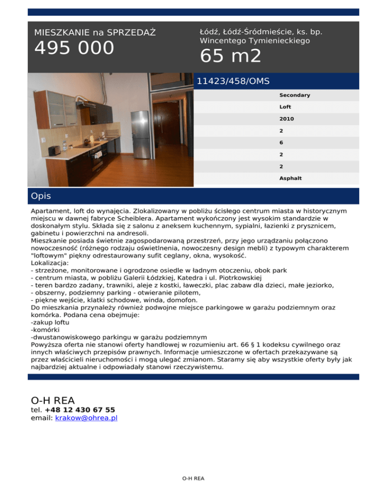 MIESZKANIE na SPRZEDAŻ 495 000 Łódź, Łódź-Śródmieście, ks. bp. Wincentego Tymienieckiego 65 m2 11423/458/OMS Secondary Loft 2010 2 6 2 2 Asphalt Opis Apartament, loft do wynajęcia. Zlokalizowany w pobliżu ścisłego centrum miasta w historycznym miejscu w dawnej fabryce Scheiblera. Apartament wykończony jest wysokim standardzie w doskonałym stylu. Składa się z salonu z aneksem kuchennym, sypialni, łazienki z prysznicem, gabinetu i powierzchni na andresoli. Mieszkanie posiada świetnie zagospodarowaną przestrzeń, przy jego urządzaniu połączono nowoczesność (różnego rodzaju oświetlnenia, nowoczesny design mebli) z typowym charakterem "loftowym" piękny odrestaurowany sufit ceglany, okna, wysokość. Lokalizacja: - strzeżone, monitorowane i ogrodzone osiedle w ładnym otoczeniu, obok park - centrum miasta, w pobliżu Galerii Łódzkiej, Katedra i ul. Piotrkowskiej - teren bardzo zadany, trawniki, aleje z kostki, ławeczki, plac zabaw dla dzieci, małe jeziorko, - obszerny, podziemny parking - otwieranie pilotem, - piękne wejście, klatki schodowe, winda, domofon. Do mieszkania przynależy również podwojne miejsce parkingowe w garażu podziemnym oraz komórka. Podana cena obejmuje: -zakup loftu -komórki -dwustanowiskowego parkingu w garażu podziemnym Powyższa oferta nie stanowi oferty handlowej w rozumieniu art. 66 § 1 kodeksu cywilnego oraz innych właściwych przepisów prawnych. Informacje umieszczone w ofertach przekazywane są przez właścicieli nieruchomości i mogą ulegać zmianom. Staramy się aby wszystkie oferty były jak najbardziej aktualne i odpowiadały stanowi rzeczywistemu. O-H REA tel. +48 12 430 67 55 email: [email protected] O-H REA Powered by TCPDF (www.tcpdf.org)
