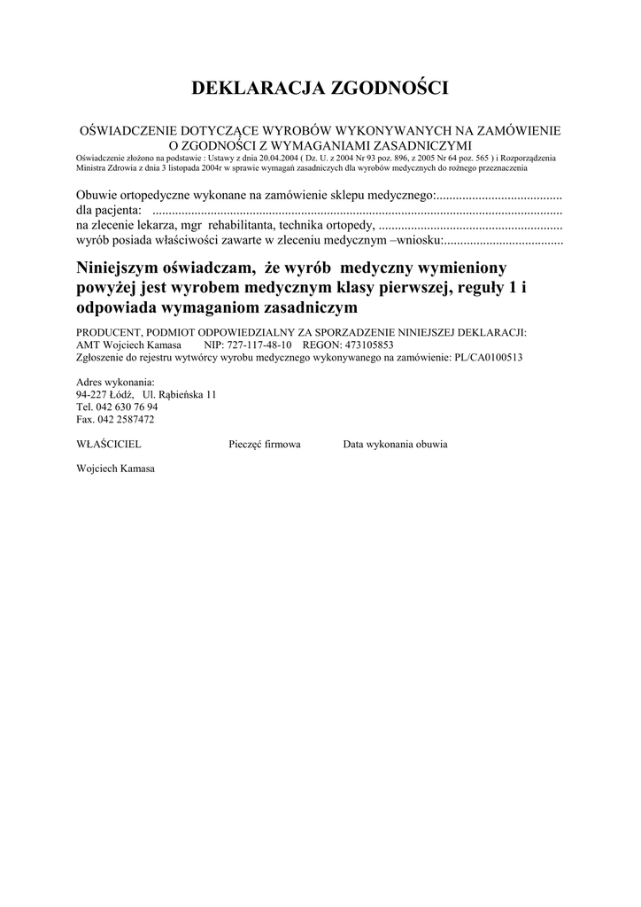 DEKLARACJA ZGODNOŚCI OŚWIADCZENIE DOTYCZĄCE WYROBÓW WYKONYWANYCH NA ZAMÓWIENIE O ZGODNOŚCI Z WYMAGANIAMI ZASADNICZYMI Oświadczenie złożono na podstawie : Ustawy z dnia 20.04.2004 ( Dz. U. z 2004 Nr 93 poz. 896, z 2005 Nr 64 poz. 565 ) i Rozporządzenia Ministra Zdrowia z dnia 3 listopada 2004r w sprawie wymagań zasadniczych dla wyrobów medycznych do rożnego przeznaczenia Obuwie ortopedyczne wykonane na zamówienie sklepu medycznego:....................................... dla pacjenta: ............................................................................................................................... na zlecenie lekarza, mgr rehabilitanta, technika ortopedy, ......................................................... wyrób posiada właściwości zawarte w zleceniu medycznym –wniosku:..................................... Niniejszym oświadczam, że wyrób medyczny wymieniony powyżej jest wyrobem medycznym klasy pierwszej, reguły 1 i odpowiada wymaganiom zasadniczym PRODUCENT, PODMIOT ODPOWIEDZIALNY ZA SPORZADZENIE NINIEJSZEJ DEKLARACJI: AMT Wojciech Kamasa NIP: 727-117-48-10 REGON: 473105853 Zgłoszenie do rejestru wytwórcy wyrobu medycznego wykonywanego na zamówienie: PL/CA0100513 Adres wykonania: 94-227 Łódź, Ul. Rąbieńska 11 Tel. 042 630 76 94 Fax. 042 2587472 WŁAŚCICIEL Wojciech Kamasa Pieczęć firmowa Data wykonania obuwia
