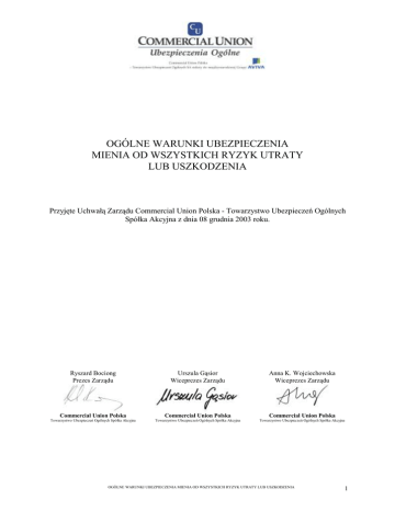 OGÓLNE WARUNKI UBEZPIECZENIA MIENIA OD WSZYSTKICH RYZYK UTRATY LUB USZKODZENIA Przyjęte Uchwałą Zarządu Commercial Union Polska - Towarzystwo Ubezpieczeń Ogólnych Spółka Akcyjna z dnia 08 grudnia 2003 roku. Ryszard Bociong Prezes Zarządu Urszula Gąsior Wiceprezes Zarządu Anna K. Wojciechowska Wiceprezes Zarządu Commercial Union Polska Commercial Union Polska Commercial Union Polska Towarzystwo Ubezpieczeń Ogólnych Spółka Akcyjna Towarzystwo Ubezpieczeń Ogólnych Spółka Akcyjna Towarzystwo Ubezpieczeń Ogólnych Spółka Akcyjna OGÓLNE WARUNKI UBEZPIECZENIA MIENIA OD WSZYSTKICH RYZYK UTRATY LUB USZKODZENIA 1 SPIS TREŚCI Postanowienia wstępne ..................................................................................................... Definicje ............................................................................................................................. Przedmiot ubezpieczenia ................................................................................................... Miejsce ubezpieczenia ........................................................................................................ Zakres ubezpieczenia ........................................................................................................ Suma ubezpieczenia .......................................................................................................... System ubezpieczenia ........................................................................................................ Wyłączenia ogólne ............................................................................................................ Wyłączenia szczegółowe .................................................................................................. Zawarcie umowy ubezpieczenia ....................................................................................... Składka ubezpieczeniowa ................................................................................................ Czas trwania umowy ubezpieczenia .................................................................................. Obowiązki ubezpieczającego ............................................................................................ Tryb dochodzenia roszczeń .............................................................................................. Ustalenie wysokości szkody .............................................................................................. Ustalenie wysokości odszkodowania ................................................................................ Wypłata odszkodowania ................................................................................................... Płatnicy podatków pośrednich ............................................................................................ Zabezpieczenie prawa do regresu ..................................................................................... Postanowienia dodatkowe ................................................................................................ Właściwość sądowa .......................................................................................................... Postanowienia końcowe ..................................................................................................... OGÓLNE WARUNKI UBEZPIECZENIA MIENIA OD WSZYSTKICH RYZYK UTRATY LUB USZKODZENIA 3 3 4 4 5 5 5 6 6 7 8 8 9 9 10 10 11 11 11 11 11 11 2 OGÓLNE WARUNKI UBEZPIECZENIA MIENIA OD WSZYSTKICH RYZYK UTRATY LUB USZKODZENIA §1. Postanowienia wstępne 1. 2. Niniejsze ogólne warunki ubezpieczenia mienia od wszystkich ryzyk utraty lub uszkodzenia (zwane dalej ogólnymi warunkami) stanowią podstawę do zawierania umów ubezpieczenia mienia od wszystkich ryzyk utraty lub uszkodzenia pomiędzy Commercial Union Polska Towarzystwem Ubezpieczeń Ogólnych SA (zwanym dalej Commercial Union) a osobami fizycznymi, osobami prawnymi lub jednostkami organizacyjnymi nieposiadającymi osobowości prawnej (zwanymi dalej Ubezpieczającym). Umowa ubezpieczenia może zostać zawarta również na rzecz innej osoby (Ubezpieczonego). W takim przypadku postanowienia niniejszych ogólnych warunków dotyczące Ubezpieczającego mają zastosowanie odpowiednio do osoby, na rzecz której zawarto umowę. 9) 10) 11) §2. Definicje Ilekroć w niniejszych ogólnych warunkach, wniosku o zawarcie umowy ubezpieczenia, a także polisie lub innym dokumencie potwierdzającym zawarcie umowy ubezpieczenia oraz w innych pismach i oświadczeniach składanych w związku z zawarciem lub wykonywaniem tej umowy używa się wymienionych poniżej terminów, należy przez nie rozumieć: 1) Mienie Przedmioty materialne oraz nakłady adaptacyjne. 2) Budynki Obiekty budowlane, które są trwale związane z gruntem, wydzielone z przestrzeni za pomocą przegród budowlanych, posiadające fundamenty i dach, wraz z wbudowanymi instalacjami, urządzeniami technicznymi oraz zainstalowanymi na stałe elementami wykończeniowymi, stanowiącymi całość techniczną i użytkową. 3) Budowle Obiekty budowlane inne niż budynki, wraz z instalacjami i urządzeniami, stanowiące całość techniczną i użytkową; niniejsza kategoria mienia obejmuje m.in. instalacje wodociągowe, ściekowe, gazowe i elektryczne, liczniki, kable i przewody łączące obiekty zlokalizowane w obrębie miejsca ubezpieczenia ze stacjami rozdzielczymi sieci publicznej. 4) Maszyny, urządzenia, wyposażenie Wszystkie rzeczy ruchome wykorzystywane przez Ubezpieczającego w prowadzeniu działalności, z wyłączeniem niskocennych składników majątku. 5) Nakłady adaptacyjne Koszty remontów kapitalnych, częściowych lub prac adaptacyjnych w budynkach oraz pomieszczeniach niestanowiących własności Ubezpieczającego, poniesione w celu dostosowania ich do potrzeb prowadzonej działalności lub podniesienia standardu. 6) Niskocenne składniki majątku Maszyny, urządzenia i 