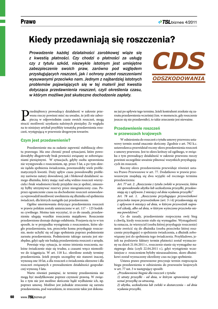 Prawo TSL biznes 4/2011 Kiedy przedawniają się roszczenia? Prowadzenie każdej działalności zarobkowej wiąże się z kwestią płatności. Czy chodzi o płatności za usługę czy z tytułu szkód, niezwykle istotnym jest umiejętne zabezpieczenie swoich praw, zarówno pod względem przysługujących roszczeń, jak i ochrony przed roszczeniami wysuwanymi przeciwko nam. Jednym z najbardziej istotnych problemów pojawiających się w tej materii jest kwestia dotycząca przedawnienia roszczeń, czyli określenia czasu, w którym możliwe jest skuteczne dochodzenie zapłaty. P rzedsiębiorcy prowadzący działalność w zakresie przewozu rzeczy powinni mieć na uwadze, że jeśli nie zabezpieczą w odpowiednim czasie swoich roszczeń, mogą stracić możliwość uzyskania należnych pieniędzy. Ze względu na to niniejszy artykuł przybliży tematykę przedawnienia roszczeń, występującą w przewozie drogowym towarów. Czym jest przedawnienie? Przedawnienie ma za zadanie zapewnić stabilizację obrotu prawnego. Ma ono chronić przed sytuacjami, które powodowałyby długotrwały brak pewności związany ze zobowiązaniami pieniężnymi. W sytuacjach, gdyby osoba uprawniona nie występowała z roszczeniem, np. przez 5 lat, a po tym okresie żądała spełnienia świadczenia, powstawałoby wiele problematycznych kwestii. Duży upływ czasu powodowałby problemy zarówno natury dowodowej, jak i blokował działalność samego dłużnika, który mając nad sobą widmo roszczeń wierzyciela i brak wiadomości kiedy przyjdzie mu je spełnić, zmuszony byłby utrzymywać rezerwy przez nieograniczony czas. Poprzez ograniczenie czasu na dochodzenie roszczeń ustawodawca wprowadził możliwość uwolnienia się dłużnika od spełnienia świadczeń, dla których nastąpiło już przedawnienie. Ogólne unormowania dotyczące przedawnienia roszczeń w prawie polskim zostały umieszczone w art. 117 – 125 kodeksu cywilnego. Można tam wyczytać, iż co do zasady, przedawnieniu ulegają wszelkie roszczenia majątkowe. Roszczenie przedawnione doznaje dużego osłabienia. Przejawia się to w ten sposób, że w przypadku wystąpienia z roszczeniem, które uległo przedawnieniu, ten, przeciwko komu przysługuje roszczenie, może uchylić się od jego spełnienia poprzez podniesienie zarzutu przedawnienia. Podniesienie takiego zarzutu jest niezbędne, gdyż sądy nie badają przedawnienia roszczeń z urzędu. Powstaje więc sytuacja, że mimo istnienia roszczenia, należne świadczenie staje się trudne, a czasami wręcz niemożliwe do ściągnięcia. W art. 118 k.c. określone zostały terminy przedawnienia. Jeżeli przepis szczególny nie stanowi inaczej, wynoszą one 10 lat, a dla roszczeń o świadczenia okresowe i dla roszczeń związanych z prowadzeniem działalności gospodarczej wynoszą 3 lata. Warto również pamiętać, że terminy przedawnienia nie mogą być modyfikowane poprzez czynność prawną. W związku z tym nie jest możliwe skrócenie bądź wydłużenie ich, np. poprzez umowę. Możliwe jest jednakże zrzeczenie się zarzutu przedawnienia, pod warunkiem, że zrzeczenie takie jest dokona60 www.TSL biznes.pl ne już po upływie tego terminu. Jeżeli kontrahent zrzeknie się zarzutu przedawnienia wcześniej (tzn. w momencie, gdy roszczenie jeszcze się nie przedawniło), to takie zrzeczenie jest nieważne. Przedawnienie roszczeń w przewozach krajowych W odniesieniu do roszczeń z tytułu umowy przewozu ustawowy termin został znacznie skrócony. Zgodnie z art. 792 k.c. ustawodawca przewidział roczny okres przedawnienia roszczeń z umowy przewozu. Jest to okres krótszy od ogólnego, w związku z tym prowadzący działalność w zakresie przewozu rzeczy powinni szczególnie uważnie pilnować wszystkich przysługujących im roszczeń. Roczny okres przedawnienia przewiduje również ustawa Prawo Przewozowe w art. 77. Dodatkowo w prawie przewozowym znajdują się dwa wyjątki od rocznego terminu przedawnienia: Art. 77 ust. 2. „Roszczenia z tytułu zwłoki w przewozie, która nie spowodowała ubytku lub uszkodzenia przesyłki, przedawniają się z upływem 2 miesięcy od dnia wydania przesyłki.” Art. 78 ust. 1. „Roszczenia przysługujące przewoźnikowi przeciwko innym przewoźnikom (art. 5 i 6) przedawniają się z upływem 6 miesięcy od dnia, w którym przewoźnik naprawił szkodę, albo od dnia, w którym wytoczono przeciwko niemu powództwo.” Co do zasady, przedawnienie rozpoczyna swój bieg z chwilą, kiedy roszczenie stało się wymagalne. Wymagalność ta oznacza, że wierzyciel (osoba której przysługuje roszczenie) może zwrócić się do dłużnika (osoba przeciwko której roszczenie przysługuje) o spełnienie świadczenia, a dłużnik zobowiązany jest do spełnienia tego świadczenia. Przykładowo, jeżeli na podstawie faktury termin płatności został wyznaczony na dzień 21.04.2011 r., roszczenie stanie się wymagalne następnego dnia (czyli 22.04.2011 r.), gdyż wystąpienie wcześniejsze z roszczeniem byłoby nieuzasadnione, skoro dłużnikowi został wyznaczony określony czas na jego spełnienie. Ustawa prawo przewozowe precyzuje termin rozpoczęcia biegu przedawnienia w odniesieniu do przewozów krajowych w art. 77 ust. 3 w następujący sposób: „Przedawnienie biegnie dla roszczeń z tytułu: 1) utraty przesyłki - od dnia, w którym uprawniony mógł uznać przesyłkę za utraconą, 2) ubytku, uszkodzenia lub zwłoki w dostarczeniu – od dnia wydania przesyłki, Prawo TSL biznes 4/2011 3) szkód nie dających się z zewnątrz zauważyć – od dnia protokolarnego ustalenia szkody, 4) zapłaty lub zwrotu należności – od dnia zapłaty, a gdy jej nie było - od dnia, w którym powinna była nastąpić, 5) niedoboru lub nadwyżki przy likwidacji przesyłek – od dnia dokonania likwidacji, 6) innych zdarzeń prawnych – od dnia, w którym roszczenie stało się wymagalne.” Pokazuje to, że w zależności od podstawy roszczenia, powstają w rzecz