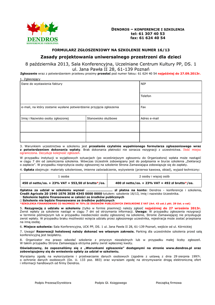 DENDROS – KONFERENCJE I SZKOLENIA tel: 61 307 40 53 fax: 61 624 40 54 FORMULARZ ZGŁOSZENIOWY NA SZKOLENIE NUMER 16/13 Zasady projektowania uniwersalnego przestrzeni dla dzieci 8 października 2013, Sala Konferencyjna, Uczelniane Centrum Kultury PP, DS. 1 ul. Jana Pawła II 28, 61-139 Poznań Zgłoszenie wraz z potwierdzeniem przelewu prosimy przesłać pod numer faksu: 61 624 40 54 najpóźniej do 27.09.2013r. 1. Zgłaszający Dane do wystawienia faktury NIP Telefon e-mail, na który zostanie wysłane potwierdzenie przyjęcia zgłoszenia Fax Imię i Nazwisko osoby zgłoszonej Adres e-mail Stanowisko słuŜbowe 3. Warunkiem uczestnictwa w szkoleniu jest przesłanie czytelnie wypełnionego formularza zgłoszeniowego wraz z potwierdzeniem dokonania wpłaty. Brak dokonania płatności nie oznacza rezygnacji z uczestnictwa. Ilość miejsc ograniczona. Decyduje kolejność zgłoszeń. W przypadku instytucji w wyjątkowych sytuacjach (po wcześniejszym zgłoszeniu do Organizatora) wpłata moŜe nastąpić w ciągu 7 dni od zakończenia szkolenia. Wówczas Uczestnik zobowiązany jest do podpisania w biurze szkolenia „Deklaracji o zapłacie”. W przypadku nieprzybycia osoby zgłoszonej na szkolenie Strona Zamawiająca zobowiązuje się do zapłaty. 4. Opłata obejmuje: materiały szkoleniowe, imienne zaświadczenie, wyŜywienie (przerwa kawowa, obiad), wyjazd techniczny: 1 osoba 2 osoby i więcej osób 450 zł netto/os. + 23% VAT = 553,50 zł brutto*/os. 400 zł netto/os. + 23% VAT = 492 zł brutto*/os. Opłatna za udział w szkoleniu wynosi …….................... zł płatna na konto: Dendros - konferencje i szkolenia, Credit Agricole 20 1940 1076 3038 4345 0000 0000 tytułem: szkolenie 16/13, imię i nazwisko Uczestnika. Szkolenie będzie finansowane w całości ze środków publicznych Szkolenie nie będzie finansowane ze środków publicznych *SZKOLENIA FINANSOWANE CO NAJMNIEJ W 70% ZE ŚRODKÓW PUBLICZNYCH ZWOLNIONE Z VAT (Art. 43 ust.1 pkt. 29 Ust. o vat) 5. Rezygnację z udziału w szkoleniu (tylko w formie pisemnej) naleŜy zgłosić najpóźniej do 27 września 2013r. Zwrot wpłaty za szkolenie nastąpi w ciągu 7 dni od otrzymania informacji. Uwaga: W przypadku zgłoszenia rezygnacji w terminie późniejszym lub w przypadku nieobecności osoby zgłoszonej na szkolenie, Stronie Zamawiającej nie przysługuje zwrot wpłaty. W przypadku braku moŜliwości wzięcia udziału przez zgłoszonego uczestnika, rejestracja moŜe zostać przepisana na inną osobę. 6. Miejsce szkolenia: Sala Konferencyjna, UCK PP, DS. 1 ul. Jana Pawła II 28, 61-139 Poznań, wejście od ul. Kórnickiej 7. Uwaga! Rezerwacji hotelowej naleŜy dokonać we własnym zakresie. Parking dla uczestników szkolenia przed salą konferencyjną jest bezpłatny. 8. Organizator ma prawo odwołać szkolenie z przyczyn niezaleŜnych lub W takim przypadku Strona Zamawiająca otrzyma pełny zwrot wpłaconej kwoty. w przypadku małej liczby zgłoszeń. Oświadczamy, Ŝe zapoznaliśmy się z „Warunkami zgłoszenia” dostępnymi na stronie www.dendros.pl oraz zobowiązujemy się do wniesienia opłaty za udział w szkoleniu. WyraŜamy zgodę na wykorzystanie i przetwarzanie danych osobowych (zgodnie z ustawą z dnia 29 sierpnia 1997r. o ochronie danych osobowych (Dz. U. 133 poz. 883) oraz wyraŜam zgodę na otrzymywanie drogą elektroniczną ofert i informacji handlowych od firmy Dendros. Podpis Prezesa/Dyrektora Podpis Gł. Księgowego Pieczątką firmowa