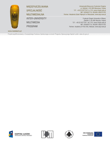 Modelowanie rzeczywistości w środowisku Pur eData Wstęp Celem zajęć jest pogłębienie i usystematyzowanie wiedzy dotyczącej interaktywnych projektów multimedialnych oraz utrwalenie umiejętności wykształconych podczas poprzednich trzech sesji poświęconych graficznym środowiskom obiektowym Max/MSP i Pd. Uczestnicy kursu wysłuchają omówienia szeregu zagadnień ilustrowanych przykładami działających projektów oraz samodzielnie zrealizują zestaw ćwiczeń. Ćwiczenia będą tak dobrane i pogrupowane, aby można było je powiązać w większe całości mające charakter mini-projektów. Dzięki temu osoby zainteresowane dogłębnym zrozumieniem tematu będą mogły zetknąć się z realnymi problemami, z podejmowaniem szczegółowych decyzji, od których zależą: poprawna struktura projektu, łatwość jego modyfikowania i rozszerzania, oraz przystosowanie go do wielokrotnego użycia w ramach większych projektów. Bardziej bezpośrednio, wykonanie poszczególnych ćwiczeń powinno przyczynić się do nabrania przez uczestników biegłości w operowaniu elementami środowiska Pd, definiowaniu abstrakcji i podschematów, posługiwaniu się argumentami i parametrami, łączeniu modułów siecią połączeń zdalnych, zapisywaniu prostych struktur sterujących, przechowywaniu danych w tablicach, inicjowaniu i konfigurowaniu działania projektu, dołączaniu do projektu prostego graficznego interfejsu wykonawczego itp. Ćwiczenia są przygotowane z nadzieją, że ukażą w nowym świetle pracę w otwartym środowisku obiektowym i pomogą przynajmniej częściowo uzasadnić wybór tego rodzaju środowiska do realizacji pewnych kategorii projektów artystycznych. Dlatego motywem przewodnim kursu jest interpretowanie tworzonych projektów jako modeli pełniących funkcje analogiczne do fizycznych lub percepcyjnych, rzeczywistych lub wymyślonych narzędzi, procesów lub zjawisk. Taka interpretacja uwydatnia uniwersalną przydatność środowisk obiektowych oraz w sposób naturalny nadaje projektom interaktywny charakter. Interakcja modelu z otoczeniem Wspólną cechą wszystkich modeli, z którymi będziemy mieli do czynienia, jest uczestniczenie w interakcji. Każdy model ma przypisaną określoną rolę i komunikuje się z otoczeniem ― jest aktorem. Otoczenie modelu jest zaś zbiorem innych aktorów, którymi mogą być ludzie lub modele działające razem z naszym modelem w tym samym programie, w tym samym komputerze, lub jedynie w tej samej sieci komputerowej. W wersji najprostszej model multimedialny imituje pewne narzędzie, np. instrument muzyczny, którym można sterować, i który generuje pewną treść multimedialną, np. sygnał foniczny. Taki model można nazwać reaktywnym, ponieważ jego sposób uczestniczenia w interakcji ogranicza się do reagowania na komunikaty sterujące docierające z otoczenia. Interakcja jest tu jednokierunkowa w tym znaczeniu, że istnieją dwa niesymetryczne, 2 jednokierunkowe kanały przepływu informacji. Schemat modelu reaktywnego można przedstawić na diagramie Rys. 1: Model jednokierunkowy (reaktywny) na którym są uwzględnione oba rodzaje połączeń: treść multimedialna, np. obraz lub dźwięk: kanał szerokopasmowy, synchronizowany; sterowanie: kanał wąskopasmowy, niesynchronizowany. Na powyższym oraz dwóch następnych diagramach są zaznaczone tylko te warstwy realizacji modelu, których nie powinno zabraknąć. Rzeczywiste modele zawierają również inne warstwy, specyficzne dla konkretnych zastosowań. Prosty model reaktywny można rozbudować do modelu przetwornika sygnału multimedialnego, który nazwiemy transaktywnym modelem multimedialnym, tj. takim, który zakłada, że aktorzy wymieniają się treścią multimedialną. Zasadą transaktywnej komunikacji z otoczeniem jest dwukierunkowy przepływ treści multimedialnej oraz jednokierunkowy przebieg sterowania ― model transaktywny nie kontroluje otoczenia. Ogólny schemat interfejsu oraz wewnętrznej struktury takiego modelu jest przedstawiony na poniższym diagramie. Rys. 2: Model 1,5-kierunkowy („transaktywny”) Pełny model interaktywny zawiera dodatkowo warstwę analizującą wejściowy sygnał multimedialny. Jest to model dwukierunkowy, który zakłada możliwość komunikacji całkowicie symetrycznej. Warstwa analizy sama w sobie stanowi pewnego rodzaju model „percepcyjny”, zaś warstwa przekształceń może działać według aktywnych reguł 3 imitacyjnych ― rozbudowany model interaktywny nie musi być tylko biernym przetwornikiem. Jego schemat jest przedstawiony poniżej. Rys. 3: Model dwukierunkowy (interaktywny) Przegląd zagadnień Tematy, które będą omówione podczas zajęć, należą do następujących obszarów: • modelowanie układu fizycznego w syntezie dźwięku (model instrumentu) oraz symulowanie ruchu w obrazie; • analiza i detekcja cech sygnału fonicznego (model słuchacza) oraz śledzenie ruchu w warstwie wizualnej; • planowanie wykonania, szeregowanie zadań, realizacja partytury (model wykonawcy); • randomizacja, imitacja (model improwizatora); • forma otwarta (model kompozytora). Tylko pierwszy z tych obszarów będzie eksplorowany w formie ćwiczeń wykonywanych samodzielnie przez uczestników kursu; wszystkich wymienionych elementów projektu nie sposób zrealizować w gronie początkujących użytkowników. Pozostałe zagadnienia będą jednak ilustrowane praktycznymi przykładami udostępnionymi uczestnikom w formie gotowych mini-projektów. Parametry modelu Ćwiczenia praktyczne zaczniemy od naszkicowania sposobu projektowania warstwy sterowania. Jeżeli pominiemy szczegóły realizacyjne, to przebieg sterowania działaniem modelu możemy sprowadzić do odbieranego przez model strumienia komunikatów zmieniających, bezpośrednio lub pośrednio, wartości parametrów modelu. Są dwa rodzaje parametrów zmienianych bezpośrednio: niezależne od innych parametry wejściowe (z perspektywy modelu są to wartoś