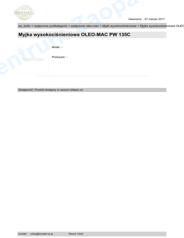 Z a p o a Utworzono : 07 marzec 2017 aa_bufor > wyłączone podkategorie > wyłączone oleo-mac > Myjki wysokociśnieniowe > Myjka wysokociśnieniowa OLEO m u r t n e Myjka wysokociśnieniowa OLEO-MAC PW 135C Model : - No image Producent : - Dostępność: Produkt dostępny w naszym sklepie od kontakt : - [email protected] Strona 1/{nb}