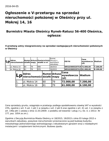 2016-04-05 Ogłoszenie o V-przetargu na sprzedaż nieruchomości położonej w Oleśnicy przy ul. Mokrej 14, 16 Burmistrz Miasta Oleśnicy Rynek-Ratusz 56-400 Oleśnica, ogłasza: V-przetarg ustny nieograniczony na sprzedaż następujących nieruchomości położonych w Oleśnicy Lp Numer Adres Numer Arkusz Powierzchnia Decyzji o nieruchomości działki mapy działki w m2 warunkach zabudowy KW Nr 1. ul. Mokra 14 60 79 998 18/2015 WR1E/00052075/9 72.000,00 7.200,00 2. ul. Mokra 16 61 79 878 19/2015 WR1E/00052074/2 61.000,00 6.100,00 Cena wywoławcza Wadium (zł) Lp Cena Adres Numer Arkusz wywoławcza Wadium nieruchomości działki mapy (zł) 1. ul. Mokra 14 60 79 72.000,00 7.200,00 2. ul. Mokra 16 61 79 61.000,00 6.100,00 Cena sprzedaży gruntu, osiągnięta w przetargu podlega opodatkowaniu stawką VAT w wysokości 23%, zgodnie z art. 5 ust. 1 pkt 1 w związku z art. 2 pkt 6 oraz zgodnie z art. 41 ust. 1 w związku z art. 146a pkt 1 ustawy z dnia 11.03.2004r. o podatku od towarów i usług ( t.j. Dz. U. z 2011r. Nr 177, poz. 1054 ze zm.). Zgodnie z Decyzją Burmistrza Miasta Oleśnicy nr 18/2015, 19/2015 z dnia 03 lutego 2015 o warunkach zabudowy, powyższe nieruchomości przeznaczone są pod budowę budynku mieszkalnego jednorodzinnego wolnostojącego z wbudowanym garażem wraz z niezbędnymi instalacjami i urządzeniami technicznymi. Budowa zjazdu. Działka nr 60 posiada kształt zbliżony do trapezu prostokątnego i charakteryzuje się dogodnym ukształtowaniem terenu. Teren działki niezagospodarowany, porośnięty bujną roślinnością trawiastą, krzewami, samosiejkami drzew oraz zdziczałymi drzewami owocowymi. Nad południową częścią działki przebiega napowietrzna linia energetyczna wsparta na słupie zlokalizowanym we wschodnim narożniku działki. Działka nr 61 posiada kształt pięciokąta dogodnego do zagospodarowania i charakteryzuje się dogodnym ukształtowaniem terenu. Teren działki niezagospodarowany, porośnięty bujną roślinnością trawiastą, krzewami, samosiejkami drzew oraz zdziczałymi drzewami owocowymi. Nad południową częścią działki przebiega napowietrzna linia energetyczna wsparta na słupie zlokalizowanym w południowej części działki. W sąsiedztwie działek przebiegają instalacje: elektryczna, wodna, kanalizacyjna i telefoniczna. Dojazd do działek możliwy z drogi o nawierzchni asfaltowej. Powyższe nieruchomości są wolne od innych obciążeń i nie są przedmiotem zobowiązań. Przetarg na wyżej wymienioną nieruchomość, odbędzie się dnia 10 maja2016 r. o godz. 1045 (w Sali Narad – pokój nr 5 na parterze Urzędu Miasta). Najpóźniej do dnia 5 maja 2016r. na konto Urzędu Miasta Oleśnicy nr 18 9584 0008 2001 0000 0055 0004 w Banku Spółdzielczym w Oleśnicy należy wpłacić wadium w gotówce. Terminy przeprowadzenia poprzednich przetargów: I-przetarg w dniu 13.08.2015r., II-przetarg w dniu 22.10.2015r., III-przetarg w dniu 29.12.2015r. IV-przetarg w dniu 10.03.2016r. Uwaga: Za termin wpłaty wadium za pośrednictwem banku uważa się datę wpływu środków na rachunek bankowy Urzędu Miasta Oleśnicy. Wpłacone wadium zostanie zaliczone na poczet ceny nabycia nieruchomości osobie wygrywającej przetarg lub zwrócone najpóźniej w ciągu 3 dni od dnia przetargu, jeżeli osoba wpłacająca nie wygra przetargu. Wadium nie podlega zwrotowiw razie uchylenia się wygrywającego od zawarcia umowy sprzedaży. Wylicytowana cena sprzedaży działki gruntu płatna jest w gotówce przed zawarciem aktu notarialnego. Wygrywający przetarg pokrywa koszty związane ze zbyciem nieruchomości tj. koszty notarialne i sądowe. Zastrzega się prawo odwołania przetargu w uzasadnionym przypadku. Dodatkowe informacje można uzyskać w Wydziale Geodezji, Gospodarki Gruntami, Rolnictwa i Ochrony Środowiska Urzędu Miasta Oleśnicy ( pok. 103, I p. ) lub telefonicznie pod nr (071) 798-21-54 w godz. od 800 do 1600.