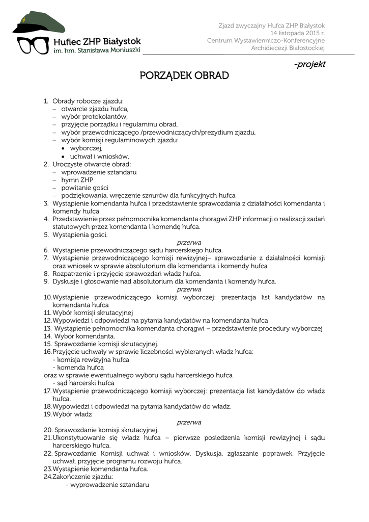 Zjazd zwyczajny Hufca ZHP Białystok 14 listopada 2015 r. Centrum Wystawienniczo-Konferencyjne Archidiecezji Białostockiej PORZĄDEK OBRAD -projekt 1. Obrady robocze zjazdu: – otwarcie zjazdu hufca, – wybór protokolantów, – przyjęcie porządku i regulaminu obrad, – wybór przewodniczącego /przewodniczących/prezydium zjazdu, – wybór komisji regulaminowych zjazdu: wyborczej, uchwał i wniosków, 2. Uroczyste otwarcie obrad: – wprowadzenie sztandaru – hymn ZHP – powitanie gości – podziękowania, wręczenie sznurów dla funkcyjnych hufca 3. Wystąpienie komendanta hufca i przedstawienie sprawozdania z działalności komendanta i komendy hufca 4. Przedstawienie przez pełnomocnika komendanta chorągwi ZHP informacji o realizacji zadań statutowych przez komendanta i komendę hufca. 5. Wystąpienia gości. przerwa 6. Wystąpienie przewodniczącego sądu harcerskiego hufca. 7. Wystąpienie przewodniczącego komisji rewizyjnej– sprawozdanie z działalności komisji oraz wniosek w sprawie absolutorium dla komendanta i komendy hufca 8. Rozpatrzenie i przyjęcie sprawozdań władz hufca. 9. Dyskusje i głosowanie nad absolutorium dla komendanta i komendy hufca. przerwa 10. Wystąpienie przewodniczącego komisji wyborczej: prezentacja list kandydatów na komendanta hufca 11. Wybór komisji skrutacyjnej 12. Wypowiedzi i odpowiedzi na pytania kandydatów na komendanta hufca 13. Wystąpienie pełnomocnika komendanta chorągwi – przedstawienie procedury wyborczej 14. Wybór komendanta. 15. Sprawozdanie komisji skrutacyjnej. 16. Przyjęcie uchwały w sprawie liczebności wybieranych władz hufca: - komisja rewizyjna hufca - komenda hufca oraz w sprawie ewentualnego wyboru sądu harcerskiego hufca - sąd harcerski hufca 17. Wystąpienie przewodniczącego komisji wyborczej: prezentacja list kandydatów do władz hufca. 18. Wypowiedzi i odpowiedzi na pytania kandydatów do władz. 19. Wybór władz przerwa 20. Sprawozdanie komisji skrutacyjnej. 21. Ukonstytuowanie się władz hufca – pierwsze posiedzenia komisji rewizyjnej i sądu harcerskiego hufca. 22. Sprawozdanie Komisji uchwał i wniosków. Dyskusja, zgłaszanie poprawek. Przyjęcie uchwał, przyjęcie programu rozwoju hufca. 23. Wystąpienie komendanta hufca. 24.Zakończenie zjazdu: - wyprowadzenie sztandaru Zjazd zwyczajny Hufca ZHP Białystok 14 listopada 2015 r. Centrum Wystawienniczo-Konferencyjne Archidiecezji Białostockiej - “Bratnie słowo”