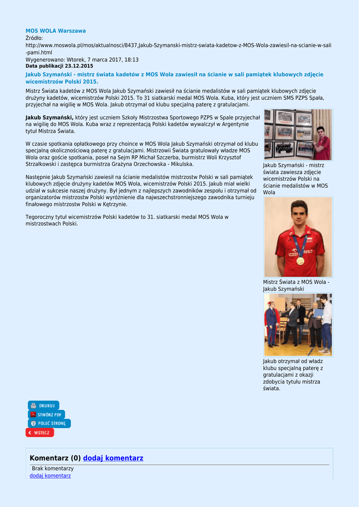 MOS WOLA Warszawa Źródło: http://www.moswola.pl/mos/aktualnosci/8437,Jakub-Szymanski-mistrz-swiata-kadetow-z-MOS-Wola-zawiesil-na-scianie-w-sali -pami.html Wygenerowano: Wtorek, 7 marca 2017, 18:13 Data publikacji 23.12.2015 Jakub Szymański - mistrz świata kadetów z MOS Wola zawiesił na ścianie w sali pamiątek klubowych zdjęcie wicemistrzów Polski 2015. Mistrz Świata kadetów z MOS Wola Jakub Szymański zawiesił na ścianie medalistów w sali pamiątek klubowych zdjęcie drużyny kadetów, wicemistrzów Polski 2015. To 31 siatkarski medal MOS Wola. Kuba, który jest uczniem SMS PZPS Spała, przyjechał na wigilię w MOS Wola. Jakub otrzymał od klubu specjalną paterę z gratulacjami. Jakub Szymański, który jest uczniem Szkoły Mistrzostwa Sportowego PZPS w Spale przyjechał na wigilię do MOS Wola. Kuba wraz z reprezentacją Polski kadetów wywalczył w Argentynie tytuł Mistrza Świata. W czasie spotkania opłatkowego przy choince w MOS Wola Jakub Szymański otrzymał od klubu specjalną okolicznościową paterę z gratulacjami. Mistrzowii Świata gratulowały władze MOS Wola oraz goście spotkania, poseł na Sejm RP Michał Szczerba, burmistrz Woli Krzysztof Strzałkowski i zastępca burmistrza Grażyna Orzechowska - Mikulska. Jakub Szymański - mistrz świata zawiesza zdjęcie Następnie Jakub Szymański zawiesił na ścianie medalistów mistrzostw Polski w sali pamiątek wicemistrzów Polski na klubowych zdjęcie drużyny kadetów MOS Wola, wicemistrzów Polski 2015. Jakub miał wielki ścianie medalistów w MOS udział w sukcesie naszej drużyny. Był jednym z najlepszych zawodników zespołu i otrzymał od Wola organizatorów mistrzostw Polski wyróżnienie dla najwszechstronniejszego zawodnika turnieju finałowego mistrzostw Polski w Kętrzynie. Tegoroczny tytuł wicemistrzów Polski kadetów to 31. siatkarski medal MOS Wola w mistrzostwach Polski. Mistrz Świata z MOS Wola Jakub Szymański Jakub otrzymał od władz klubu specjalną paterę z gratulacjami z okazji zdobycia tytułu mistrza świata. Komentarz (0) dodaj komentarz Brak komentarzy dodaj komentarz