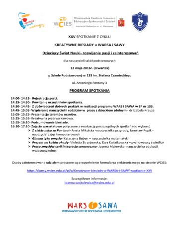 XXV SPOTKANIE Z CYKLU KREATYWNE BIESIADY u WARSA i SAWY Dziecięcy Świat Nauki- rozwijanie pasji i zainteresowań dla nauczycieli szkół podstawowych 12 maja 2016r. (czwartek) w Szkole Podstawowej nr 133 im. Stefana Czarnieckiego ul. Antoniego Fontany 3 PROGRAM SPOTKANIA 14:00- 14:15- Rejestracja gości. 14:15- 14:30- Powitanie uczestników spotkania. 14:30- 14:45- Z doświadczeń dobrych praktyk w realizacji programu WARS i SAWA w SP nr 133. 14:45- 15:05- Wspieranie nauczycieli i rodziców w pracy z dzieckiem zdolnym- dr Izabela Krauze 15:05- 15:25- Prezentacja talentów uczniów. 15:25- 15:55- Kreatywna przerwa kawowa. 15:55- 16:10- Podsumowanie biesiady. 16:10- 17:10- Zajęcia warsztatowe połączone z ewaluacją poszczególnych spotkań (do wyboru): Z elektroniką za Pan brat- Aneta Mikulska -nauczycielka przyrody, Jarosław Popik nauczyciel zajęć komputerowych Gimnastyka umysłu- Katarzyna Bęben – nauczycielka matematyki Prezent na każdą okazję- Violetta Strzyżewska, Ewa Kwiatkowska –wychowawcy świetlicy Praca zmysłów czyli integracja sensoryczna- Joanna Majewska- nauczycielka edukacji wczesnoszkolnej Osoby zainteresowane udziałem proszone są o wypełnienie formularza elektronicznego na stronie WCIES: https://kursy.wcies.edu.pl/pl/a/Kreatywne-biesiady-u-WARSA-i-SAWY-spotkanie-XXV Szczegółowe informacje: [email protected]