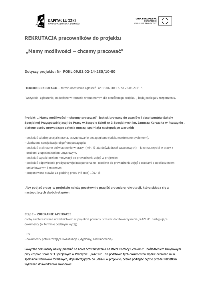 REKRUTACJA pracowników do projektu „Mamy możliwości – chcemy pracować” Dotyczy projektu: Nr POKL.09.01.02-24-280/10-00 TERMIN REKRUTACJI – termin nadsyłania zgłoszeń od 13.06.2011 r. do 28.06.2011 r. Wszystkie zgłoszenia, nadesłane w terminie wyznaczonym dla określonego projektu , będą podlegały rozpatrzeniu. Projekt „ Mamy możliwości – chcemy pracować” jest skierowany do uczniów i absolwentów Szkoły Specjalnej Przysposabiającej do Pracy w Zespole Szkół nr 3 Specjalnych im. Janusza Korczaka w Pszczynie , dlatego osoby prowadzące zajęcia muszą spełniają następujące warunki: - posiadać wiedzę specjalistyczną, przygotowanie pedagogiczne (udokumentowane dyplomem), - ukończona specjalizacja oligofrenopedagogika - posiadać praktyczne doświadczenie w pracy (min. 5 lata doświadczeń zawodowych) – jako nauczyciel w pracy z osobami z upośledzeniem umysłowym. - posiadać wysoki poziom motywacji do prowadzenia zajęć w projekcie; - posiadać odpowiednie predyspozycje interpersonalne i osobiste do prowadzenia zajęć z osobami z upośledzeniem umiarkowanym i znacznym. - proponowana stawka za godzinę pracy (45 min) 100.- zł Aby podjąć pracę w projekcie należy pozytywnie przejść procedurę rekrutacji, która składa się z następujących dwóch etapów: Etap I – ZBIERANIE APLIKACJI osoby zainteresowane uczestnictwem w projekcie powinny przesłać do Stowarzyszenia „RAZEM” następujące dokumenty (w terminie podanym wyżej) - CV - dokumenty potwierdzające kwalifikacje ( dyplomy, zaświadczenia) Powyższe dokumenty należy przesłać na adres Stowarzyszenia na Rzecz Pomocy Uczniom z Upośledzeniem Umysłowym przy Zespole Szkół nr 3 Specjalnych w Pszczynie „RAZEM” . Na podstawie tych dokumentów będzie oceniane m.in. spełnianie warunków formalnych, dopuszczających do udziału w projekcie, ocenie podlegać będzie przede wszystkim wykazane doświadczenia zawodowe. Do udziału w kolejnym Etapie rekrutacji (spotkania z Komisją Rekrutacyjną) zostaną zaproszone osoby, które przejdą ocenę formalną i uzyskają najwięcej punktów w trakcie oceny merytorycznej. Etap II – SPOTKANIA Z KOMISJĄ REKRUTACYJNĄ Etap ten polega na spotkaniu kandydata z członkami Komisji Rekrutacyjnej. Proces rekrutacji i selekcji podsumowany zostanie protokołem na podstawie ostatecznych wyników kandydatów. Do udziału w projekcie zakwalifikowane zostaną osoby, które uzyskają najwyższą liczbę punktów. W sytuacji gdy dwie osoby będą miały identyczny wynik, a udział w projekcie będzie mogła wziąć tylko jedna z nich (wyczerpanie liczby miejsc), zadecyduje data wpłynięcia CV. Wyniki rekrutacji ogłoszone zostaną na tablicy informacyjnej w siedzibie Stowarzyszenia Zał. Nr 1 Karta oceny kandydata Zał. Nr 2 Protokół Projekt jest współfinansowany ze środków Unii Europejskiej w ramach Europejskiego Funduszu Społecznego.