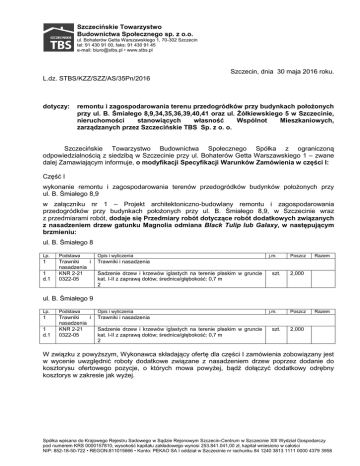 Szczecińskie Towarzystwo Budownictwa Społecznego sp. z o.o. ul. Bohaterów Getta Warszawskiego 1, 70-302 Szczecin tel: 91 430 91 00, faks: 91 430 91 45 e-mail: [email protected] • www.stbs.pl Szczecin, dnia 30 maja 2016 roku. L.dz. STBS/KZZ/SZZ/AS/35Pn/2016 dotyczy: remontu i zagospodarowania terenu przedogródków przy budynkach położonych przy ul. B. Śmiałego 8,9,34,35,36,39,40,41 oraz ul. Żółkiewskiego 5 w Szczecinie, nieruchomości stanowiących własność Wspólnot Mieszkaniowych, zarządzanych przez Szczecińskie TBS Sp. z o. o. Szczecińskie Towarzystwo Budownictwa Społecznego Spółka z ograniczoną odpowiedzialnością z siedzibą w Szczecinie przy ul. Bohaterów Getta Warszawskiego 1 – zwane dalej Zamawiającym informuje, o modyfikacji Specyfikacji Warunków Zamówienia w części I: Część I wykonanie remontu i zagospodarowania terenów przedogródków budynków położonych przy ul. B. Śmiałego 8,9 w załączniku nr 1 – Projekt architektoniczno-budowlany remontu i zagospodarowania przedogródków przy budynkach położonych przy ul. B. Śmiałego 8,9, w Szczecinie wraz z przedmiarami robót, dodaje się Przedmiary robót dotyczące robót dodatkowych związanych z nasadzeniem drzew gatunku Magnolia odmiana Black Tulip lub Galaxy, w następującym brzmieniu: ul. B. Śmiałego 8 Lp. Podstawa Opis i wyliczenia 1 Trawniki i nasadzenia KNR 2-21 0322-05 Trawniki i nasadzenia 1 d.1 Sadzenie drzew i krzewów iglastych na terenie płaskim w gruncie kat. I-II z zaprawą dołów; średnica/głębokość: 0,7 m 2 j.m. szt. Poszcz Razem 2,000 ul. B. Śmiałego 9 Lp. Podstawa Opis i wyliczenia 1 Trawniki i nasadzenia KNR 2-21 0322-05 Trawniki i nasadzenia 1 d.1 Sadzenie drzew i krzewów iglastych na terenie płaskim w gruncie kat. I-II z zaprawą dołów; średnica/głębokość: 0,7 m 2 j.m. szt. Poszcz Razem 2,000 W związku z powyższym, Wykonawca składający ofertę dla części I zamówienia zobowiązany jest w wycenie uwzględnić roboty dodatkowe związane z nasadzeniem drzew poprzez dodanie do kosztorysu ofertowego pozycje, o których mowa powyżej, bądź dołączyć dodatkowy odrębny kosztorys w zakresie jak wyżej. Spółka wpisana do Krajowego Rejestru Sadowego w Sądzie Rejonowym Szczecin-Centrum w Szczecinie XIII Wydział Gospodarczy pod numerem KRS 0000157810, wysokość kapitału zakładowego wynosi 253.841.041,00 zł, kapitał wniesiono w całości NIP: 852-18-50-722 • REGON:811015666 • Konto: PEKAO SA I oddział w Szczecinie nr rachunku 84 1240 3813 1111 0000 4379 3958