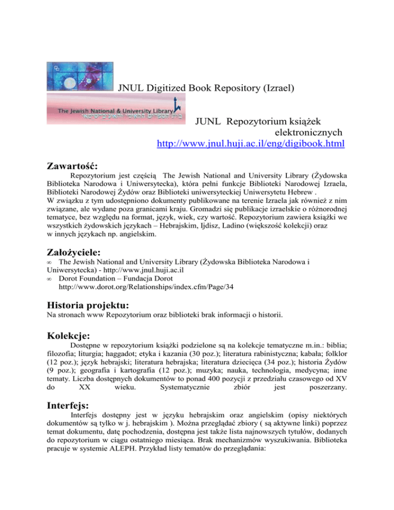 JNUL Digitized Book Repository (Izrael) JUNL Repozytorium ksiąŜek elektronicznych http://www.jnul.huji.ac.il/eng/digibook.html Zawartość: Repozytorium jest częścią The Jewish National and University Library (śydowska Biblioteka Narodowa i Uniwersytecka), która pełni funkcje Biblioteki Narodowej Izraela, Biblioteki Narodowej śydów oraz Biblioteki uniwersyteckiej Uniwersytetu Hebrew . W związku z tym udostępniono dokumenty publikowane na terenie Izraela jak równieŜ z nim związane, ale wydane poza granicami kraju. Gromadzi się publikacje izraelskie o róŜnorodnej tematyce, bez względu na format, język, wiek, czy wartość. Repozytorium zawiera ksiąŜki we wszystkich Ŝydowskich językach – Hebrajskim, Ijdisz, Ladino (większość kolekcji) oraz w innych językach np. angielskim. ZałoŜyciele: • The Jewish National and University Library (śydowska Biblioteka Narodowa i Uniwersytecka) - http://www.jnul.huji.ac.il • Dorot Foundation – Fundacja Dorot http://www.dorot.org/Relationships/index.cfm/Page/34 Historia projektu: Na stronach www Repozytorium oraz biblioteki brak informacji o historii. Kolekcje: Dostępne w repozytorium ksiąŜki podzielone są na kolekcje tematyczne m.in.: biblia; filozofia; liturgia; haggadot; etyka i kazania (30 poz.); literatura rabinistyczna; kabała; folklor (12 poz.); język hebrajski; literatura hebrajska; literatura dziecięca (34 poz.); historia śydów (9 poz.); geografia i kartografia (12 poz.); muzyka; nauka, technologia, medycyna; inne tematy. Liczba dostępnych dokumentów to ponad 400 pozycji z przedziału czasowego od XV do XX wieku. Systematycznie zbiór jest poszerzany. Interfejs: Interfejs dostępny jest w języku hebrajskim oraz angielskim (opisy niektórych dokumentów są tylko w j. hebrajskim ). MoŜna przeglądać zbiory ( są aktywne linki) poprzez temat dokumentu, datę pochodzenia, dostępna jest takŜe lista najnowszych tytułów, dodanych do repozytorium w ciągu ostatniego miesiąca. Brak mechanizmów wyszukiwania. Biblioteka pracuje w systemie ALEPH. Przykład listy tematów do przeglądania: Źródło: http://www.jnul.huji.ac.il/dl/books/html/bk_sub.htm [2007 06 07] Matadane: Repozytorium wykorzystuje format MARC; dane o dokumencie moŜna równieŜ oglądać w formie karty katalogowej. Źródło: http://aleph500.huji.ac.il/F/CUKF78E3S1MIAIILDJA7HIUDECBS89K5KLAS3YRF7P33C PHMK3-00090?func=full-set-set&set_number=021315&set_entry=000001&format=037 [2007 06 07] Źródło: http://aleph500.huji.ac.il/F/CUKF78E3S1MIAIILDJA7HIUDECBS89K5KLAS3YRF7P33C PHMK3-00254?func=full-set-set&set_number=021315&set_entry=000001&format=001 [2007 06 07] Format zasobów: Dokumenty dostępne są tylko w formacie djvu. Źródło: http://jnul.huji.ac.il/dl/books/djvu/17683792/index.djvu?djvuopts&thumbnails=yes&zoom=page [2007 06 07] Źródła: http://www.jnul.huji.ac.il/eng/digibook.html http://www.dorot.org/Relationships/index.cfm/Page/34 Anna Kawalec Kraków 2007 06 07 Zgadzam się na publikację pracy w sieci Internet.