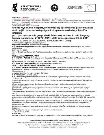 Ogłoszenie powiązane: Ogłoszenie nr 93172-2011 z dnia 2011-04-27 r. Ogłoszenie o zamówieniu - Milicz 1. Oznaczenie wg Wspólnego Słownika Zamówień: CPV - 71241000-9 - studia wykonalności, usługi doradcze, analizy. 2. Przedmiotem Zamówienia jest usługa polegająca na wykonaniu ekspertyzy dotyczącej sprawdzenia prawidłowości realizacji... Termin składania ofert: 2011-05-06 Milicz: Wykonanie ekspertyzy dotyczącej sprawdzenia prawidłowości realizacji i realności osiągnięcia i utrzymania zakładanych celów projektu pn. Uporządkowanie gospodarki ściekowej w zlewni rzeki Baryczy. Numer ogłoszenia: 219670 - 2011; data zamieszczenia: 28.07.2011 OGŁOSZENIE O UDZIELENIU ZAMOWIENIA - Usługi Zamieszczanie ogłoszenia: obowiązkowe. Ogłoszenie dotyczy: zamowienia publicznego. Czy zamówienie było przedmiotem ogłoszenia w Biuletynie Zamówień Publicznych: tak, numer ogłoszenia w BZP: 93172 - 2011r. Czy w Biuletynie Zamówień Publicznych zostało zamieszczone ogłoszenie o zmianie ogłoszenia: nie. SEKCJA I: ZAMAWIAJĄCY I. 1) NAZWA I ADRES: Przedsiębiorstwo Gospodarki Komunalnej "Dolina Baryczy" Sp. z o.o., ul. Rynek 21, 56-300 Milicz, woj. dolnośląskie, tel. 071 3840987, faks 071 3840987. I. 2) RODZAJ ZAMAWIAJĄCEGO: Podmiot prawa publicznego. SEKCJA II: PRZEDMIOT ZAMÓWIENIA II.1) Nazwa nadana zamówieniu przez zamawiającego: Wykonanie ekspertyzy dotyczącej sprawdzenia prawidłowości realizacji i realności osiągnięcia i utrzymania zakładanych celow projektu pn. Uporządkowanie gospodarki ściekowej w zlewni rzeki Baryczy.. II.2) Rodzaj zamówienia: Usługi. II.3) Określenie przedmiotu zamówienia: 1. Oznaczenie wg Wspolnego Słownika Zamowień: CPV 71241000-9 - studia wykonalności, usługi doradcze, analizy. 2. Przedmiotem Zamowienia jest usługa polegająca na wykonaniu ekspertyzy dotyczącej sprawdzenia prawidłowości realizacji i realności osiągnięcia i utrzymania zakładanych celow projektu pn. Uporządkowanie gospodarki ściekowej w zlewni rzeki Baryczy. 3. Opracowanie będące przedmiotem Zamowienia Wykonawca sporządzi w 4 egzemplarzach - w wersji papierowej i elektronicznej ( w programie Word oraz tabele zestawieniowe w programie Excel) na płycie CD. 4. Ekspertyza wykonana będzie w celu przeanalizowania moŜliwości zwiększenia poziomu dotacji ze środkow Funduszu Spojności UE w projekcie pn. Uporządkowanie gospodarki ściekowej w zlewni rzeki Baryczy. 5. Zakres zamowienia: 5.1. Weryfikacja poprawności przyjętych załoŜeń i prognoz finansowych w dokumentacji projektowej szczegolnie w odniesieniu do kosztow oczekiwanych przychodow oraz analizy finansowej. NaleŜy rownieŜ dokonać oceny analizy kosztow i http://bzp0.portal.uzp.gov.pl/index.php?ogloszenie=show&pozycja=21... 1 z 3 2011-07-28 08:31 Część NR: 1 Nazwa: Wykonanie ekspertyzy dotyczącej sprawdzenia prawidłowości realizacji i realności osiągnięcia i ___________________________________________________________________________________ Przedsiębiorstwo Gospodarki Komunalnej „Dolina Baryczy” sp. z o.o. Adres: 56-300 Milicz, Rynek 21 tel/fax 71 38 40 987 www.pgkdolinabaryczy.pl email: [email protected] Sąd Rejonowy Wrocław – Fabryczna KRS 0000255485, Kapitał zakładowy- 58 605 000,00 zł Konto B.S. Milicz 49 9582 0000 2000 0011 5414 0001, NIP: 916-13-54-050 utrzymania zakładanych celow projektu pn. Uporządkowanie gospodarki ściekowej w zlewni rzeki Baryczy. korzyści (CBA) oaz analizy ryzyka. Weryfikacja ma na celu potwierdzenie prawidłowości lub skorygowanie pierwotnych danych. 5.2. Weryfikacja prawidłowości realizacji projektu, poprzez sprawdzenie w szczegolności: a) Zgodności realizowanego zakresu rzeczowego projektu z umową o dofinansowanie (w tym wiarygodności części sprawozdawczych wnioskow o płatność z zakresem rzeczowym projektu); b) Kwalifikowalności wydatkow poniesionych w projekcie; c) Terminowości realizacji haromonogramu rzeczowego; d) Terminowości i kompletności rozliczania środkow finansowych w projekcie; e) Zmian dokonanych w projekcie; f) Poprawności postępowań o udzielenie zamowienia publicznego; g) Poprawności prowadzenia ewidencji księgowej projektu, ktora powinna umoŜliwić identyfikację poszczegolnych operacji finansowych i księgowych dokonywanych w ramach projektu; h) Posiadania i stosowania przez Beneficjenta procedur wewnętrznych niezbędnych do zarządzania i realizacji Projektu, a w szczegolności ścieŜki audytu w zakresie finansowo księgowym, zapewniającej rzetelne i terminowe dokumentowanie realizowanych operacji; i) Poprawności stosowania przepisow w zakresie informacji i promocji w projekcie; j) Poprawności archiwizacji dokumentacji; k) WdroŜenia zaleceń wynikających z przeprowadzonych audytow i kontroli. 5.3. Weryfikacja powodzenia realizacji projektu, szczegolnie w zakresie: a) MoŜliwości terminowego zakończenia projektu; b) Określenia problemow technicznych, finansowych lub prawnych; c) Realności osiągnięcia i utrzymania załoŜonych celow projektu, szczegolnie w zakresie wskaźnikow produktu i rezultatu (efektu ekologicznego). 5.4 Ekspertyza zawierać będzie rekomendacje i propozycje działań dla Beneficjenta w zakresie dalszej realizacji Projektu. II.4) Wspólny Słownik Zamówień (CPV): 71.24.10.00-9. SEKCJA III: PROCEDURA III.1) TRYB UDZIELENIA ZAMÓWIENIA: Przetarg nieograniczony III.2) INFORMACJE ADMINISTRACYJNE Zamówienie dotyczy projektu/programu finansowanego ze środków Unii Europejskiej: tak, projekt/program: Zamawiający realizuje projekt pn. Uporządkowanie gospodarki ściekowej w zlewni rzeki Baryczy, wspołfinansowany ze środkow Unii Europejskiej w ramach Programu Operacyjnego Infrastruktura i Środowisko na lata 2007-2013, Priorytet 1, Działanie 1.1 Gospodarka wodno - ściekowa w aglomeracjach powyŜej 15 000 RLM.. SEKCJA IV: UDZIELENIE ZAMÓWIENIA IV.1) DATA UDZIELENIA ZAMÓWIENIA: 10.05.2011. IV.2) LICZBA OTRZYMANYCH OFERT: 1. IV.3) LICZBA ODRZUCONYCH OFERT: 0. 