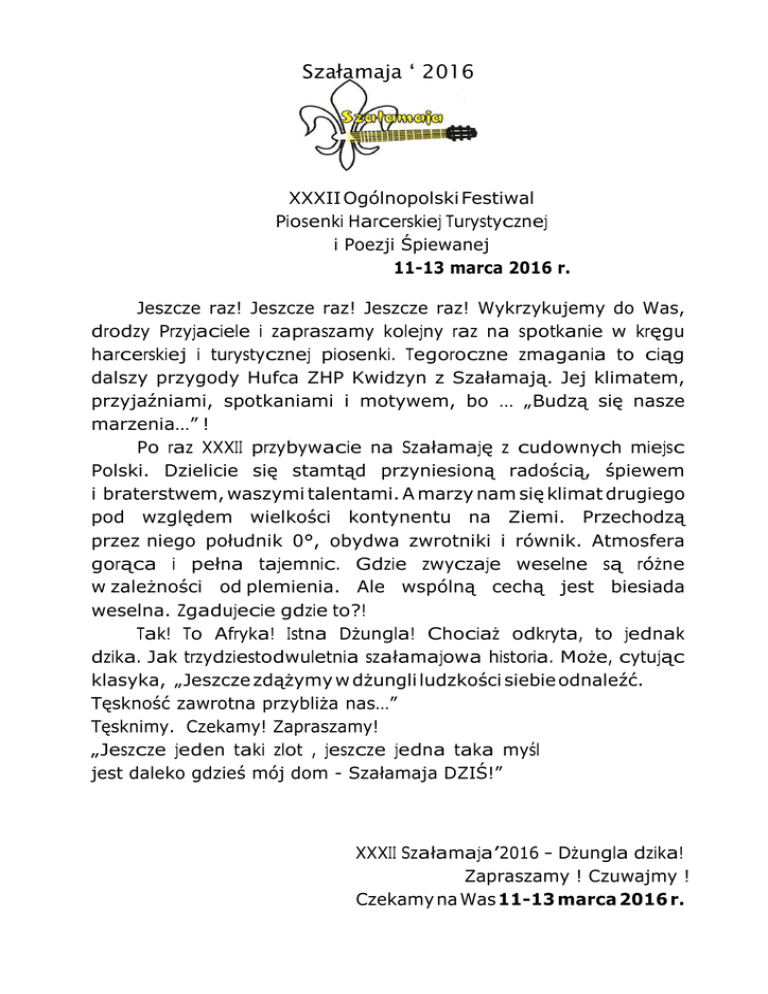 Szałamaja ‘ 2016 XXXII Ogólnopolski Festiwal Piosenki Harcerskiej Turystycznej i Poezji Śpiewanej 11-13 marca 2016 r. Jeszcze raz! Jeszcze raz! Jeszcze raz! Wykrzykujemy do Was, drodzy Przyjaciele i zapraszamy kolejny raz na spotkanie w kręgu harcerskiej i turystycznej piosenki. Tegoroczne zmagania to ciąg dalszy przygody Hufca ZHP Kwidzyn z Szałamają. Jej klimatem, przyjaźniami, spotkaniami i motywem, bo … „Budzą się nasze marzenia…” ! Po raz XXXII przybywacie na Szałamaję z cudownych miejsc Polski. Dzielicie się stamtąd przyniesioną radością, śpiewem i braterstwem, waszymi talentami. A marzy nam się klimat drugiego pod względem wielkości kontynentu na Ziemi. Przechodzą przez niego południk 0°, obydwa zwrotniki i równik. Atmosfera gorąca i pełna tajemnic. Gdzie zwyczaje weselne są różne w zależności od plemienia. Ale wspólną cechą jest biesiada weselna. Zgadujecie gdzie to?! Tak! To Afryka! Istna Dżungla! Chociaż odkryta, to jednak dzika. Jak trzydziestodwuletnia szałamajowa historia. Może, cytując klasyka, „Jeszcze zdążymy w dżungli ludzkości siebie odnaleźć. Tęskność zawrotna przybliża nas…” Tęsknimy. Czekamy! Zapraszamy! „Jeszcze jeden taki zlot , jeszcze jedna taka myśl jest daleko gdzieś mój dom - Szałamaja DZIŚ!” XXXII Szałamaja’2016 – Dżungla dzika! Zapraszamy ! Czuwajmy ! Czekamy na Was 11-13 marca 2016 r. Szczegóły u Szefowej Biura dh Grażynki: e-mail [email protected] oraz www.kwidzynzhp.pl, FB Hufiec ZHP Kwidzyn im. Kwidzyniaków SZCZEGÓŁY REGULAMINOWE Cele: • Pielęgnacja harcerskich korzeni i wzbogacenie harcerskich tradycji i obyczajów. • Popularyzacja dobrej piosenki. • Zapoznanie z Powiślańskimi Urokami Kultury, Turystyki, Historii. • Inspirowanie młodych wykonawców do dalszych poszukiwań i udoskonaleń warsztatu. • Bogacenie swojego repertuaru i zbioru śpiewnikowego. • Konfrontacja swoich umiejętności wokalnych i muzycznych z umiejętnościami innych. • Wspólne przeżycie wielu wspaniałych chwil w gronie przyjaciół. • Integracja środowisk twórczych – poeci, turyści, mieszkańcy, harcerze, młodzież niepełnosprawna ... Organizator • Komenda Hufca Związku Harcerstwa Polskiego im. Kwidzyniaków w Kwidzynie Współorganizator • Burmistrz Miasta Kwidzyna • Starosta Kwidzyński • • Kwidzyńskie Centrum Kultury Młodzieżowy Ośrodek Wychowawczy w Kwidzynie • Szkoła Podstawowa nr 4 w Kwidzynie • Zespół Szkół Ponadgimnazjalnych nr 1 w Kwidzynie • Zespół Szkół Specjalnych w Kwidzynie Termin Festiwal odbędzie się w dniach 11-13 marca 2016 r. Warunki uczestnictwa 1. Uczestnicy festiwalu biorą udział w dwóch kategoriach ze względu na liczbę śpiewających osób: • zespoły (za zespół uważa się ilość wykonawców śpiewających powyżej 2 osób), • soliści i duety (osoby śpiewające) 2. Uczestnicy prezentują po 2 utwory, których czas wykonywania nie może przekroczyć 10 minut /łącznie z przygotowaniem/. 3. Jury będzie oceniało odrębnie kategorię solistów i duety oraz zespoły w 3 kategoriach: I piosenka harcerska zespoły harcerskie soliści i duety II Nieprzetarty Szlak – harcerze NS oraz osoby niezrzeszone z placówek kształcenia specjalnego zespoły soliści i duety III piosenka turystyczna i poezja śpiewana zespoły soliści i duety 4. W kategorii piosenki turystycznej i poezji śpiewanej jedna jednostka (szkoła, dom kultury, hufiec, stowarzyszenie, fundacja itp.) może zgłosić maksymalnie 5 solistów w wieku od 14 lat. 5. Jury będzie oceniało: • • dobór repertuaru, emisję głosu, intonację i dykcję, • ogólny wyraz artystyczny. 6. Organizatorzy nie przyjmują zgłoszeń bez podania repertuaru. Repertuar nie może być zmieniony w dniu przyjazdu. 7. Organizatorzy zwracają się do wykonawców, aby dobierali piosenki zgodne z duchem i nazwą Festiwalu Piosenki Harcerskiej, Turystycznej i Poezji Śpiewanej. Festiwal nie ma na celu propagowania piosenki estradowej, operowej, rozrywkowej czy popularnej. 8. Organizatorzy zastrzegają sobie w razie dużej ilości zgłoszeń wykonawców wykonanie tylko jednej piosenki. 9. Mogą również gościć u nas zorganizowane grupy obserwatorów. 10. Zespół, grupa, soliści, obserwatorzy - zgłoszeni przez Komendy Hufca, Szkoły, Domy Kultury, Ośrodki Szkolno-Wychowawcze, Domy Dziecka, Młodzieżowe Ośrodki Wychowawcze, Stowarzyszenia i Fundacje - przyjeżdżają pod opieką pełnoletniego opiekuna. 11. Na imprezie obowiązują zasady zawarte w Prawie Harcerskim, Kodeksie Ucznia, Karcie Turysty, a przede wszystkim nie wolno palić papierosów i pić napojów alkoholowych. 12. Wykonawcy sami zapewniają sobie akompaniament. 13. W nieprzekraczalnym terminie do 25 lutego 2016 r. należy przesłać zgłoszenie uczestników festiwalu na załączonych pod podany adres (Tylko drogą pocztową ): Komenda Hufca ZHP XXXII Szałamaja’2016 ul. Warszawska 14 82-500 KWIDZYN kartkach, tel.609 627 606, [email protected] Nieprzetarty Szlak - tel.505 044 144, [email protected] 14. Wpisowe w wysokości 12 zł od osoby: soliści, członkowie zespołów i obserwatorzy należy wpłacić w Biurze Festiwalu. Z wpisowego zwolnieni są opiekunowie. Wpłaty należy dokonać w dniu przyjazdu w Biurze Festiwalu – Teatr Miejski w Kwidzynie ul. Katedralna 5. Na Laureatów czekają CENNE NAGRODY. 15. Przewidywany program Piątek 11 marca 2016 r. 14.00 –16.00 - Próby mikrofonowe – Teatr Miejski w Kwidzynie 14.00 – 16.00 – Zakwaterowanie – wskazane szkoły 17.00 – 17.30 - XXXII Szałamaja’ 2016 – Otwarcie FESTIWALU 17.30 – 18.30 – ZMAGANIA NIEPRZETARTEGO SZLAKU 18.30 – 20.00 - DZIEŃ HARCERSKI 21.00– GWIAZDA FESTIWALU Sobota 12 marca 2016 r. 8.00 – 10.00 – Próby mikrofonowe 9.30 - 10.15 - Msza Święta w kościele p.w. św Jana Ewangelisty KATEDRA – poświęcenie nowego sztandaru 10.15 - 11.00 – Uroczyste wręczenie sztandaru Hufcowi ZHP im. Kwi