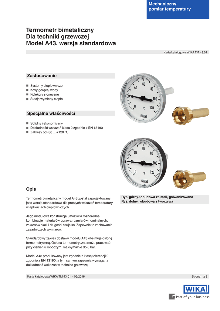 Mechaniczny pomiar temperatury Termometr bimetaliczny Dla techniki grzewczej Model A43, wersja standardowa Karta katalogowa WIKA TM 43.01 Zastosowanie ■■ Systemy ciepłownicze ■■ Kotły gorącej wody ■■ Kolekory słoneczne ■■ Stacje wymiany ciepła Specjalne właściwości ■■ Solidny i ekonomiczny ■■ Dokładność wskazań klasa 2 zgodnie z EN 13190 ■■ Zakresy od -30 ... +120 °C Opis Termometr bimetaliczny model A43 został zaprojektowany jako wersja standardowa dla prostych wskazań temperatury w aplikacjach ciepłowniczych. Rys. górny.: obudowa ze stali, galwanizowana Rys. dolny.: obudowa z tworzywa Jego modułowa konstrukcja umożliwia różnorodne kombinacje materiałów oprawy, rozmiarów nominalnych, zakresów skali i długości czujnika. Zapewnia to zachowanie zasadniczych wymiarów. Standardowy zakres dostawy modelu A43 obejmuje osłonę termometryczną. Osłona termometryczna może pracować przy ciśnieniu roboczym maksymalnie do 6 bar. Model A43 produkowany jest zgodnie z klasą tolerancji 2 zgodnie z EN 13190, a tym samym zapewnia wymaganą dokładność wskazań w technice grzewczej. Karta katalogowa WIKA TM 43.01 ∙ 05/2016 Strona 1 z 3 Wersja standardowa Element pomiarowy Spirala bimetaliczna Rozmiar nominalny 63, 80, 100 Opcje ■■ Inne zakresy skali ■■ Pokrywa wsuwana, niklowana ■■ Zdejmowana osłona termometryczna z mosiądzu ze śrubą ustalającą Zakres roboczy Pełny zakres skali Obudowa Model A43.10: aluminium Model A43.20: stal, galwanizowna Model A43.30: tworzywo, czarne Położenie przyłącza Back mount (BM), centre Przyłącze procesowe Osłona termometryczna G ½ B, stop miedzi Czujnik Aluminium Osłona termometryczna Stop miedzi Zdejmowalna, na docisk Dopuszczalne ciśnienie robocze przy osłonie termometrycznej Max. 6 bar Podzielnia Tworzywo, białe, czarne napisy Wskazówka Tworzywo, czarne Szyba NS 63: PS NS 80, 100: SAN Dokładność wskazań SW Regulacja zera W dolnej części czujnika Strona 2 z 3 Karta katalogowa WIKA TM 43.01 ∙ 05/2016 Wymiary w mm Model A43.30 NS Wymiary w mm 63 24 80 100 b1 Ød 14139341,01 14139341,01 Model A43.10, A43.20 11,5 ØD 63 (61,6 ... 62,2) l1 1) G SW 40, 60, 100 (opcjonalnie: 160) 24 11,5 1) 80 (78,6 ... 79,4) 40, 60, 100 24 11,5 1) 100 (98,6 ... 99,4) 40, 60, 100 (opcjonalnie: 160) G 1/2 B SW 21 (opcjonalnie: 160) G 1/2 B SW 21 G 1/2 B SW 21 05/2016 PL based on 03/2016 EN 1) Z l1 = 160: Ø d = 11.0 mm Informacje wymagane do zamówienia Model / Rozmiar nominalny / Zakres skali / Przyłącze procesowe / Długość l1 / Opcje © 2016 WIKA Alexander Wiegand SE & Co. Specyfikacje podane w niniejszym dokumencie przedstawiają stan konstrukcyjny w momencie publikacji. Zastrzegamy sobie prawo do wprowadzenia modyfikacji w specyfikacji i materiałach. Karta katalogowa WIKA TM 43.01 ∙ 05/2016 Strona 3 z 3 WIKA Polska spółka z ograniczoną odpowiedzialnością sp. k. ul. Łęgska 29/35, 87-800 Włocławek Tel.: (+48) 54 23 01 100 Fax: (+48) 54 23 01 101 [email protected] www.wikapolska.pl