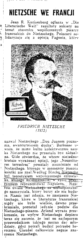 NIETZSCHE WE FRANCJI Jean R. Kuckcnburg ogłasza w „ D i e Literarische W e i l " rezultaty ankiety na temat stosunku współczesnych pisarzy francuskich d o Nietzschego. Poincare s o lidaryzuje się z opinją Fagueta, kfórv FRIEDRICH NIETZSCHE HH72) nazwa! Nietzschego „ D o n Juanem pozna nia, awanturnikiem ducha". Barbusse u. waza, że mimo kultu kolektywizmu nau ka Nietzschego nit przestała byc aktual na, Gide stwierdza, że wbrew niejedno krotnie w y r a ż o n e j opinji, jego ..Nourritu res terrestres" p o w s t a ł y niezależnie od Nietzschego, którego w momencie pisania książki nie znaŁW' edlug B l o c h a ^ i e i z s ą h e ^ byj^ teoretykiem wspùi czesnego c z l o w k ' ïca," S ^ ^ o T T â î S ^ ^ r o n L i i e ' | ~w -Iyeni„.'^D^^t!r J j c z n e m reprezcniowaT^Kapoieoa.^ Mąu' rois ùwàza i^el^eh^o^srTTi^&ëYpiecziiê go nauczyciela, k i o r y burzy ale nie budu; je. Massis jest zdania, że znaczenie N i e tzschego, które w literaturze francuskiej ; nigdy nie było wielkie, dawno p r z e ! brzmiało, p o z o s t a ł jedynie • p o d z i w dla ! Nietzschego^pisarza. A r l a n d wyraża prze| konanie, że w p ł y w Nietzschego d o p i e r o ' t e r a z się zacznie, że iest on najlepszym j przewodnikiem jakiego można dać m l o i dzieży, gdyż potrafi budzić potrzebę h e I roizmu. Claudel c a ł k o w i c i e neguje z n a i czenie Nietzschego. 1