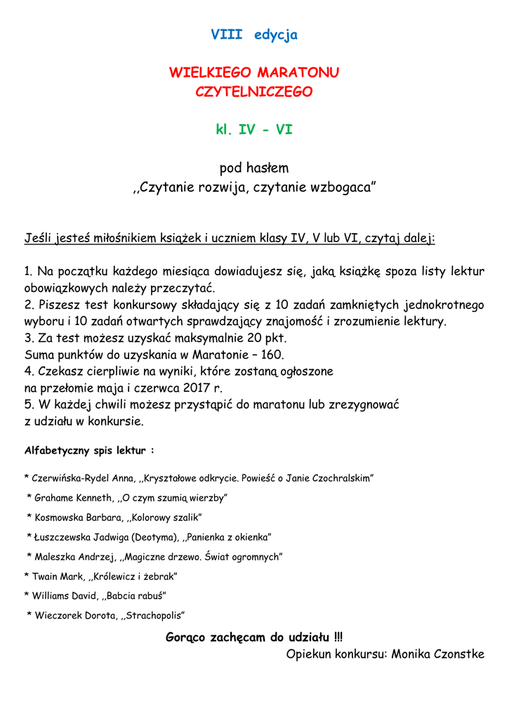 VIII edycja WIELKIEGO MARATONU CZYTELNICZEGO kl. IV - VI pod hasłem ,,Czytanie rozwija, czytanie wzbogaca” Jeśli jesteś miłośnikiem książek i uczniem klasy IV, V lub VI, czytaj dalej: 1. Na początku każdego miesiąca dowiadujesz się, jaką książkę spoza listy lektur obowiązkowych należy przeczytać. 2. Piszesz test konkursowy składający się z 10 zadań zamkniętych jednokrotnego wyboru i 10 zadań otwartych sprawdzający znajomość i zrozumienie lektury. 3. Za test możesz uzyskać maksymalnie 20 pkt. Suma punktów do uzyskania w Maratonie – 160. 4. Czekasz cierpliwie na wyniki, które zostaną ogłoszone na przełomie maja i czerwca 2017 r. 5. W każdej chwili możesz przystąpić do maratonu lub zrezygnować z udziału w konkursie. Alfabetyczny spis lektur : * Czerwińska-Rydel Anna, ,,Kryształowe odkrycie. Powieść o Janie Czochralskim” * Grahame Kenneth, ,,O czym szumią wierzby” * Kosmowska Barbara, ,,Kolorowy szalik” * Łuszczewska Jadwiga (Deotyma), ,,Panienka z okienka” * Maleszka Andrzej, ,,Magiczne drzewo. Świat ogromnych” * Twain Mark, ,,Królewicz i żebrak” * Williams David, ,,Babcia rabuś” * Wieczorek Dorota, ,,Strachopolis” Gorąco zachęcam do udziału !!! Opiekun konkursu: Monika Czonstke