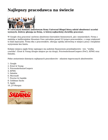 Najlepszy pracodawca na świecie W corocznym badaniu ankietowym firmy Universal Blogal biorą udział absolwenci uczelni wyższych, któtrzy głosują na firmę, w której najbardziej chcieliby pracować. W Google chcą pracować zarówno absolwenci kierunków biznesowych, jak i inżynierskich. Firma z siedzibą w kalifornijskim Mountain View zatrudnia ponad 52 tysiące pracowników, z czego większość to biali mężczyźni. Firma dba o pracowników, oferując opiekę zdrowotną w miejscu pracy i bezpłatne wyżywienie bez limitu. Kolejne miejsca zajęły firmy zajmujące się audytem finansowym przedsiębiorstw - tzw. "wielka czwórka": Ernst & Young (drugie miejsce po raz drugi), PricewaterhouseCoopers (PwC), KPMG oraz Deloitte. Pełne zestawienie dziesięciu najlepszych pracodawców - zdaniem tegorocznych absolwentów: 1. Google 2. Ernst & Young 3. PricewaterhouseCoopers 4. KPMG 5. Deloitte 6. Microsoft 7. Proctor & Gamble 8. Goldman Sachs 9. Apple 10. J.P.Morgan
