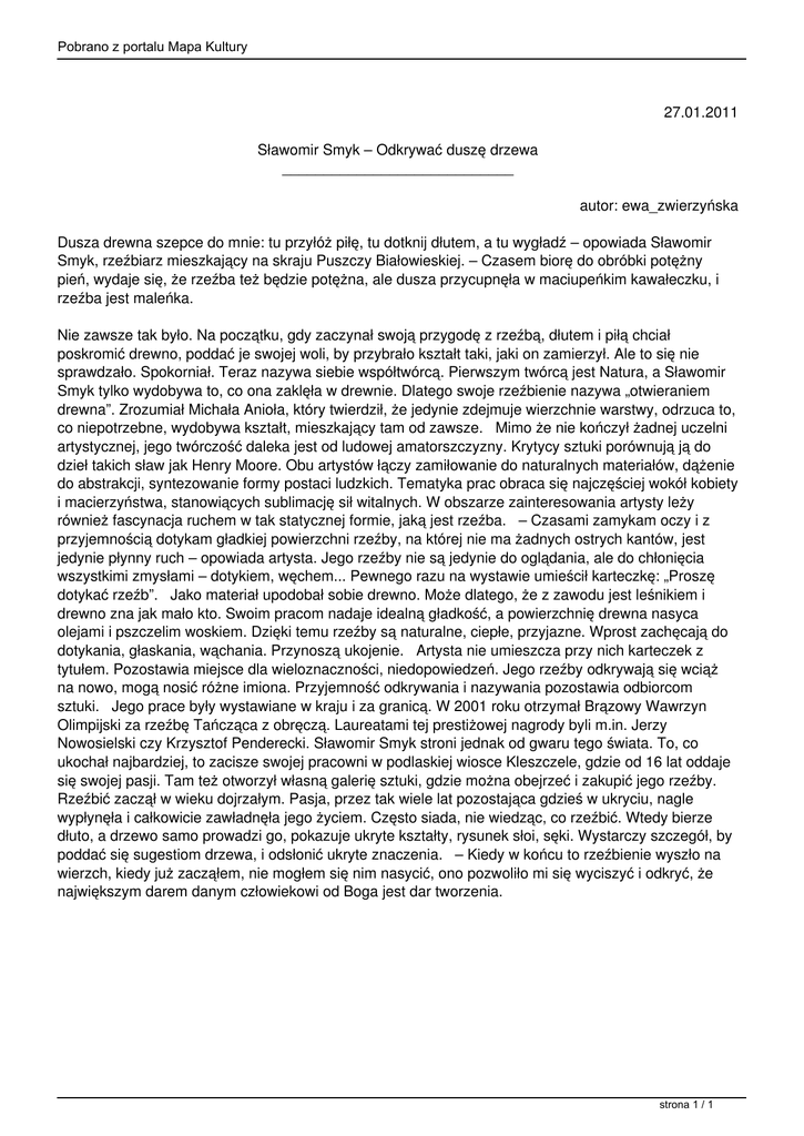 Pobrano z portalu Mapa Kultury 27.01.2011 Sławomir Smyk – Odkrywać duszę drzewa ____________________________ autor: ewa_zwierzyńska Dusza drewna szepce do mnie: tu przyłóż piłę, tu dotknij dłutem, a tu wygładź – opowiada Sławomir Smyk, rzeźbiarz mieszkający na skraju Puszczy Białowieskiej. – Czasem biorę do obróbki potężny pień, wydaje się, że rzeźba też będzie potężna, ale dusza przycupnęła w maciupeńkim kawałeczku, i rzeźba jest maleńka. Nie zawsze tak było. Na początku, gdy zaczynał swoją przygodę z rzeźbą, dłutem i piłą chciał poskromić drewno, poddać je swojej woli, by przybrało kształt taki, jaki on zamierzył. Ale to się nie sprawdzało. Spokorniał. Teraz nazywa siebie współtwórcą. Pierwszym twórcą jest Natura, a Sławomir Smyk tylko wydobywa to, co ona zaklęła w drewnie. Dlatego swoje rzeźbienie nazywa „otwieraniem drewna”. Zrozumiał Michała Anioła, który twierdził, że jedynie zdejmuje wierzchnie warstwy, odrzuca to, co niepotrzebne, wydobywa kształt, mieszkający tam od zawsze. Mimo że nie kończył żadnej uczelni artystycznej, jego twórczość daleka jest od ludowej amatorszczyzny. Krytycy sztuki porównują ją do dzieł takich sław jak Henry Moore. Obu artystów łączy zamiłowanie do naturalnych materiałów, dążenie do abstrakcji, syntezowanie formy postaci ludzkich. Tematyka prac obraca się najczęściej wokół kobiety i macierzyństwa, stanowiących sublimację sił witalnych. W obszarze zainteresowania artysty leży również fascynacja ruchem w tak statycznej formie, jaką jest rzeźba. – Czasami zamykam oczy i z przyjemnością dotykam gładkiej powierzchni rzeźby, na której nie ma żadnych ostrych kantów, jest jedynie płynny ruch – opowiada artysta. Jego rzeźby nie są jedynie do oglądania, ale do chłonięcia wszystkimi zmysłami – dotykiem, węchem... Pewnego razu na wystawie umieścił karteczkę: „Proszę dotykać rzeźb”. Jako materiał upodobał sobie drewno. Może dlatego, że z zawodu jest leśnikiem i drewno zna jak mało kto. Swoim pracom nadaje idealną gładkość, a powierzchnię drewna nasyca olejami i pszczelim woskiem. Dzięki temu rzeźby są naturalne, ciepłe, przyjazne. Wprost zachęcają do dotykania, głaskania, wąchania. Przynoszą ukojenie. Artysta nie umieszcza przy nich karteczek z tytułem. Pozostawia miejsce dla wieloznaczności, niedopowiedzeń. Jego rzeźby odkrywają się wciąż na nowo, mogą nosić różne imiona. Przyjemność odkrywania i nazywania pozostawia odbiorcom sztuki. Jego prace były wystawiane w kraju i za granicą. W 2001 roku otrzymał Brązowy Wawrzyn Olimpijski za rzeźbę Tańcząca z obręczą. Laureatami tej prestiżowej nagrody byli m.in. Jerzy Nowosielski czy Krzysztof Penderecki. Sławomir Smyk stroni jednak od gwaru tego świata. To, co ukochał najbardziej, to zacisze swojej pracowni w podlaskiej wiosce Kleszczele, gdzie od 16 lat oddaje się swojej pasji. Tam też otworzył własną galerię sztuki, gdzie można obejrzeć i zakupić jego rzeźby. Rzeźbić zaczął w wieku dojrzałym. Pasja, przez tak wiele lat pozostająca gdzieś w ukryciu, nagle wypłynęła i całkowicie zawładnęła jego życiem. Często siada, nie wiedząc, co rzeźbić. Wtedy bierze dłuto, a drzewo samo prowadzi go, pokazuje ukryte kształty, rysunek słoi, sęki. Wystarczy szczegół, by poddać się sugestiom drzewa, i odsłonić ukryte znaczenia. – Kiedy w końcu to rzeźbienie wyszło na wierzch, kiedy już zacząłem, nie mogłem się nim nasycić, ono pozwoliło mi się wyciszyć i odkryć, że największym darem danym człowiekowi od Boga jest dar tworzenia. strona 1 / 1