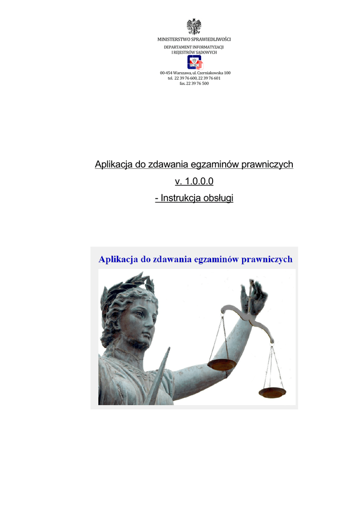 MINISTERSTWO SPRAWIEDLIWOŚCI DEPARTAMENT INFORMATYZACJI I REJESTRÓW SĄDOWYCH 00-454 Warszawa, ul. Czerniakowska 100 tel. 22 39 76 600, 22 39 76 601 fax. 22 39 76 500 Aplikacja do zdawania egzaminów prawniczych v. 1.0.0.0 - Instrukcja obsługi MINISTERSTWO SPRAWIEDLIWOŚCI DEPARTAMENT INFORMATYZACJI I REJESTRÓW SĄDOWYCH I. Wstęp Niniejsza instrukcja skierowana jest do zdających egzaminy prawnicze za pomocą komputerów w 2011 r. Aplikacja skierowana jest do zdających egzaminy: adwokacki, radcowski i notarialny w 2011 r. w rozumieniu ustawy z dnia 26 maja 1982 r. Prawo o adwokaturze (Dz. U. z 2009 Nr 146, poz. 1188 z późn. zm.), ustawy z dnia 6 lipca 1982 r. o radcach prawnych (Dz. U. z 2010 r. Nr 10, poz. 65 z późn. zm.) oraz ustawy z dnia 14 lutego 1991 r. - Prawo o notariacie (Dz. U. z 2008 r. Nr 189, poz. 1158 z późn. zm.). Minimalne wymagania jakie komputer zdającego powinien spełniać dla prawidłowego działania aplikacji: • procesor Pentium 1 GHz lub jego odpowiednik • 512 MB pamięci RAM (zalecane 1024MB) • system operacyjny: Windows XP SP3/Windows Vista/Windows 7 • zainstalowany program Microsoft .NET Framework 3.5 SP1 • 100 MB wolnego miejsca na dysku twardym komputera (HDD) • wolny port USB; • konto użytkownika o prawach administratora lokalnego do komputera; • wyłączony program antywirusowy; • wyłączony wygaszacz ekranu; Uwaga: Aplikacja nie może być uruchamiana na maszynach wirtualnych. Aplikacja do zdawania egzaminów prawniczych v 1.0.0.0 Copyright © 2011 r. Ministerstwo Sprawiedliwości 2 MINISTERSTWO SPRAWIEDLIWOŚCI DEPARTAMENT INFORMATYZACJI I REJESTRÓW SĄDOWYCH II. Schemat przeprowadzania egzaminów prawniczych w 2011 r. Aplikacja do zdawania egzaminów prawniczych v 1.0.0.0 Copyright © 2011 r. Ministerstwo Sprawiedliwości 3 MINISTERSTWO SPRAWIEDLIWOŚCI DEPARTAMENT INFORMATYZACJI I REJESTRÓW SĄDOWYCH III. III. Instrukcja obsługi 1. Po uruchomieniu komputera otrzymany od komisji nośnik należy włożyć do portu USB komputera. 2. System automatycznie zainstaluje otrzymany nośnik jako Dysk wymienny i nada mu kolejną wolną literę. Aplikacja do zdawania egzaminów prawniczych v 1.0.0.0 Copyright © 2011 r. Ministerstwo Sprawiedliwości 4 MINISTERSTWO SPRAWIEDLIWOŚCI DEPARTAMENT INFORMATYZACJI I REJESTRÓW SĄDOWYCH 3. Na otrzymanym nośniku znajduje się tylko jeden folder – AZEP, który należy otworzyć. 4. Uruchamiamy aplikację poprzez dwukrotnie kliknięcie na ikonę START.exe Aplikacja do zdawania egzaminów prawniczych v 1.0.0.0 Copyright © 2011 r. Ministerstwo Sprawiedliwości 5 MINISTERSTWO SPRAWIEDLIWOŚCI DEPARTAMENT INFORMATYZACJI I REJESTRÓW SĄDOWYCH 5. Po uruchomieniu aplikacji, w okienku „Podaj kod” wprowadzamy kod z koperty otrzymanej od Komisji egzaminacyjnej i zatwierdzamy go przez kliknięcie „OK” 6. Należy sprawdzić poprawność kodu który został wpisany i jeśli zgadza się z tym z koperty należy kliknąć „Tak” Aplikacja do zdawania egzaminów prawniczych v 1.0.0.0 Copyright © 2011 r. Ministerstwo Sprawiedliwości 6 MINISTERSTWO SPRAWIEDLIWOŚCI DEPARTAMENT INFORMATYZACJI I REJESTRÓW SĄDOWYCH 7. Funkcje aplikacji są pogrupowane w 10 sekcjach oznaczonych w niniejszej instrukcji literami A, B, C, D, E, F, G, H, I, J. a. W sekcji [A] znajdują się funkcje aplikacji używane w wypadku opuszczenia sali podczas trwania egzaminu. i. W przypadku opuszczenia sali egzaminacyjnej należy zgłosić to przewodniczącemu komisji oraz kliknąć na klawisz „OPUSZCZENIE SALI” ii. W momencie powrotu na salę egzaminacyjną należy zgłosić to przewodniczącemu komisji oraz kliknąć na klawisz „POWRÓT NA SALĘ” Aplikacja do zdawania egzaminów prawniczych v 1.0.0.0 Copyright © 2011 r. Ministerstwo Sprawiedliwości 7 MINISTERSTWO SPRAWIEDLIWOŚCI DEPARTAMENT INFORMATYZACJI I REJESTRÓW SĄDOWYCH b. W sekcji [B] znajduje się klawisz zakończenia egzaminu „KONIEC”. i. Klawisz „KONIEC” kończy działanie aplikacji i należy go kliknąć dopiero gdy jest się pewnym chęci zakończenia pisania egzaminu. Po kliknięciu klawisza „Tak” aplikacja automatycznie zapisuje pracę w formacie PDF, którą należy wydrukować na stanowiskach z dostępem do bazy aktów prawnych. c. W sekcji [C] znajduje się moduł zapisywania i wczytywania kopii zapasowych. W przypadku zaistnienia potrzeby odtworzenia pracy z kopii zapasowej należy zgłosić ten fakt komisji egzaminacyjnej. Aplikacja do zdawania egzaminów prawniczych v 1.0.0.0 Copyright © 2011 r. Ministerstwo Sprawiedliwości 8 MINISTERSTWO SPRAWIEDLIWOŚCI DEPARTAMENT INFORMATYZACJI I REJESTRÓW SĄDOWYCH d. W sekcji [D] znajduje się Log aplikacji ze wszystkimi zdarzeniami. e. W sekcji [E] znajdują się funkcje aplikacji pozwalające na edycje pisanego tekstu w zakresie: wyrównanie do lewej, centrowanie, wyrównanie do prawej, justowanie, punktowanie, numerowanie, utworzenie listy wielopoziomowej, zmniejszenie wcięcia, zwiększenie wcięcia. f. W sekcji [F] znajdują się funkcje aplikacji pozwalające na wstawienie podziału strony, wstawienie dowolnego symbolu z tablicy znaków specjalnych oraz znak paragrafu. g. W sekcji [G] znajdują się funkcje aplikacji pozwalające na edycje pisanego tekstu w zakresie: pogrubienie, pochylenie, podkreślenie, indeks dolny i indeks dolny. h. W sekcji [H] znajduje się funkcja Powiększania/Zmniejszania rozmiaru widoku strony i. W sekcji [I] znajduje się pole edycji tekstu. Aplikacja do zdawania egzaminów prawniczych v 1.0.0.0 Copyright © 2011 r. Ministerstwo Sprawiedliwości 9 MINISTERSTWO SPRAWIEDLIWOŚCI DEPARTAMENT INFORMATYZACJI I REJESTRÓW SĄDOWYCH j. W sekcji [J] znajdują się funkcje aplikacji pokazujące zegar komputera oraz czas liczony od momentu rozpoczęcia aplikacji. k. Aplikacja posiada ponadto wbudowane funkcje (działające tylko w ramach aplikacji): • „Kopiuj” – pod kombinacją klawiszy Ctrl+C • „Wklej” – pod kombinacją klawiszy Ctrl+V • 